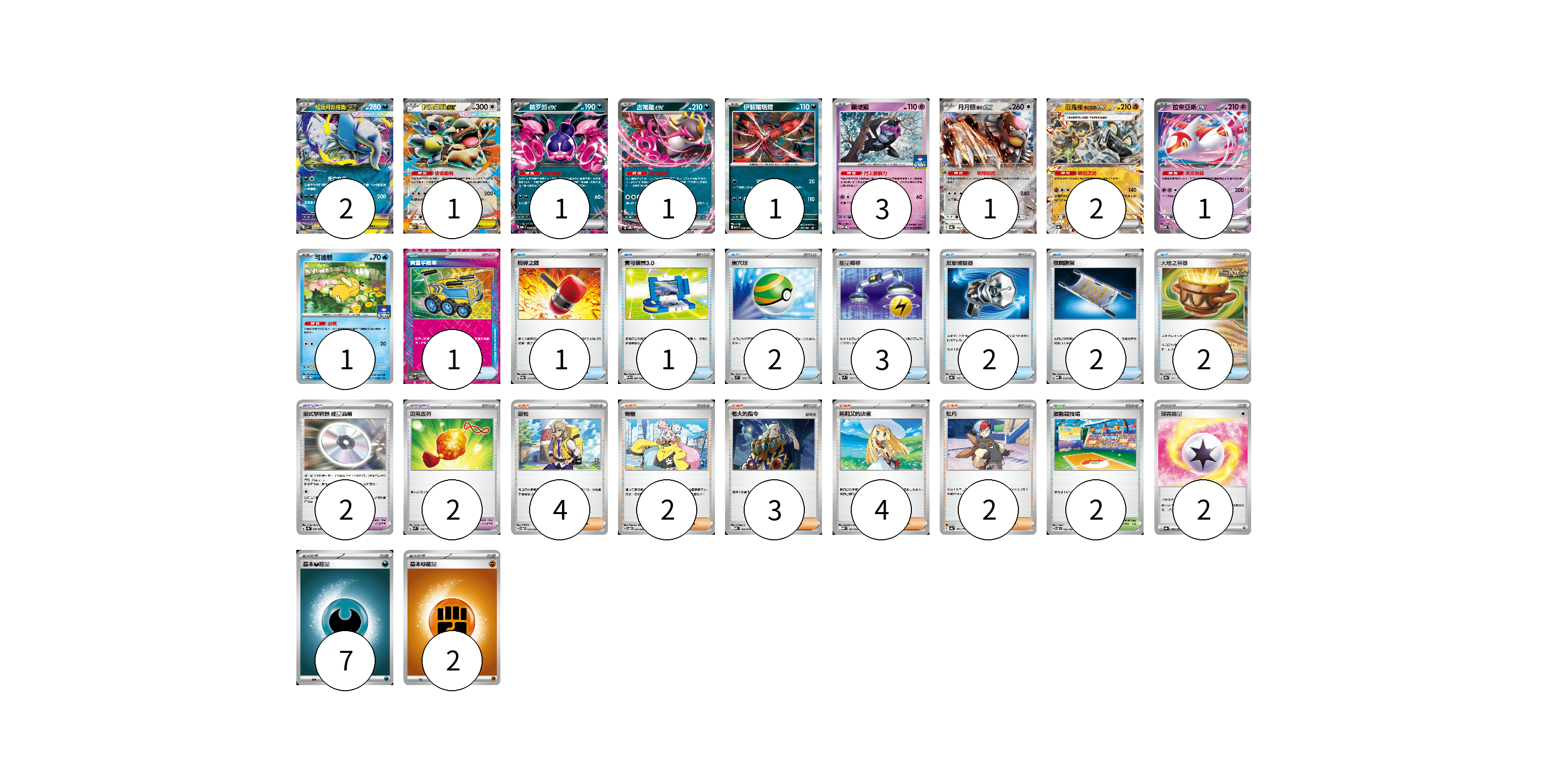 牌組構築方案 以此牌組為基礎新構築牌組 顯示卡面 顯示列表 寶可夢卡(14) 2 1 1 1 1 3 1 2 1 1 寶可夢道具(4) 2 2 物品卡(14) 1 1 1 2 3 2 2 2 支援者卡(15) 4 2 3 4 2 競技場卡(2) 2 能量卡(11) 2 7 2 寶可夢卡(14) 卡牌名稱 張數 卡牌名稱 張數 超級阿勃梭魯ex M1L 038/063 02 超級袋獸ex M1S 051/063 01 桃歹郎ex MBG 009/022 01 吉雉雞ex SVOD 004/020 01 伊裴爾塔爾 M1L 040/063 01 願增猿 M-P 014/M-P 03 月月熊 赫月ex SV8a 134/187 01 厄鬼椪 礎石面具ex SV8a 091/187 02 拉帝亞斯ex MBD 003/022 01 可達鴨 SV-P 220/SV-P 01 寶可夢道具(4) 卡牌名稱 張數 卡牌名稱 張數 招式學習器 能量渦輪 SV3a 056/062 02 勇氣護符 SVM 142/175 02 物品卡(14) 卡牌名稱 張數 卡牌名稱 張數 貴重手推車 SVK 020/042 01 粉碎之錘 SVQL 013/022 01 寶可裝置3.0 SV11B 081/086 01 巢穴球 SVM 133/175 02 能量轉移 SVM 127/175 03 反擊捕捉器 SV8a 139/187 02 夜間擔架 MBD 016/022 02 大地之容器 SV8a 143/187 02 支援者卡(15) 卡牌名稱 張數 卡牌名稱 張數 派帕 SVOD 018/020 04 奇樹 SVOD 016/020 02 老大的指令 MBD 020/022 03 莉莉艾的決意 MBD 021/022 04 牡丹 SV4a 182/190 02 競技場卡(2) 卡牌名稱 張數 卡牌名稱 張數 激動競技場 SV8 105/106 02 能量卡(11) 卡牌名稱 張數 卡牌名稱 張數 薄霧能量 SV8a 186/187 02 基本【惡】能量 MBG DAR 07 基本【鬥】能量 M-P FIG 02 以此牌組為基礎新構築牌組 牌組編碼 lekUAE-CmukDJ-YgaYsS copy 列印牌組單 牌組編碼已複製 分享至SNS
