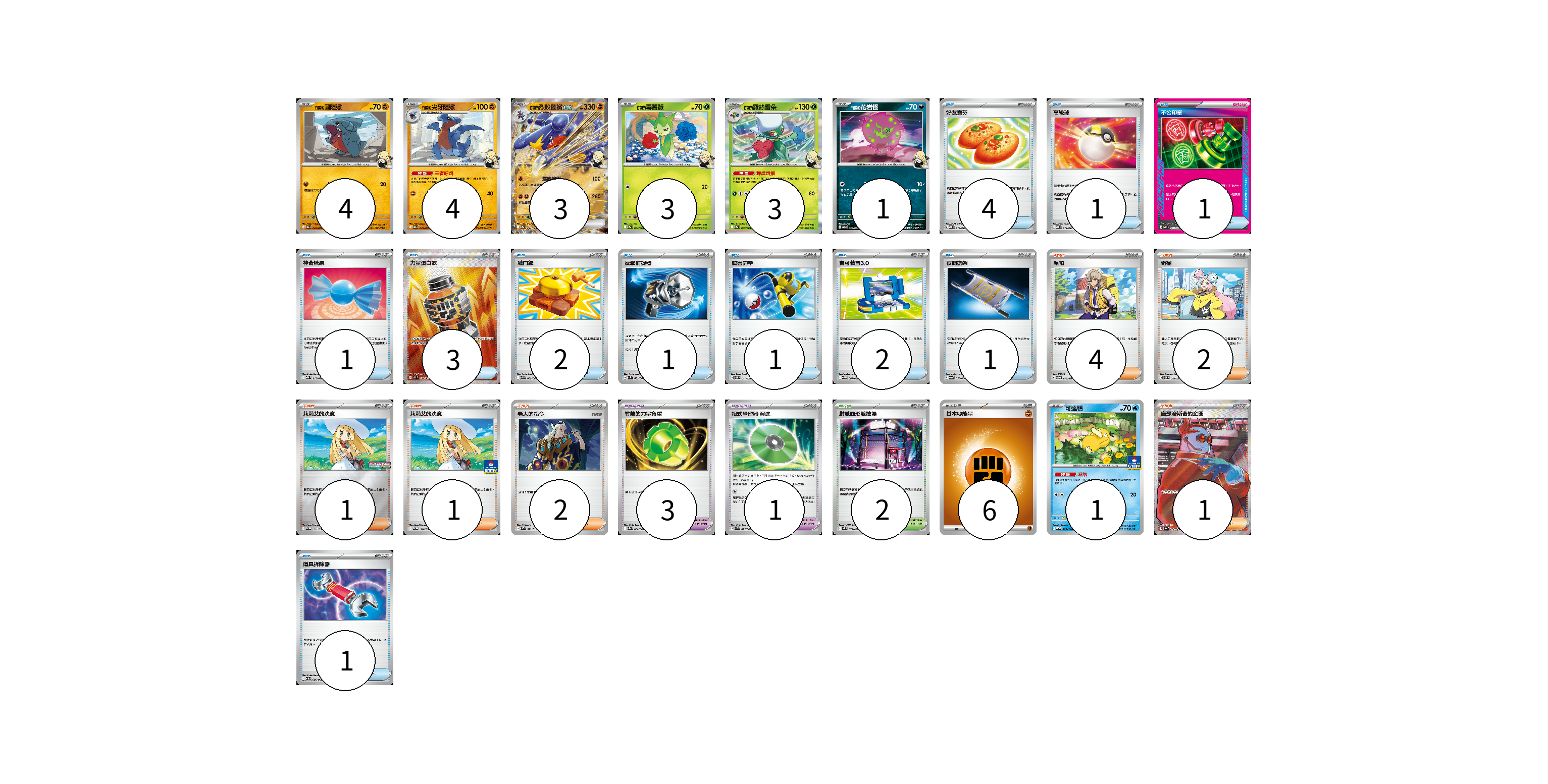 牌組構築方案 以此牌組為基礎新構築牌組 顯示卡面 顯示列表 寶可夢卡(19) 4 4 3 3 3 1 1 寶可夢道具(4) 3 1 物品卡(18) 4 1 1 1 3 2 1 1 2 1 1 支援者卡(11) 4 2 1 1 2 1 競技場卡(2) 2 能量卡(6) 6 寶可夢卡(19) 卡牌名稱 張數 卡牌名稱 張數 <竹蘭的>圓陸鯊 SV9a 042/063 04 <竹蘭的>尖牙陸鯊 SV9a 043/063 04 <竹蘭的>烈咬陸鯊ex SV9a 044/063 03 <竹蘭的>毒薔薇 SV9a 004/063 03 <竹蘭的>羅絲雷朵 SV9a 005/063 03 <竹蘭的>花岩怪 SV9a 050/063 01 可達鴨 SV-P 220/SV-P 01 寶可夢道具(4) 卡牌名稱 張數 卡牌名稱 張數 竹蘭的力量負重 SV9a 060/063 03 招式學習器 演進 SVK 025/042 01 物品卡(18) 卡牌名稱 張數 卡牌名稱 張數 好友寶芬 MBD 013/022 04 高級球 MBD 014/022 01 不公印章 MBD 011/022 01 神奇糖果 MBG 013/022 01 力量蛋白飲 M1L 081/063 03 戰鬥鑼 M1L 059/063 02 反擊捕捉器 SV4M 059/066 01 厲害釣竿 SVOM 011/021 01 寶可裝置3.0 SV11B 081/086 02 夜間擔架 SV6a 056/064 01 道具拆除器 SV11W 080/086 01 支援者卡(11) 卡牌名稱 張數 卡牌名稱 張數 派帕 SVOD 018/020 04 奇樹 SVOM 018/021 02 莉莉艾的決意 M-P 011/M-P 01 莉莉艾的決意 M-P 018/M-P 01 老大的指令 SVHM 022/022 02 庫瑟洛斯奇的企圖 SV6a 086/064 01 競技場卡(2) 卡牌名稱 張數 卡牌名稱 張數 對戰圓形競技場 M2 079/080 02 能量卡(6) 卡牌名稱 張數 卡牌名稱 張數 基本【鬥】能量 M-P FIG 06 以此牌組為基礎新構築牌組 牌組編碼 leklWy-hYxhki-vJCMBJ copy 列印牌組單 牌組編碼已複製 分享至SNS