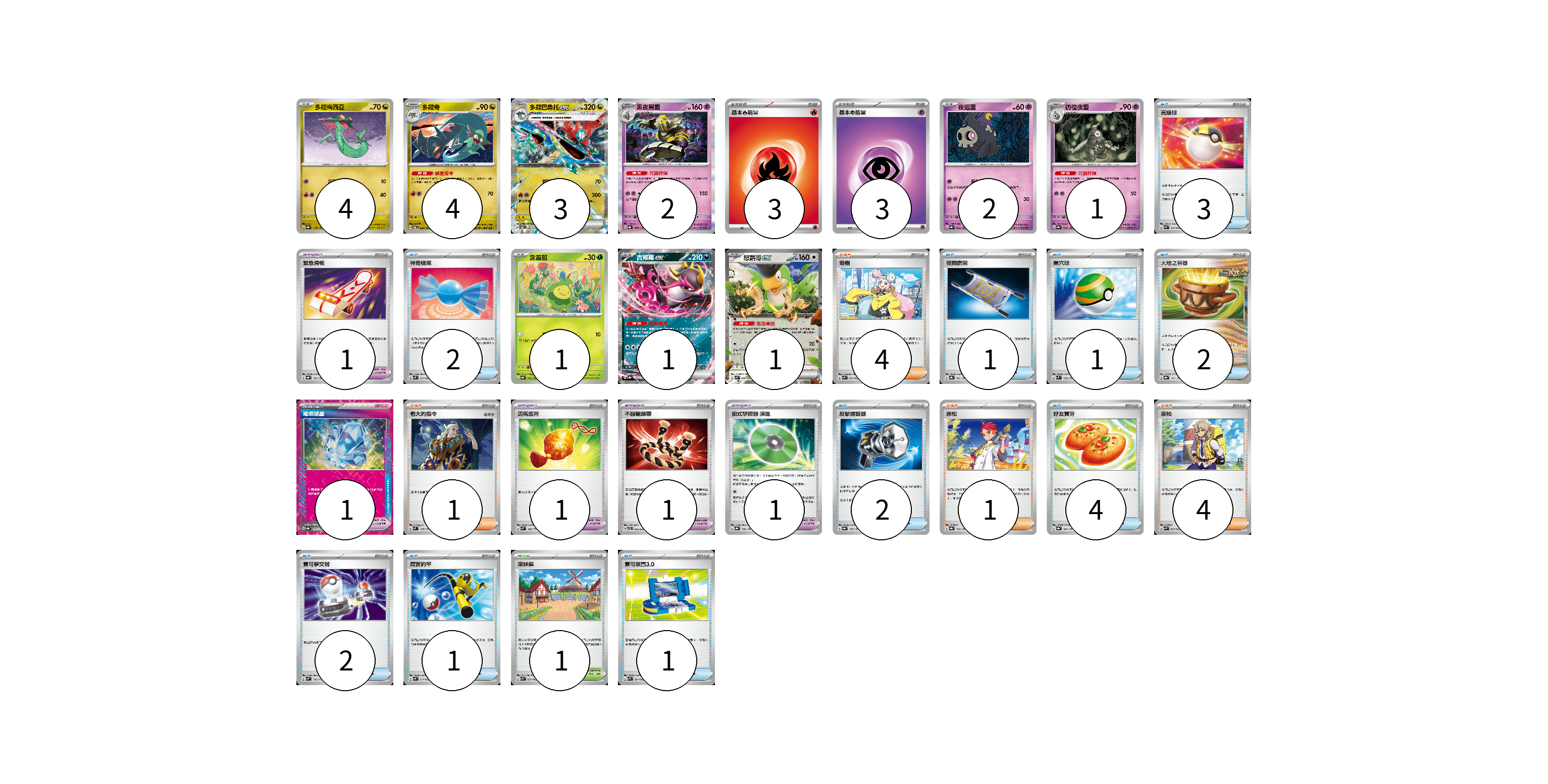 牌組構築方案 以此牌組為基礎新構築牌組 顯示卡面 顯示列表 寶可夢卡(19) 4 4 3 2 2 1 1 1 1 寶可夢道具(5) 1 1 1 1 1 物品卡(19) 3 2 1 1 2 2 4 2 1 1 支援者卡(10) 4 1 1 4 競技場卡(1) 1 能量卡(6) 3 3 寶可夢卡(19) 卡牌名稱 張數 卡牌名稱 張數 多龍梅西亞 SV8a 118/187 04 多龍奇 SV6 080/101 04 多龍巴魯托ex SV6 081/101 03 黑夜魔靈 SV8a 066/187 02 夜巡靈 SV8a 064/187 02 彷徨夜靈 SV8a 065/187 01 含羞苞 SV8a 001/187 01 吉雉雞ex SV8a 104/187 01 怒鸚哥ex SVK 006/042 01 寶可夢道具(5) 卡牌名稱 張數 卡牌名稱 張數 緊急滑板 SV8a 153/187 01 璀璨結晶 SV8a 152/187 01 勇氣護符 SVM 142/175 01 不服輸頭帶 SVTL 016/021 01 招式學習器 演進 SV8a 160/187 01 物品卡(19) 卡牌名稱 張數 卡牌名稱 張數 高級球 SVK 018/042 03 神奇糖果 SVK 019/042 02 夜間擔架 SV8a 151/187 01 巢穴球 SVM 133/175 01 大地之容器 SV8a 143/187 02 反擊捕捉器 SV8a 139/187 02 好友寶芬 SV8a 147/187 04 寶可夢交替 SVM 136/175 02 厲害釣竿 SVK 011/042 01 寶可裝置3.0 SVK 021/042 01 支援者卡(10) 卡牌名稱 張數 卡牌名稱 張數 奇樹 SVK 031/042 04 老大的指令 SVM 172/175 01 赤松 SV8a 163/187 01 派帕 SVK 035/042 04 競技場卡(1) 卡牌名稱 張數 卡牌名稱 張數 深缽鎮 SVK 039/042 01 能量卡(6) 卡牌名稱 張數 卡牌名稱 張數 基本【火】能量 SVD FIR 03 基本【超】能量 SVAW PSY 03 以此牌組為基礎新構築牌組 牌組編碼 levUcm-qwhkJr-MVUMct copy 列印牌組單 牌組編碼已複製 分享至SNS
