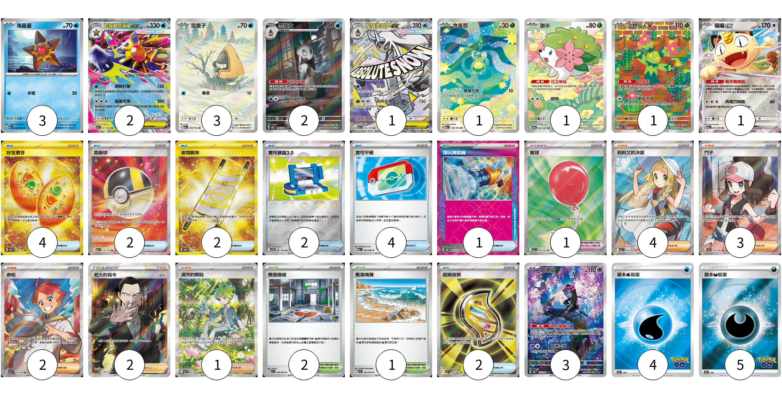 牌組構築方案 以此牌組為基礎新構築牌組 顯示卡面 顯示列表 寶可夢卡(18) 3 2 3 2 1 1 1 1 1 3 寶可夢道具(1) 1 物品卡(17) 4 2 2 2 4 1 2 支援者卡(12) 4 3 2 2 1 競技場卡(3) 2 1 能量卡(9) 4 5 寶可夢卡(18) 卡牌名稱 張數 卡牌名稱 張數 海星星 M3 020/080 03 超級寶石海星ex M3 021/080 02 雪童子 M2a 200/193 03 雪妖女 SV6 104/101 02 超級雪妖女ex M2a 224/193 01 含羞苞 M2a 196/193 01 謝米 SV9a 066/063 01 沙鈴仙人掌 SV9 101/100 01 喵喵ex M3 061/080 01 願增猿 SV6 107/101 03 寶可夢道具(1) 卡牌名稱 張數 卡牌名稱 張數 氣球 M1L 084/063 01 物品卡(17) 卡牌名稱 張數 卡牌名稱 張數 好友寶芬 SV6 133/101 04 高級球 M2a 216/193 02 夜間擔架 SV8 137/106 02 寶可裝置3.0 SV11B 081/086 02 寶可平板 M3 070/080 04 頂尖捕捉器 SV5M 062/071 01 超級信號 M1S 083/063 02 支援者卡(12) 卡牌名稱 張數 卡牌名稱 張數 莉莉艾的決意 M1L 086/063 04 鬥子 SV11W 166/086 03 赤松 SV7 123/102 02 老大的指令(坂木) SC1b 170/153 02 滿充的體貼 M1S 091/063 01 競技場卡(3) 卡牌名稱 張數 卡牌名稱 張數 險惡廢墟 M1L 063/063 02 衝浪海灘 M1S 062/063 01 能量卡(9) 卡牌名稱 張數 卡牌名稱 張數 基本水能量 S10b WAT 04 基本惡能量 S10b DAR 05 以此牌組為基礎新構築牌組 牌組編碼 lgIyQk-SPxuiK-AJWgBm copy 列印牌組單 牌組編碼已複製 分享至SNS