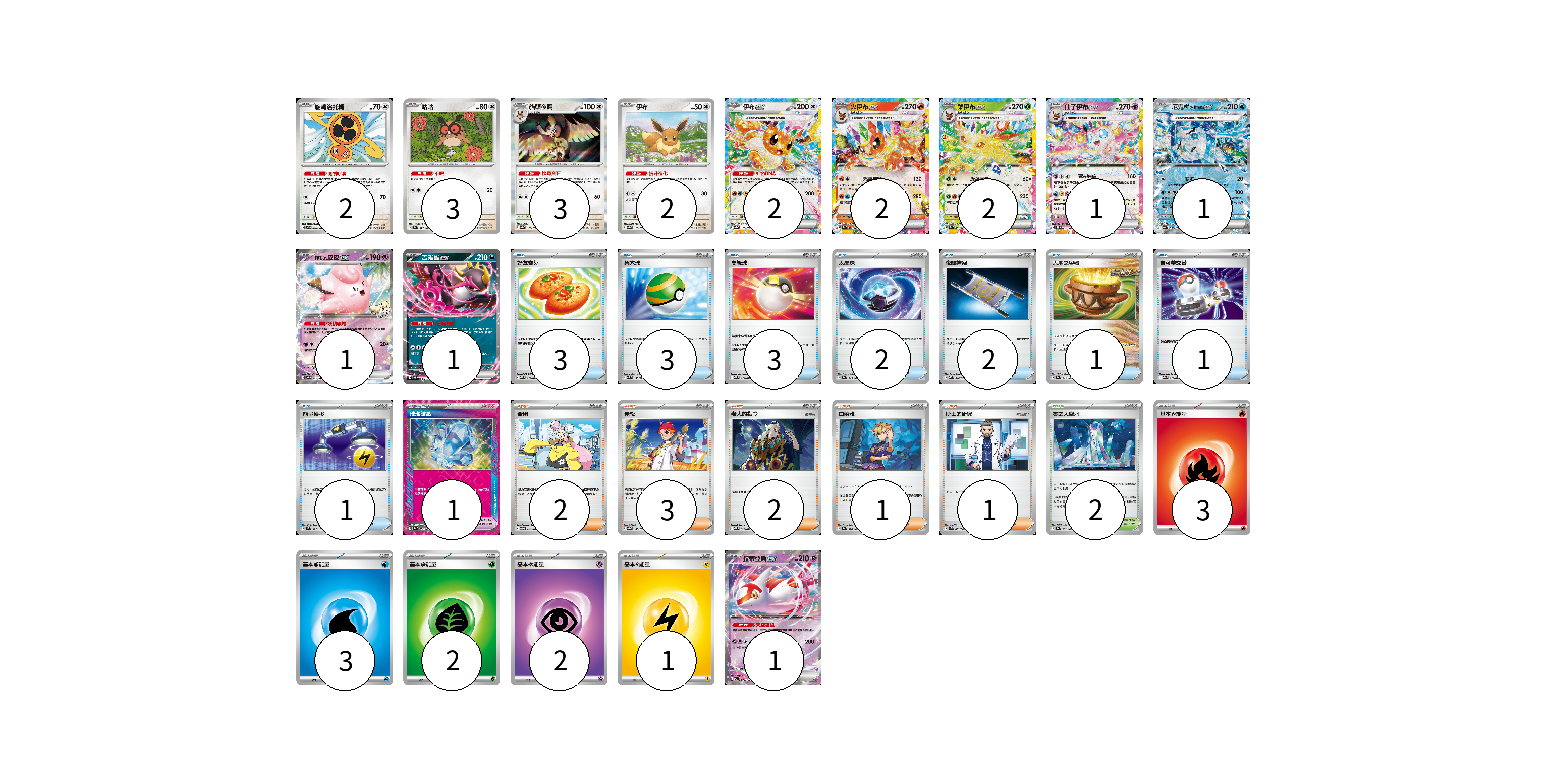牌組構築方案 以此牌組為基礎新構築牌組 顯示卡面 顯示列表 寶可夢卡(21) 2 3 3 2 2 2 2 1 1 1 1 1 寶可夢道具(1) 1 物品卡(16) 3 3 3 2 2 1 1 1 支援者卡(9) 2 3 2 1 1 競技場卡(2) 2 能量卡(11) 3 3 2 2 1 寶可夢卡(21) 卡牌名稱 張數 卡牌名稱 張數 旋轉洛托姆 SV7 080/102 02 咕咕 SV8a 127/187 03 貓頭夜鷹 SV8a 128/187 03 伊布 SV8a 125/187 02 伊布ex SV8a 126/187 02 火伊布ex SV8a 022/187 02 葉伊布ex SV8a 003/187 02 仙子伊布ex SVPN 005/008 01 厄鬼椪 水井面具ex SV8a 050/187 01 莉莉艾的皮皮ex SV9 033/100 01 吉雉雞ex SVOD 004/020 01 拉帝亞斯ex M2a 075/193 01 寶可夢道具(1) 卡牌名稱 張數 卡牌名稱 張數 璀璨結晶 SV8a 152/187 01 物品卡(16) 卡牌名稱 張數 卡牌名稱 張數 好友寶芬 MBD 013/022 03 巢穴球 SVM 133/175 03 高級球 MBD 014/022 03 太晶珠 SV8a 145/187 02 夜間擔架 MBD 016/022 02 大地之容器 SV8a 143/187 01 寶可夢交替 MBG 015/022 01 能量轉移 SVM 127/175 01 支援者卡(9) 卡牌名稱 張數 卡牌名稱 張數 奇樹 SVOD 016/020 02 赤松 SV8a 163/187 03 老大的指令 MBD 020/022 02 白蕾雅 SV8a 176/187 01 博士的研究 SVK 033/042 01 競技場卡(2) 卡牌名稱 張數 卡牌名稱 張數 零之大空洞 SV8a 182/187 02 能量卡(11) 卡牌名稱 張數 卡牌名稱 張數 基本火能量 sv-p FIR 03 基本水能量 sv-p WAT 03 基本草能量 sv-p GRA 02 基本超能量 sv-p PSY 02 基本雷能量 sv-p LIG 01 以此牌組為基礎新構築牌組 牌組編碼 lgyqtf-eIAZAm-wwVamV copy 列印牌組單 牌組編碼已複製 分享至SNS