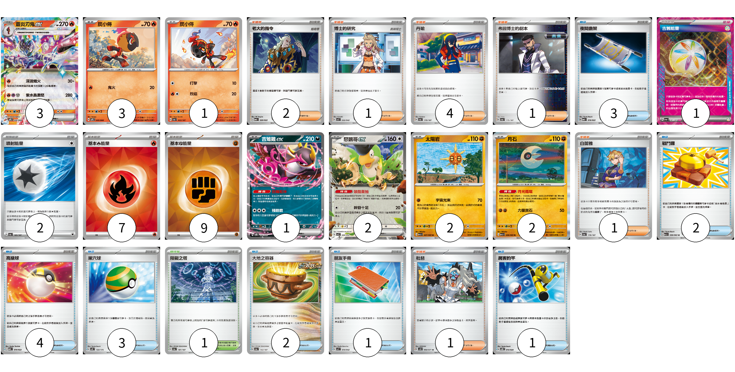 牌組構築方案 以此牌組為基礎新構築牌組 顯示卡面 顯示列表 寶可夢卡(14) 3 3 1 1 2 2 2 物品卡(16) 3 2 4 3 2 1 1 支援者卡(10) 2 1 4 1 1 1 競技場卡(1) 1 能量卡(19) 1 2 7 9 寶可夢卡(14) 卡牌名稱 張數 卡牌名稱 張數 蒼炎刃鬼ex SVPS 006/008 03 炭小侍 SVPS 005/008 03 炭小侍 SV8a 023/187 01 吉雉雞ex SVOD 004/020 01 怒鸚哥ex SVK 006/042 02 太陽岩 M1L 027/063 02 月石 M1L 026/063 02 物品卡(16) 卡牌名稱 張數 卡牌名稱 張數 夜間擔架 MBD 016/022 03 戰鬥鑼 M1L 059/063 02 高級球 MBD 014/022 04 巢穴球 SVM 133/175 03 大地之容器 SV8a 143/187 02 朋友手冊 SVK 014/042 01 厲害釣竿 SVOD 010/020 01 支援者卡(10) 卡牌名稱 張數 卡牌名稱 張數 老大的指令 MBD 020/022 02 博士的研究 SVK 032/042 01 丹瑜 SV8a 170/187 04 弗圖博士的劇本 SV8a 175/187 01 白蕾雅 SV8a 176/187 01 枇琶 SV5K 068/071 01 競技場卡(1) 卡牌名稱 張數 卡牌名稱 張數 阻礙之塔 SV8a 181/187 01 能量卡(19) 卡牌名稱 張數 卡牌名稱 張數 古舊能量 SV8a 187/187 01 噴射能量 SV8a 185/187 02 基本【火】能量 SVQL FIR 07 基本【鬥】能量 SVK FIG 09 以此牌組為基礎新構築牌組 牌組編碼 lhihJk-tRYkoX-gWTbNn copy 列印牌組單 牌組編碼已複製 分享至SNS