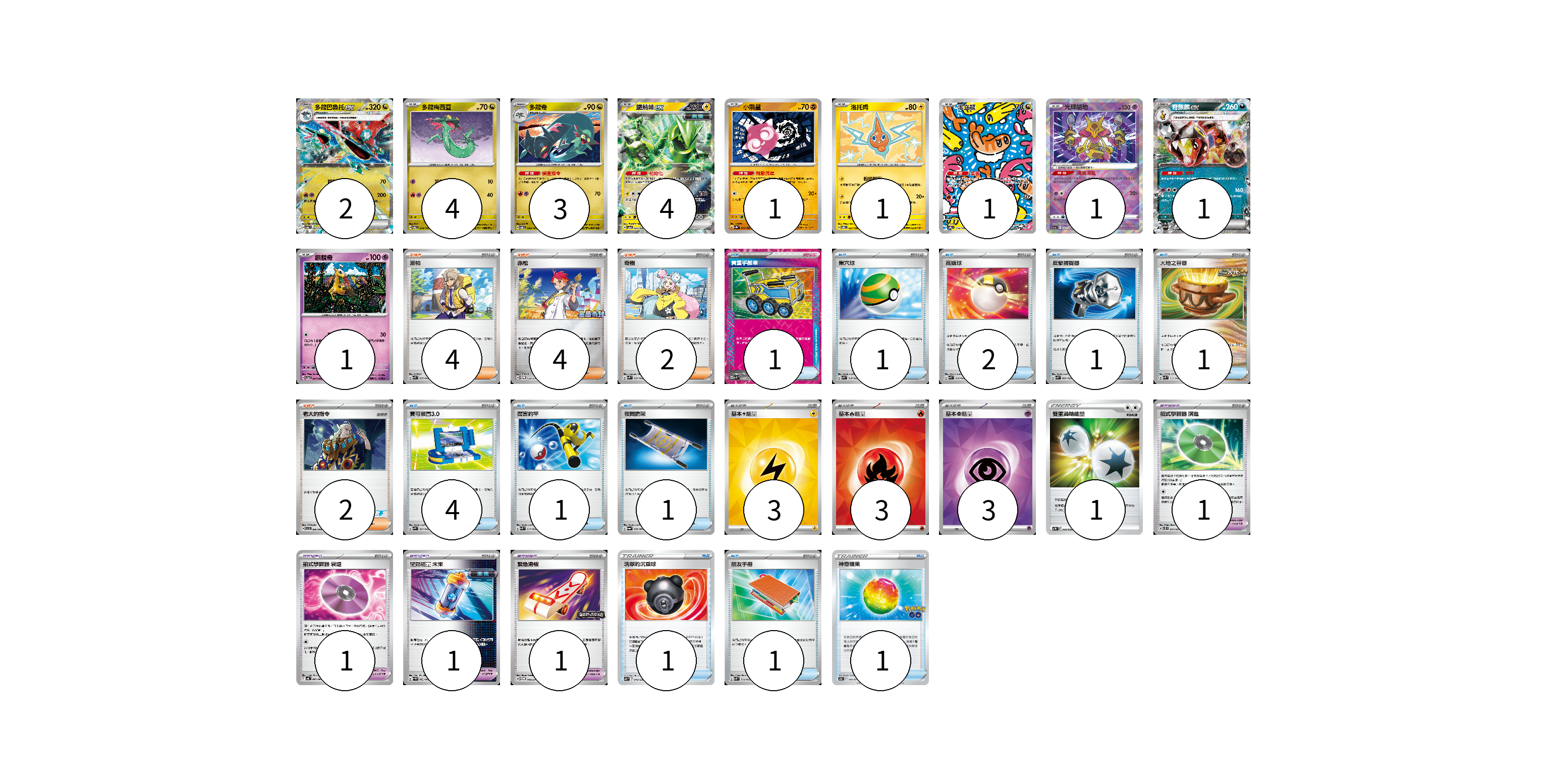 牌組構築方案 以此牌組為基礎新構築牌組 顯示卡面 顯示列表 寶可夢卡(19) 2 4 3 4 1 1 1 1 1 1 寶可夢道具(4) 1 1 1 1 物品卡(15) 1 1 2 1 1 4 1 1 1 1 1 支援者卡(12) 4 4 2 2 能量卡(10) 3 3 3 1 寶可夢卡(19) 卡牌名稱 張數 卡牌名稱 張數 多龍巴魯托ex SV6 081/101 02 多龍梅西亞 SV6 079/101 04 多龍奇 SV6 080/101 03 鐵荊棘ex SV5a 033/066 04 小隕星 SV3a 030/062 01 洛托姆 SV8 037/106 01 米立龍 SV6 112/101 01 光輝胡地 S11a 031/068 01 奇麒麟ex SV5M 042/071 01 麒麟奇 SV5a 034/066 01 寶可夢道具(4) 卡牌名稱 張數 卡牌名稱 張數 招式學習器 演進 SVTL 017/021 01 招式學習器 衰退 SV4K 063/066 01 驅勁能量 未來 SV4M 062/066 01 緊急滑板 SV-P 140/SV-P 01 物品卡(15) 卡牌名稱 張數 卡牌名稱 張數 貴重手推車 SVK 020/042 01 巢穴球 SVK 016/042 01 高級球 SVK 018/042 02 反擊捕捉器 SVK 009/042 01 大地之容器 SVK 012/042 01 寶可裝置3.0 SVK 021/042 04 厲害釣竿 SVK 011/042 01 夜間擔架 SV6a 056/064 01 洗翠的沉重球 SVF 019/038 01 朋友手冊 SVK 014/042 01 神奇糖果 S10b 066/071 01 支援者卡(12) 卡牌名稱 張數 卡牌名稱 張數 派帕 SVK 035/042 04 赤松 SV-P 150/SV-P 04 奇樹 SVK 031/042 02 老大的指令 SVI 066/066 02 能量卡(10) 卡牌名稱 張數 卡牌名稱 張數 基本【雷】能量 SVK LIG 03 基本【火】能量 SVK FIR 03 基本【超】能量 SVK PSY 03 雙重渦輪能量 SVTM 022/022 01 以此牌組為基礎新構築牌組 牌組編碼 lhktdY-MbtKwY-VVIWWT copy 列印牌組單 牌組編碼已複製 分享至SNS