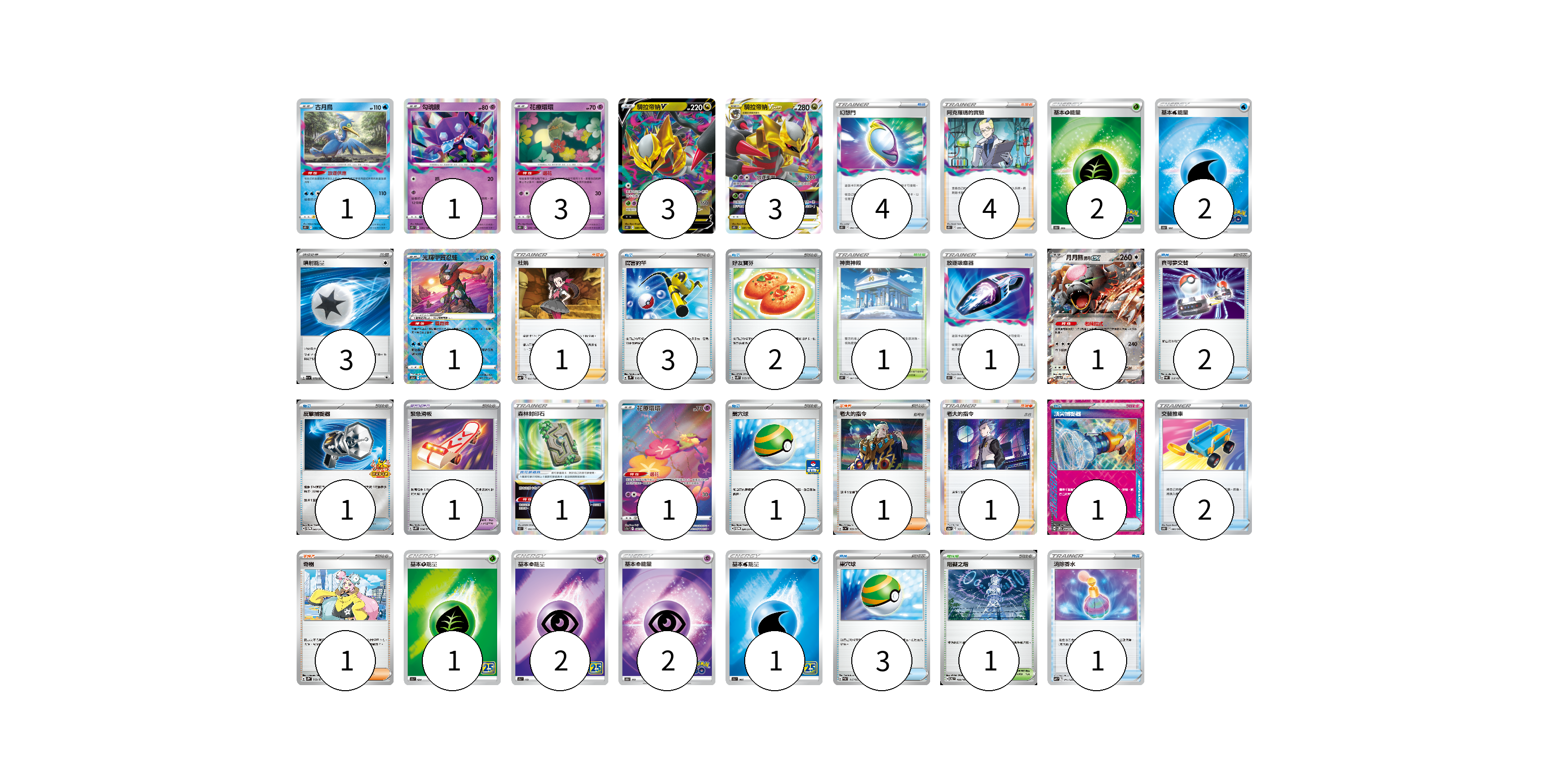 牌組構築方案 以此牌組為基礎新構築牌組 顯示卡面 顯示列表 寶可夢卡(14) 1 1 3 3 3 1 1 1 寶可夢道具(2) 1 1 物品卡(21) 4 3 2 1 2 1 1 1 2 3 1 支援者卡(8) 4 1 1 1 1 競技場卡(2) 1 1 能量卡(13) 2 2 3 1 2 2 1 寶可夢卡(14) 卡牌名稱 張數 卡牌名稱 張數 古月鳥 S11 033/100 01 勾魂眼 S11 044/100 01 花療環環 S11 049/100 03 騎拉帝納V S11 080/100 03 騎拉帝納VSTAR S11 081/100 03 光輝甲賀忍蛙 S12a 033/172 01 月月熊 赫月 ex SV5a 052/066 01 花療環環 S12a 187/172 01 寶可夢道具(2) 卡牌名稱 張數 卡牌名稱 張數 緊急滑板 SV5K 064/071 01 森林封印石 S12 092/098 01 物品卡(21) 卡牌名稱 張數 卡牌名稱 張數 幻想門 S11 092/100 04 厲害釣竿 SV2P 066/071 03 好友寶芬 SV5K 063/071 02 放逐吸塵器 S11 093/100 01 寶可夢交替 SVAL 016/021 02 反擊捕捉器 SV-P 083/SV-P 01 巢穴球 SV-P 091/SV-P 01 頂尖捕捉器 SV5M 062/071 01 交替推車 S10D 060/067 02 巢穴球 SVAM 015/023 03 消除香水 SVF 011/038 01 支援者卡(8) 卡牌名稱 張數 卡牌名稱 張數 阿克羅瑪的實驗 S11 095/100 04 杜娟 SVB 021/028 01 老大的指令 SV1a 069/073 01 老大的指令(赤日) S12a 161/172 01 奇樹 SV2D 069/071 01 競技場卡(2) 卡牌名稱 張數 卡牌名稱 張數 神奧神殿 S10P 067/067 01 阻礙之塔 SV6 100/101 01 能量卡(13) 卡牌名稱 張數 卡牌名稱 張數 基本草能量 S10b GRA 02 基本水能量 S10b WAT 02 噴射能量 SV1a 072/073 03 基本草能量 S8a GRA 01 基本超能量 S8a PSY 02 基本超能量 S10b PSY 02 基本水能量 S8a WAT 01 以此牌組為基礎新構築牌組 牌組編碼 lhmssd-LaCwTv-WOxxUi copy 列印牌組單 牌組編碼已複製 分享至SNS