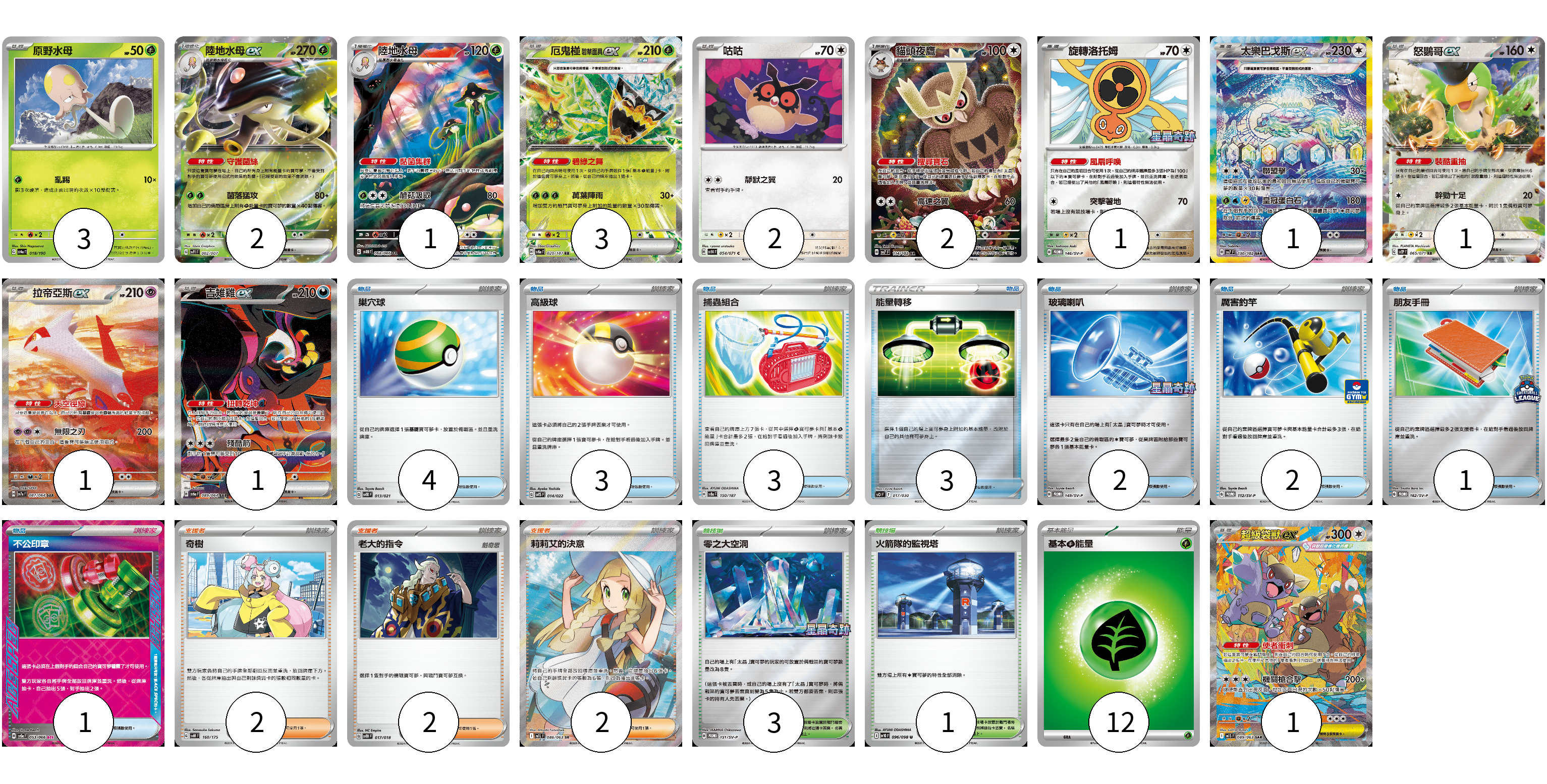 牌組構築方案 以此牌組為基礎新構築牌組 顯示卡面 顯示列表 寶可夢卡(19) 3 2 1 3 2 2 1 1 1 1 1 1 物品卡(19) 4 3 3 3 2 2 1 1 支援者卡(6) 2 2 2 競技場卡(4) 3 1 能量卡(12) 12 寶可夢卡(19) 卡牌名稱 張數 卡牌名稱 張數 原野水母 SV4a 018/190 03 陸地水母ex SVP1 002/007 02 陸地水母 SV4M 068/066 01 厄鬼椪 碧草面具ex SV8a 020/187 03 咕咕 SV5K 054/071 02 貓頭夜鷹 SV7 114/102 02 旋轉洛托姆 SV-P 146/SV-P 01 太樂巴戈斯ex SV7 130/102 01 怒鸚哥ex SV2P 065/071 01 拉帝亞斯ex SV7a 087/064 01 吉雉雞ex SV6a 089/064 01 超級袋獸ex M1S 089/063 01 物品卡(19) 卡牌名稱 張數 卡牌名稱 張數 巢穴球 SVTR 013/021 04 高級球 SVTS 014/022 03 捕蟲組合 SV8a 150/187 03 能量轉移 SO 017/030 03 玻璃喇叭 SV-P 149/SV-P 02 厲害釣竿 SV-P 112/SV-P 02 朋友手冊 SV-P 182/SV-P 01 不公印章 SV5a 053/066 01 支援者卡(6) 卡牌名稱 張數 卡牌名稱 張數 奇樹 SVM 160/175 02 老大的指令 SVTH 017/018 02 莉莉艾的決意 M1L 086/063 02 競技場卡(4) 卡牌名稱 張數 卡牌名稱 張數 零之大空洞 SV-P 151/SV-P 03 火箭隊的監視塔 SV10 096/098 01 能量卡(12) 卡牌名稱 張數 卡牌名稱 張數 基本【草】能量 M-P GRA 12 以此牌組為基礎新構築牌組 牌組編碼 liQZgG-FqhUbp-jOPZXB copy 列印牌組單 牌組編碼已複製 分享至SNS