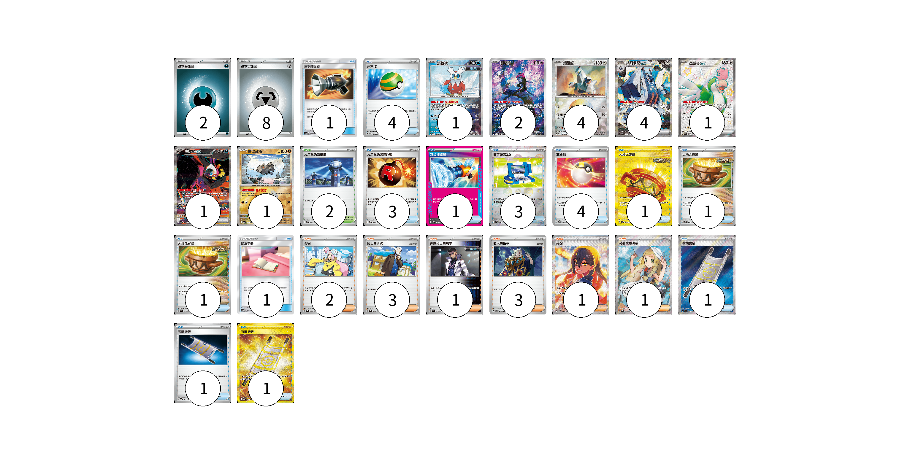 牌組構築方案 以此牌組為基礎新構築牌組 顯示卡面 顯示列表 寶可夢卡(14) 1 2 4 4 1 1 1 物品卡(23) 1 4 3 1 3 4 1 1 1 1 1 1 1 支援者卡(11) 2 3 1 3 1 1 競技場卡(2) 2 能量卡(10) 2 8 寶可夢卡(14) 卡牌名稱 張數 卡牌名稱 張數 鐵包袱 SV8a 047/187 01 願增猿 SV6 107/101 02 鋁鋼龍 SV8a 112/187 04 鋁鋼橋龍ex SV7a 088/064 04 怒鸚哥ex SV4a 337/190 01 吉雉雞ex SV6a 089/064 01 古空棘魚 SV8a 079/187 01 物品卡(23) 卡牌名稱 張數 卡牌名稱 張數 反擊捕捉器 AC1a 130/158 01 巢穴球 SVTG 012/019 04 火箭隊的驚嚇炸彈 SV10 089/098 03 頂尖捕捉器 MBG 014/022 01 寶可裝置3.0 SV11B 081/086 03 高級球 SVTR 014/021 04 大地之容器 SV6a 093/064 01 大地之容器 SVTS 011/022 01 大地之容器 SVK 012/042 01 朋友手冊 AS6b 188/194 01 夜間擔架 M1L 083/063 01 夜間擔架 SV8a 151/187 01 夜間擔架 SV8 137/106 01 支援者卡(11) 卡牌名稱 張數 卡牌名稱 張數 奇樹 SVM 160/175 02 博士的研究 SVM 165/175 03 弗圖博士的劇本 SVK 034/042 01 老大的指令 SVTR 019/021 03 丹瑜 SV6 130/101 01 莉莉艾的決意 M1L 086/063 01 競技場卡(2) 卡牌名稱 張數 卡牌名稱 張數 火箭隊的監視塔 SV10 096/098 02 能量卡(10) 卡牌名稱 張數 卡牌名稱 張數 基本【惡】能量 M-P DAR 02 基本【鋼】能量 M-P MET 08 以此牌組為基礎新構築牌組 牌組編碼 ljIomx-RXLwdh-pyAYLL copy 列印牌組單 牌組編碼已複製 分享至SNS