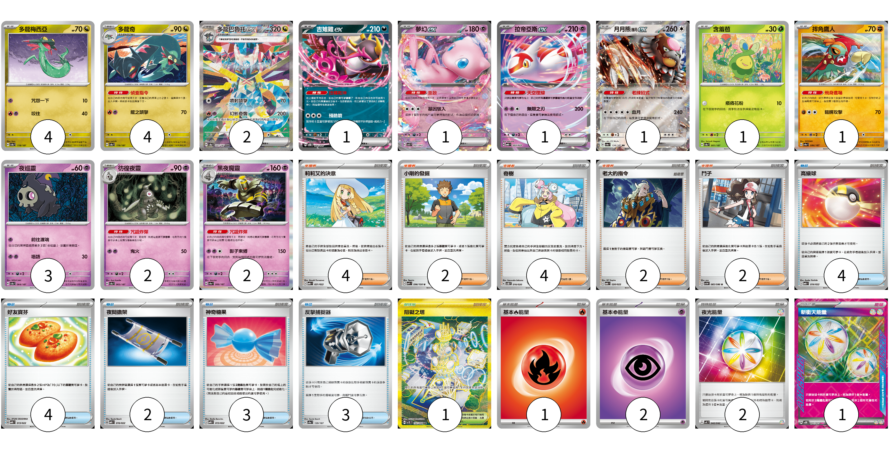 牌組構築方案 以此牌組為基礎新構築牌組 顯示卡面 顯示列表 寶可夢卡(23) 4 4 2 1 1 1 1 1 1 3 2 2 物品卡(16) 4 4 2 3 3 支援者卡(14) 4 2 4 2 2 競技場卡(1) 1 能量卡(6) 1 2 2 1 寶可夢卡(23) 卡牌名稱 張數 卡牌名稱 張數 多龍梅西亞 SV8a 118/187 04 多龍奇 SV8a 119/187 04 多龍巴魯托ex SV8a 221/187 02 吉雉雞ex SVOD 004/020 01 夢幻ex SVK 001/042 01 拉帝亞斯ex MBD 003/022 01 月月熊 赫月ex SV8a 134/187 01 含羞苞 SV8a 001/187 01 摔角鷹人 SV8a 084/187 01 夜巡靈 SV8a 064/187 03 彷徨夜靈 SV8a 065/187 02 黑夜魔靈 SV8a 066/187 02 物品卡(16) 卡牌名稱 張數 卡牌名稱 張數 高級球 MBD 014/022 04 好友寶芬 MBD 013/022 04 夜間擔架 MBD 016/022 02 神奇糖果 MBG 013/022 03 反擊捕捉器 SV8a 139/187 03 支援者卡(14) 卡牌名稱 張數 卡牌名稱 張數 莉莉艾的決意 MBD 021/022 04 小剛的發掘 SV9 096/100 02 奇樹 SVOD 016/020 04 老大的指令 MBD 020/022 02 鬥子 SV11W 085/086 02 競技場卡(1) 卡牌名稱 張數 卡牌名稱 張數 阻礙之塔 SV10 132/098 01 能量卡(6) 卡牌名稱 張數 卡牌名稱 張數 基本火能量 sv-p FIR 01 基本超能量 sv-p PSY 02 夜光能量 SVK 042/042 02 新衝天能量 SV5K 071/071 01 以此牌組為基礎新構築牌組 牌組編碼 ljRzUs-oRLVtq-swPrgN copy 列印牌組單 牌組編碼已複製 分享至SNS