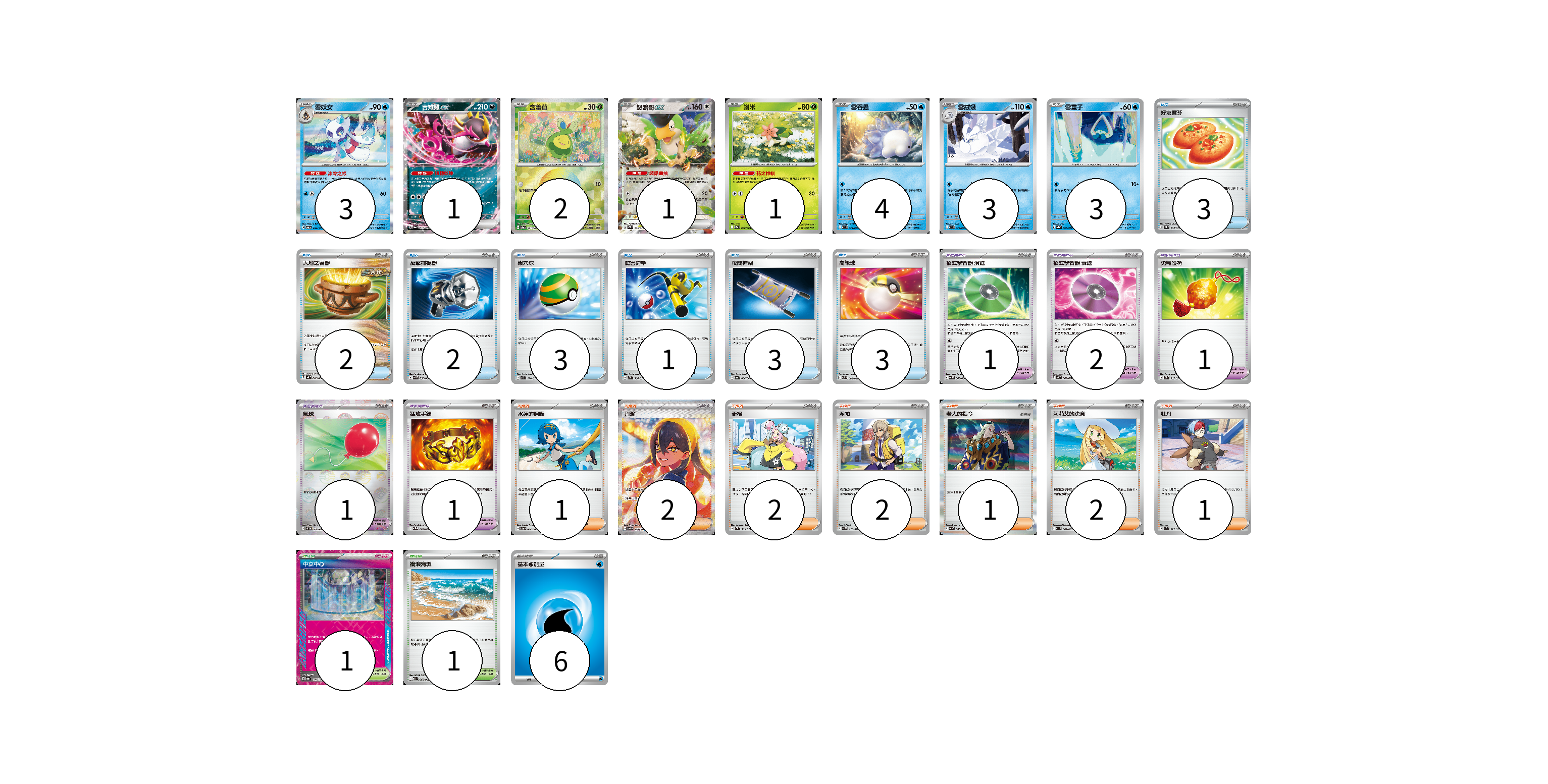 牌組構築方案 以此牌組為基礎新構築牌組 顯示卡面 顯示列表 寶可夢卡(18) 3 1 2 1 1 4 3 3 寶可夢道具(6) 1 2 1 1 1 物品卡(17) 3 2 2 3 1 3 3 支援者卡(11) 1 2 2 2 1 2 1 競技場卡(2) 1 1 能量卡(6) 6 寶可夢卡(18) 卡牌名稱 張數 卡牌名稱 張數 雪妖女 SV6 033/101 03 吉雉雞ex SV6a 038/064 01 含羞苞 SV8a 001/187 02 怒鸚哥ex SV2P 065/071 01 謝米 SV9a 006/063 01 雪吞蟲 M1S 024/063 04 雪絨蛾 M1S 025/063 03 雪童子 SV3a 005/062 03 寶可夢道具(6) 卡牌名稱 張數 卡牌名稱 張數 招式學習器 演進 SV4M 063/066 01 招式學習器 衰退 SV4K 063/066 02 勇氣護符 SV2D 067/071 01 氣球 SV11B 082/086 01 猛攻手鐲 SV11W 082/086 01 物品卡(17) 卡牌名稱 張數 卡牌名稱 張數 好友寶芬 SV5K 063/071 03 大地之容器 SV4K 060/066 02 反擊捕捉器 SV4M 059/066 02 巢穴球 SV1S 070/078 03 厲害釣竿 SV2P 066/071 01 夜間擔架 SV6a 056/064 03 高級球 SVB 002/028 03 支援者卡(11) 卡牌名稱 張數 卡牌名稱 張數 水蓮的照顧 SV5a 064/066 01 丹瑜 SV6 130/101 02 奇樹 SV2D 069/071 02 派帕 SV1V 076/078 02 老大的指令 SV1a 069/073 01 莉莉艾的決意 M1L 062/063 02 牡丹 SV1S 077/078 01 競技場卡(2) 卡牌名稱 張數 卡牌名稱 張數 中立中心 SV8a 184/187 01 衝浪海灘 M1S 062/063 01 能量卡(6) 卡牌名稱 張數 卡牌名稱 張數 基本水能量 sv-p WAT 06 以此牌組為基礎新構築牌組 牌組編碼 ljpnRS-VJgsHq-rtPzqz copy 列印牌組單 牌組編碼已複製 分享至SNS