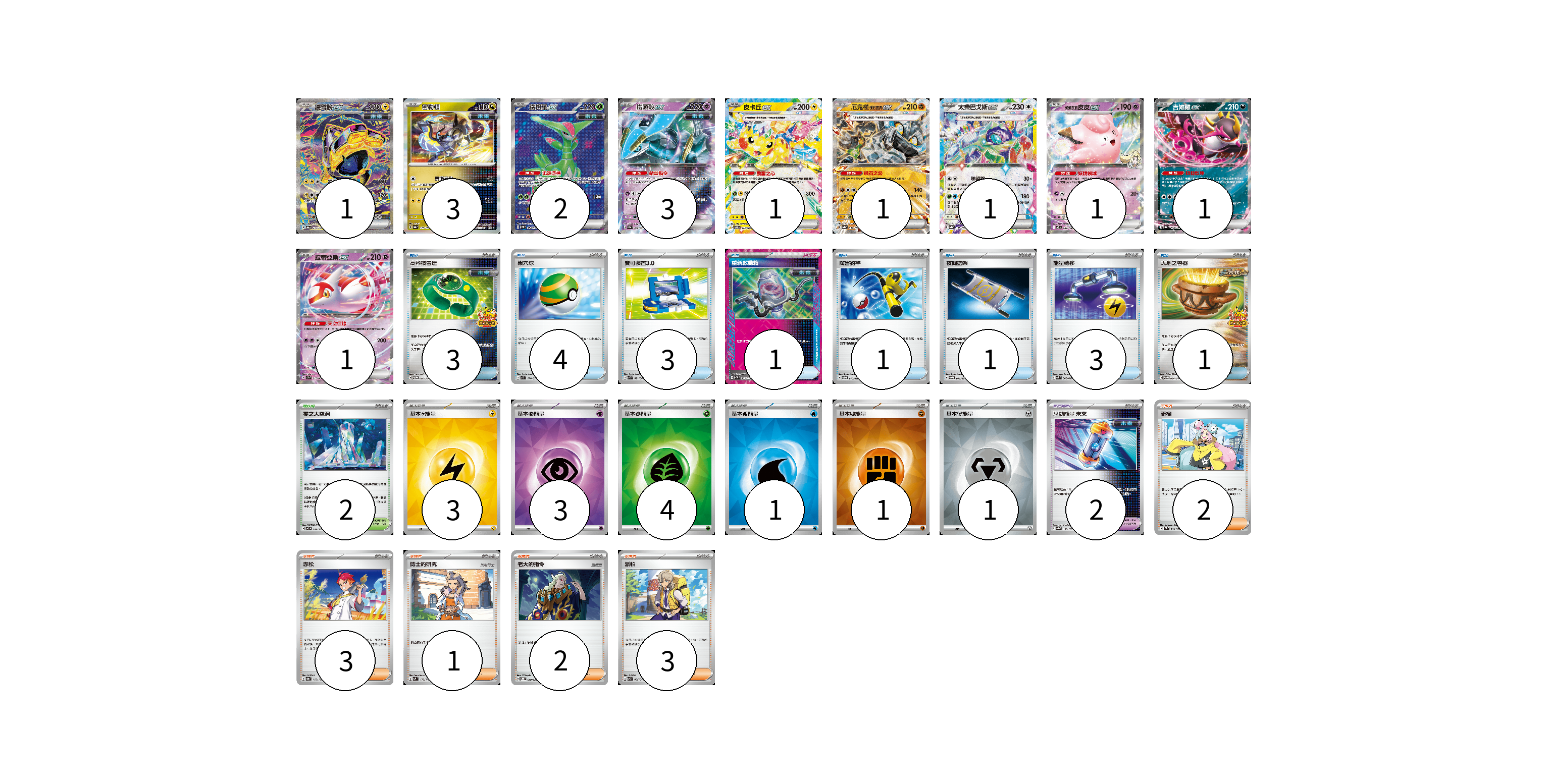 牌組構築方案 以此牌組為基礎新構築牌組 顯示卡面 顯示列表 寶可夢卡(15) 1 3 2 3 1 1 1 1 1 1 寶可夢道具(2) 2 物品卡(17) 3 4 3 1 1 1 3 1 支援者卡(11) 2 3 1 2 3 競技場卡(2) 2 能量卡(13) 3 3 4 1 1 1 寶可夢卡(15) 卡牌名稱 張數 卡牌名稱 張數 鐵臂膀ex SV8a 210/187 01 密勒頓 SV8a 123/187 03 鐵斑葉ex SV5M 084/071 02 鐵頭殼ex SV5M 036/071 03 皮卡丘ex SV8 033/106 01 厄鬼椪 礎石面具ex SV8a 091/187 01 太樂巴戈斯ex SV8a 136/187 01 莉莉艾的皮皮ex SV9 033/100 01 吉雉雞ex SV8a 104/187 01 拉帝亞斯ex SV7a 019/064 01 寶可夢道具(2) 卡牌名稱 張數 卡牌名稱 張數 驅勁能量 未來 SV8a 158/187 02 物品卡(17) 卡牌名稱 張數 卡牌名稱 張數 高科技雷達 SV-P 085/SV-P 03 巢穴球 SV1S 070/078 04 寶可裝置3.0 SVK 021/042 03 重新啟動箱 SV5M 063/071 01 厲害釣竿 SVOD 010/020 01 夜間擔架 SVOM 016/021 01 能量轉移 SVK 008/042 03 大地之容器 SV-P 084/SV-P 01 支援者卡(11) 卡牌名稱 張數 卡牌名稱 張數 奇樹 SV2D 069/071 02 赤松 SV8a 163/187 03 博士的研究 SVM 170/175 01 老大的指令 SVOD 019/020 02 派帕 SVK 035/042 03 競技場卡(2) 卡牌名稱 張數 卡牌名稱 張數 零之大空洞 SV7 102/102 02 能量卡(13) 卡牌名稱 張數 卡牌名稱 張數 基本【雷】能量 SVM LIG 03 基本【超】能量 SVM PSY 03 基本【草】能量 SVM GRA 04 基本【水】能量 SVM WAT 01 基本【鬥】能量 SVM FIG 01 基本【鋼】能量 SVM MET 01 以此牌組為基礎新構築牌組 牌組編碼 lkjkGe-Mrpqqt-YdhnvF copy 列印牌組單 牌組編碼已複製 分享至SNS