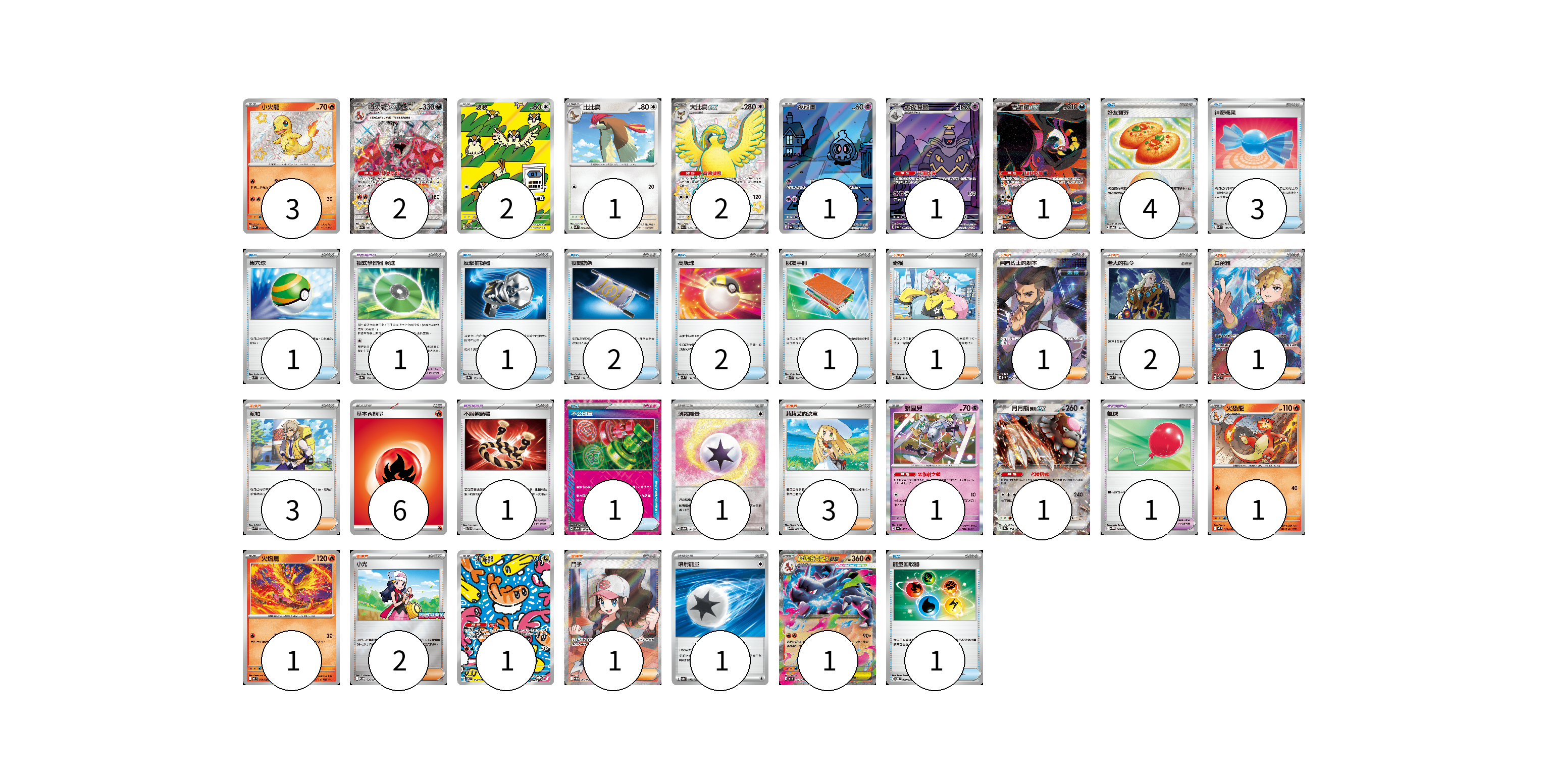 牌組構築方案 以此牌組為基礎新構築牌組 顯示卡面 顯示列表 寶可夢卡(19) 3 2 2 1 2 1 1 1 1 1 1 1 1 1 寶可夢道具(3) 1 1 1 物品卡(16) 4 3 1 1 2 2 1 1 1 支援者卡(14) 1 1 2 1 3 3 2 1 能量卡(8) 6 1 1 寶可夢卡(19) 卡牌名稱 張數 卡牌名稱 張數 小火龍 SV4a 210/190 03 噴火龍ex SV4a 331/190 02 波波 SV3 118/108 02 比比鳥 SVK 004/042 01 大比鳥ex SV4a 335/190 02 夜巡靈 SV6a 068/064 01 黑夜魔靈 SV6a 070/064 01 吉雉雞ex SV6a 089/064 01 鑰圈兒 SV4a 087/190 01 月月熊 赫月ex SV8a 134/187 01 火恐龍 M2 012/080 01 火焰鳥 M2 014/080 01 米立龍 SV6 112/101 01 超級噴火龍Xex M2 013/080 01 寶可夢道具(3) 卡牌名稱 張數 卡牌名稱 張數 招式學習器 演進 SV8a 160/187 01 不服輸頭帶 SVTL 016/021 01 氣球 SV11B 082/086 01 物品卡(16) 卡牌名稱 張數 卡牌名稱 張數 好友寶芬 SV8a 147/187 04 神奇糖果 SVM 135/175 03 巢穴球 SVM 133/175 01 反擊捕捉器 SV8a 139/187 01 夜間擔架 SV8a 151/187 02 高級球 SVM 134/175 02 朋友手冊 SVK 014/042 01 不公印章 SV5a 053/066 01 能量回收器 SVOD 009/020 01 支援者卡(14) 卡牌名稱 張數 卡牌名稱 張數 奇樹 SVM 160/175 01 弗圖博士的劇本 SV4M 086/066 01 老大的指令 SVM 172/175 02 白蕾雅 SV7 126/102 01 派帕 SVK 035/042 03 莉莉艾的決意 M1L 062/063 03 小光 M-P 028/M-P 02 鬥子 SV11W 166/086 01 能量卡(8) 卡牌名稱 張數 卡牌名稱 張數 基本火能量 sv-p FIR 06 薄霧能量 SV8a 186/187 01 噴射能量 SV8a 185/187 01 以此牌組為基礎新構築牌組 牌組編碼 llKSuM-GfYtJn-SXnzQB copy 列印牌組單 牌組編碼已複製 分享至SNS