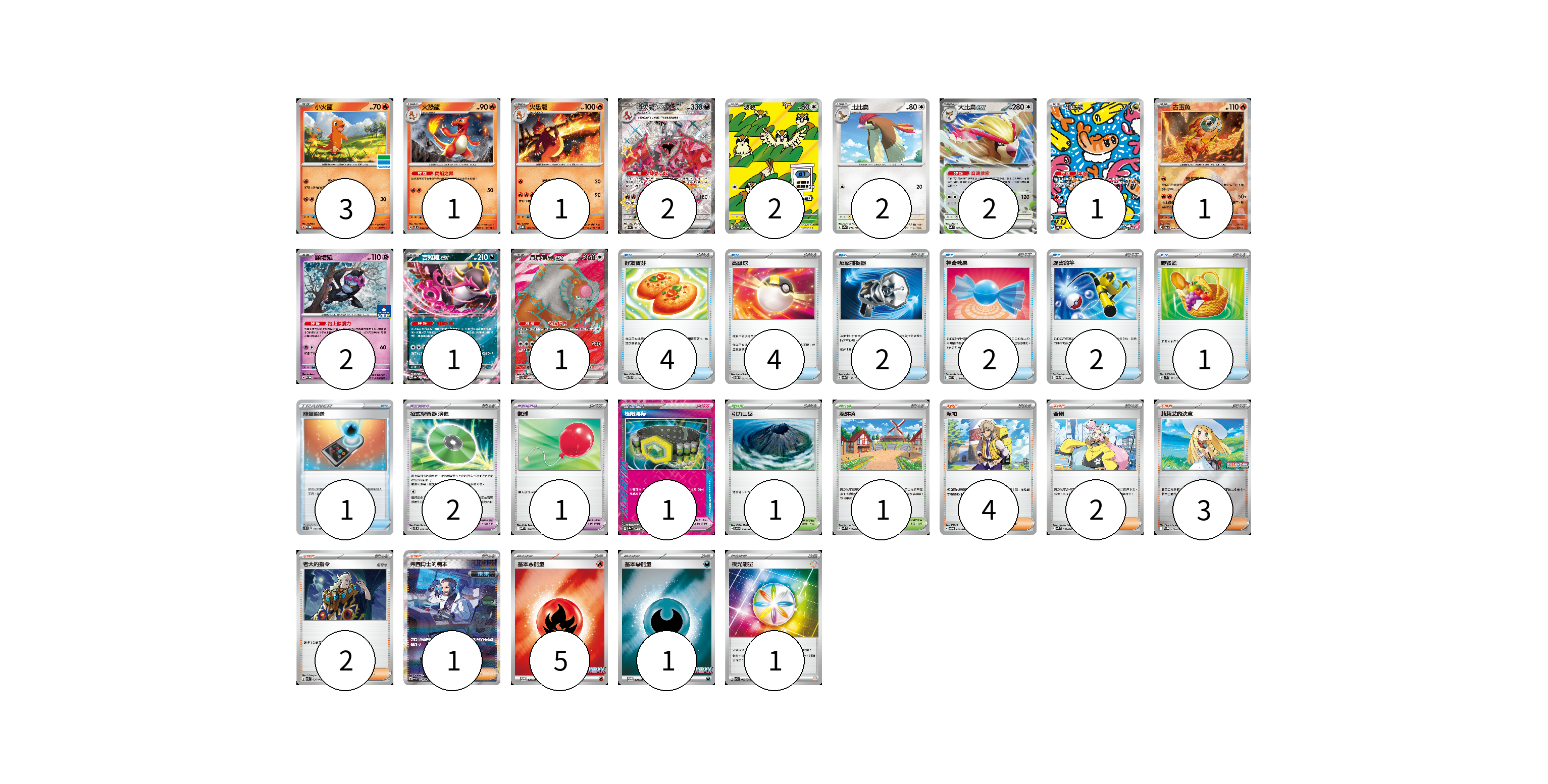 牌組構築方案 以此牌組為基礎新構築牌組 顯示卡面 顯示列表 寶可夢卡(19) 3 1 1 2 2 2 2 1 1 2 1 1 寶可夢道具(4) 2 1 1 物品卡(16) 4 4 2 2 2 1 1 支援者卡(12) 4 2 3 2 1 競技場卡(2) 1 1 能量卡(7) 5 1 1 寶可夢卡(19) 卡牌名稱 張數 卡牌名稱 張數 小火龍 SV-P 232/SV-P 03 火恐龍 SVTL 002/021 01 火恐龍 SVQL 002/022 01 噴火龍ex SV4a 331/190 02 波波 SV3 118/108 02 比比鳥 SV2a 017/165 02 大比鳥ex SVK 005/042 02 米立龍 SV6 112/101 01 古玉魚 SV8a 025/187 01 願增猿 M-P 014/M-P 02 吉雉雞ex SV8a 104/187 01 月月熊 赫月 ex SV5a 084/066 01 寶可夢道具(4) 卡牌名稱 張數 卡牌名稱 張數 招式學習器 演進 SVTL 017/021 02 氣球 MBD 018/022 01 極限腰帶 SV8a 159/187 01 物品卡(16) 卡牌名稱 張數 卡牌名稱 張數 好友寶芬 SVTG 011/019 04 高級球 SVTM 012/022 04 反擊捕捉器 SV8a 139/187 02 神奇糖果 SVEL 013/020 02 厲害釣竿 SVEM 011/020 02 野餐籃 SV1V 071/078 01 能量輸送 SC1D 147/164 01 支援者卡(12) 卡牌名稱 張數 卡牌名稱 張數 派帕 SVOD 018/020 04 奇樹 SVK 031/042 02 莉莉艾的決意 M-P 011/M-P 03 老大的指令 SVK 036/042 02 弗圖博士的劇本 SV4M 091/066 01 競技場卡(2) 卡牌名稱 張數 卡牌名稱 張數 引力山岳 SV8 106/106 01 深缽鎮 SVK 039/042 01 能量卡(7) 卡牌名稱 張數 卡牌名稱 張數 基本【火】能量 M-P 032/M-P 05 基本【惡】能量 M-P 034/M-P 01 夜光能量 SVK 042/042 01 以此牌組為基礎新構築牌組 牌組編碼 loHJaD-eAJxXE-FyPRHe copy 列印牌組單 牌組編碼已複製 分享至SNS