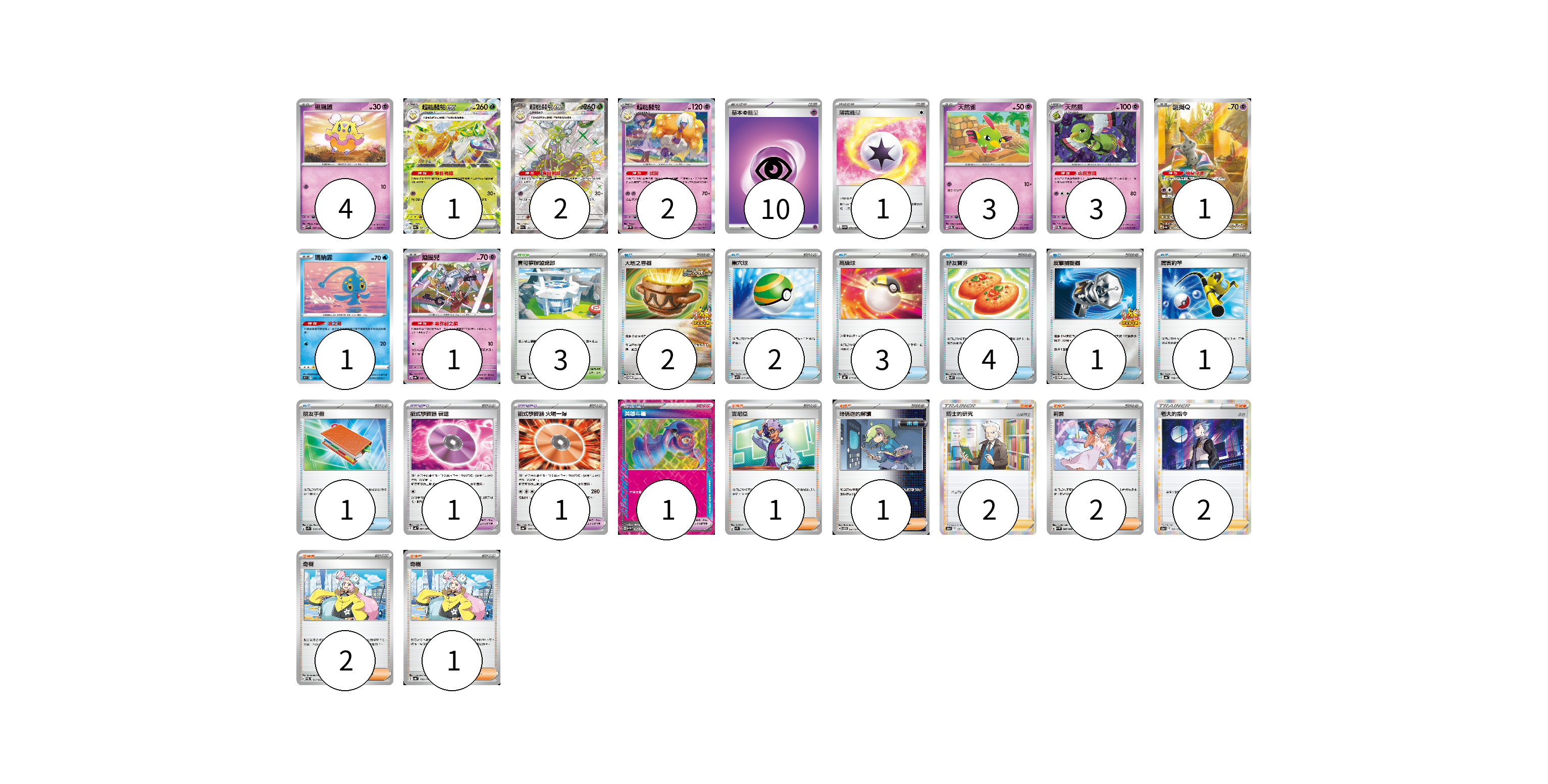 牌組構築方案 以此牌組為基礎新構築牌組 顯示卡面 顯示列表 寶可夢卡(18) 4 1 2 2 3 3 1 1 1 寶可夢道具(3) 1 1 1 物品卡(14) 2 2 3 4 1 1 1 支援者卡(11) 1 1 2 2 2 2 1 競技場卡(3) 3 能量卡(11) 10 1 寶可夢卡(18) 卡牌名稱 張數 卡牌名稱 張數 飄飄雛 SVAW 007/023 04 超能豔鴕ex SV4a 023/190 01 超能豔鴕ex SV4a 323/190 02 超能豔鴕 SV4M 033/066 02 天然雀 SVEM 004/020 03 天然鳥 SVEM 005/020 03 謎擬Q SV4a 341/190 01 瑪納霏 S9 031/100 01 鑰圈兒 SV4a 087/190 01 寶可夢道具(3) 卡牌名稱 張數 卡牌名稱 張數 招式學習器 衰退 SV4K 063/066 01 招式學習器 火場一爆 SV4a 170/190 01 英雄斗篷 SV5M 064/071 01 物品卡(14) 卡牌名稱 張數 卡牌名稱 張數 大地之容器 SV-P 084/SV-P 02 巢穴球 SVHM 012/022 02 高級球 SVHK 013/022 03 好友寶芬 SV5K 063/071 04 反擊捕捉器 SV-P 083/SV-P 01 厲害釣竿 SV4a 158/190 01 朋友手冊 SV1S 069/078 01 支援者卡(11) 卡牌名稱 張數 卡牌名稱 張數 吉尼亞 SV1S 074/078 01 暗碼迷的解讀 SV5M 067/071 01 博士的研究(山梨博士) S12a 159/172 02 莉普 SV4M 066/066 02 老大的指令(赤日) S12a 161/172 02 奇樹 SVEM 017/020 02 奇樹 SV4a 174/190 01 競技場卡(3) 卡牌名稱 張數 卡牌名稱 張數 寶可夢聯盟總部 SV4a 186/190 03 能量卡(11) 卡牌名稱 張數 卡牌名稱 張數 基本超能量 sv-p PSY 10 薄霧能量 SV5M 071/071 01 以此牌組為基礎新構築牌組 牌組編碼 loputY-aWjdmz-ARsyDj copy 列印牌組單 牌組編碼已複製 分享至SNS