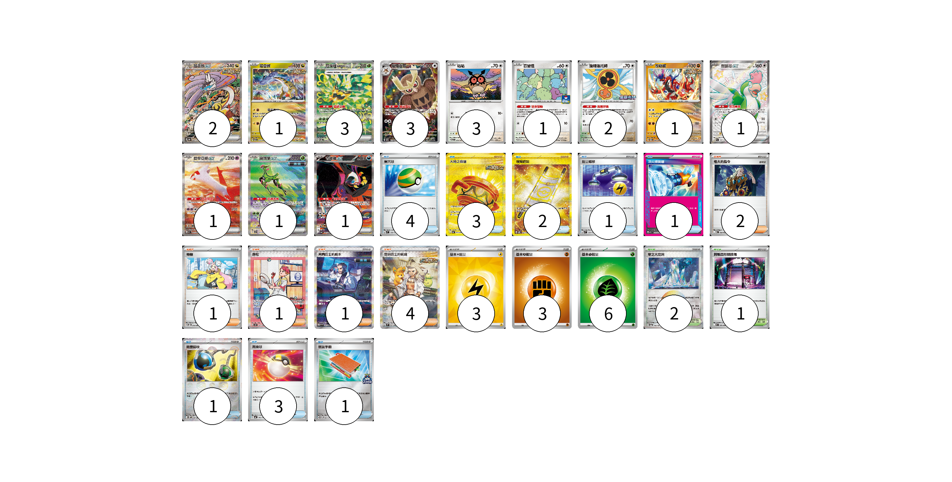 牌組構築方案 以此牌組為基礎新構築牌組 顯示卡面 顯示列表 寶可夢卡(20) 2 1 3 3 3 1 2 1 1 1 1 1 物品卡(16) 4 3 2 1 1 1 3 1 支援者卡(9) 2 1 1 1 4 競技場卡(3) 2 1 能量卡(12) 3 3 6 寶可夢卡(20) 卡牌名稱 張數 卡牌名稱 張數 猛雷鼓ex SV8a 222/187 02 猛雷鼓 SV7 075/102 01 厄鬼椪 碧草面具ex SV6 125/101 03 貓頭夜鷹 SV7 114/102 03 咕咕 SV7 076/102 03 百變怪 SV-P 111/SV-P 01 旋轉洛托姆 SV-P 146/SV-P 02 故勒頓 SV8 069/106 01 怒鸚哥ex SV4a 337/190 01 拉帝亞斯ex SV7a 087/064 01 鐵斑葉ex SV5M 093/071 01 吉雉雞ex SV6a 089/064 01 物品卡(16) 卡牌名稱 張數 卡牌名稱 張數 巢穴球 SVM 133/175 04 大地之容器 SV6a 093/064 03 夜間擔架 SV8 137/106 02 能量轉移 SVM 127/175 01 頂尖捕捉器 MBG 014/022 01 能量回收 SV11W 079/086 01 高級球 SV4a 161/190 03 朋友手冊 SV-P 182/SV-P 01 支援者卡(9) 卡牌名稱 張數 卡牌名稱 張數 老大的指令 MBD 020/022 02 奇樹 SVOD 016/020 01 赤松 SV8a 227/187 01 弗圖博士的劇本 SV4M 091/066 01 奧琳博士的氣魄 SV4K 091/066 04 競技場卡(3) 卡牌名稱 張數 卡牌名稱 張數 零之大空洞 SV8a 182/187 02 對戰圓形競技場 M2 079/080 01 能量卡(12) 卡牌名稱 張數 卡牌名稱 張數 基本【雷】能量 SVQP LIG 03 基本【鬥】能量 M-P FIG 03 基本【草】能量 M-P GRA 06 以此牌組為基礎新構築牌組 牌組編碼 lpWPjD-kqTREH-SpmTpU copy 列印牌組單 牌組編碼已複製 分享至SNS