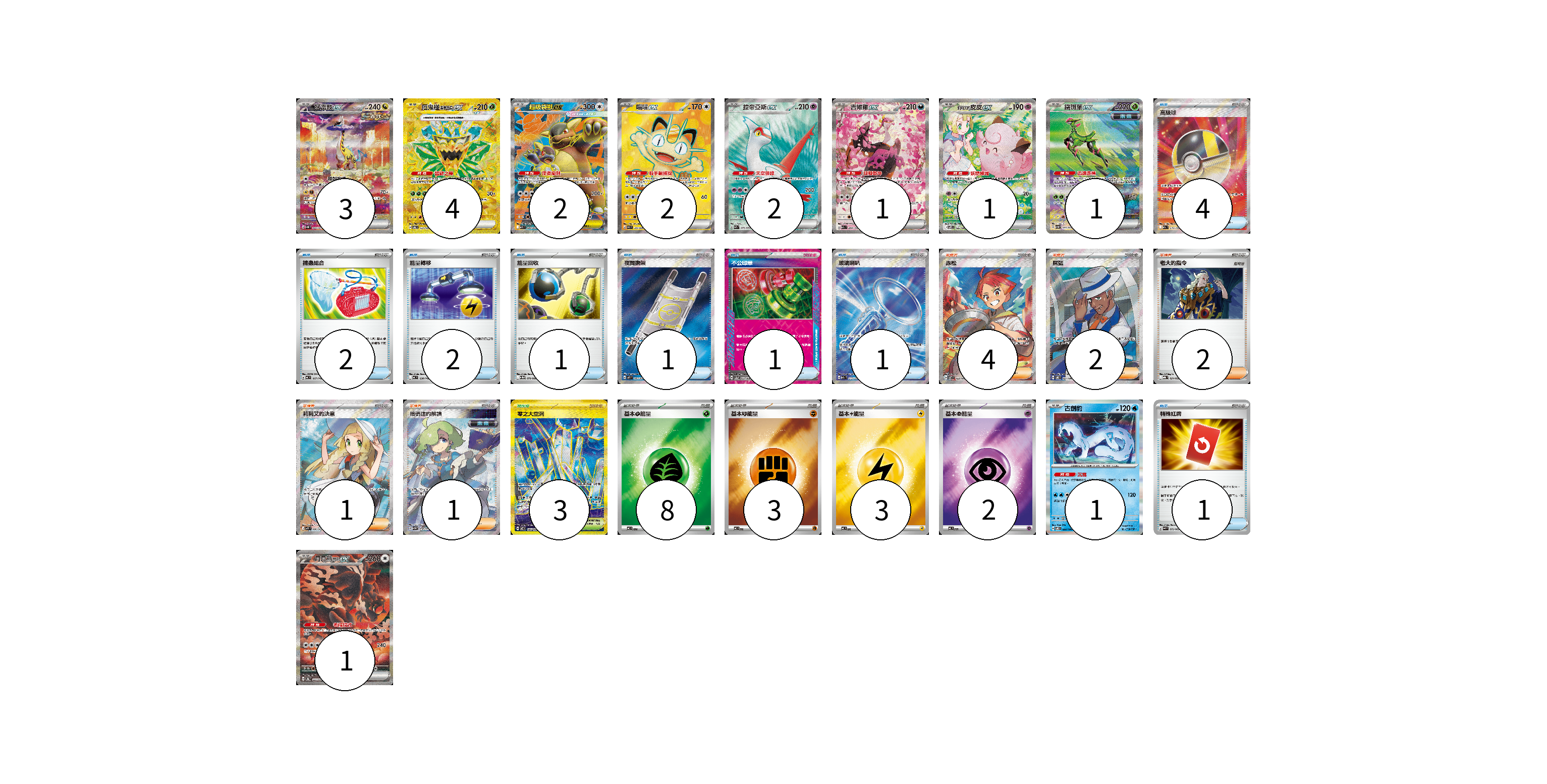 牌組構築方案 以此牌組為基礎新構築牌組 顯示卡面 顯示列表 寶可夢卡(18) 3 4 2 2 2 1 1 1 1 1 物品卡(13) 4 2 2 1 1 1 1 1 支援者卡(10) 4 2 2 1 1 競技場卡(3) 3 能量卡(16) 8 3 3 2 寶可夢卡(18) 卡牌名稱 張數 卡牌名稱 張數 猛雷鼓ex SV5K 095/071 03 厄鬼椪 碧草面具ex SV6 131/101 04 超級袋獸ex M1S 080/063 02 喵喵ex M3 100/080 02 拉帝亞斯ex SV7a 078/064 02 吉雉雞ex M2a 244/193 01 莉莉艾的皮皮ex SV9 126/100 01 鐵斑葉ex SV5M 093/071 01 古劍豹 SV8 032/106 01 月月熊 赫月ex SV8a 225/187 01 物品卡(13) 卡牌名稱 張數 卡牌名稱 張數 高級球 M2a 216/193 04 捕蟲組合 MC 667/742 02 能量轉移 MC 638/742 02 能量回收 SV11W 079/086 01 夜間擔架 M1L 083/063 01 不公印章 SV5a 053/066 01 玻璃喇叭 M2a 215/193 01 特殊紅牌 M4 072/083 01 支援者卡(10) 卡牌名稱 張數 卡牌名稱 張數 赤松 SV7 123/102 04 席藍 SV8 127/106 02 老大的指令 MBG 021/022 02 莉莉艾的決意 M1L 086/063 01 暗碼迷的解讀 SV5M 090/071 01 競技場卡(3) 卡牌名稱 張數 卡牌名稱 張數 零之大空洞 SV7 135/102 03 能量卡(16) 卡牌名稱 張數 卡牌名稱 張數 基本【草】能量 MC GRA 08 基本【鬥】能量 MC FIG 03 基本【雷】能量 MC LIG 03 基本【超】能量 MC PSY 02 以此牌組為基礎新構築牌組 牌組編碼 lsUuOw-RiWfPd-PgtLxS copy 列印牌組單 牌組編碼已複製 分享至SNS