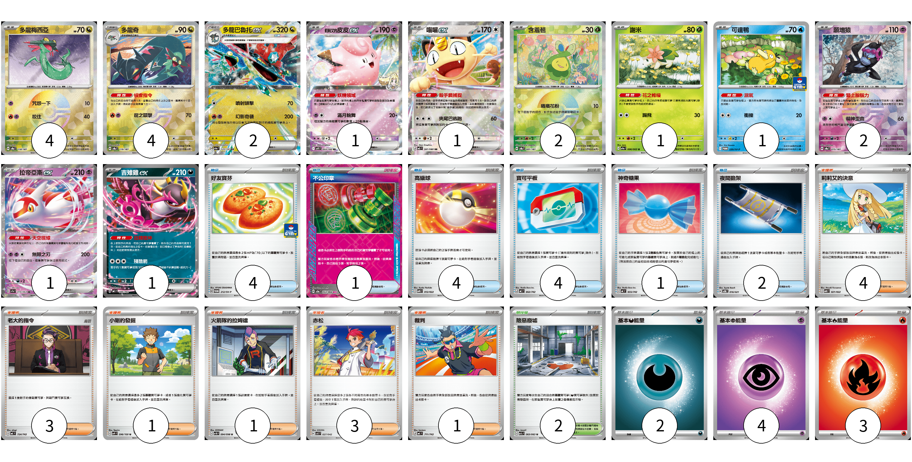 牌組構築方案 以此牌組為基礎新構築牌組 顯示卡面 顯示列表 寶可夢卡(20) 4 4 2 1 1 2 1 1 2 1 1 物品卡(16) 4 1 4 4 1 2 支援者卡(13) 4 3 1 1 3 1 競技場卡(2) 2 能量卡(9) 2 4 3 寶可夢卡(20) 卡牌名稱 張數 卡牌名稱 張數 多龍梅西亞 SV8a 118/187 04 多龍奇 SV8a 119/187 04 多龍巴魯托ex SV8a 120/187 02 莉莉艾的皮皮ex SV9 033/100 01 喵喵ex M3 061/080 01 含羞苞 SV8a 001/187 02 謝米 SV9a 006/063 01 可達鴨 SV-P 220/SV-P 01 願增猿 SV8a 075/187 02 拉帝亞斯ex SV7a 019/064 01 吉雉雞ex MC 489/742 01 物品卡(16) 卡牌名稱 張數 卡牌名稱 張數 好友寶芬 SV-P 212/SV-P 04 不公印章 SV5a 053/066 01 高級球 MBG 012/022 04 寶可平板 MC 662/742 04 神奇糖果 MC 655/742 01 夜間擔架 SVOM 016/021 02 支援者卡(13) 卡牌名稱 張數 卡牌名稱 張數 莉莉艾的決意 MBD 021/022 04 老大的指令 MC 724/742 03 小剛的發掘 SV9 096/100 01 火箭隊的拉姆達 SV10 094/098 01 赤松 SVK 027/042 03 裁判 MC 711/742 01 競技場卡(2) 卡牌名稱 張數 卡牌名稱 張數 險惡廢墟 M1L 063/063 02 能量卡(9) 卡牌名稱 張數 卡牌名稱 張數 基本【惡】能量 MC DAR 02 基本【超】能量 MBD PSY 04 基本【火】能量 MC FIR 03 以此牌組為基礎新構築牌組 牌組編碼 lsnlMe-vmjlTA-ZIFBfc copy 列印牌組單 牌組編碼已複製 分享至SNS