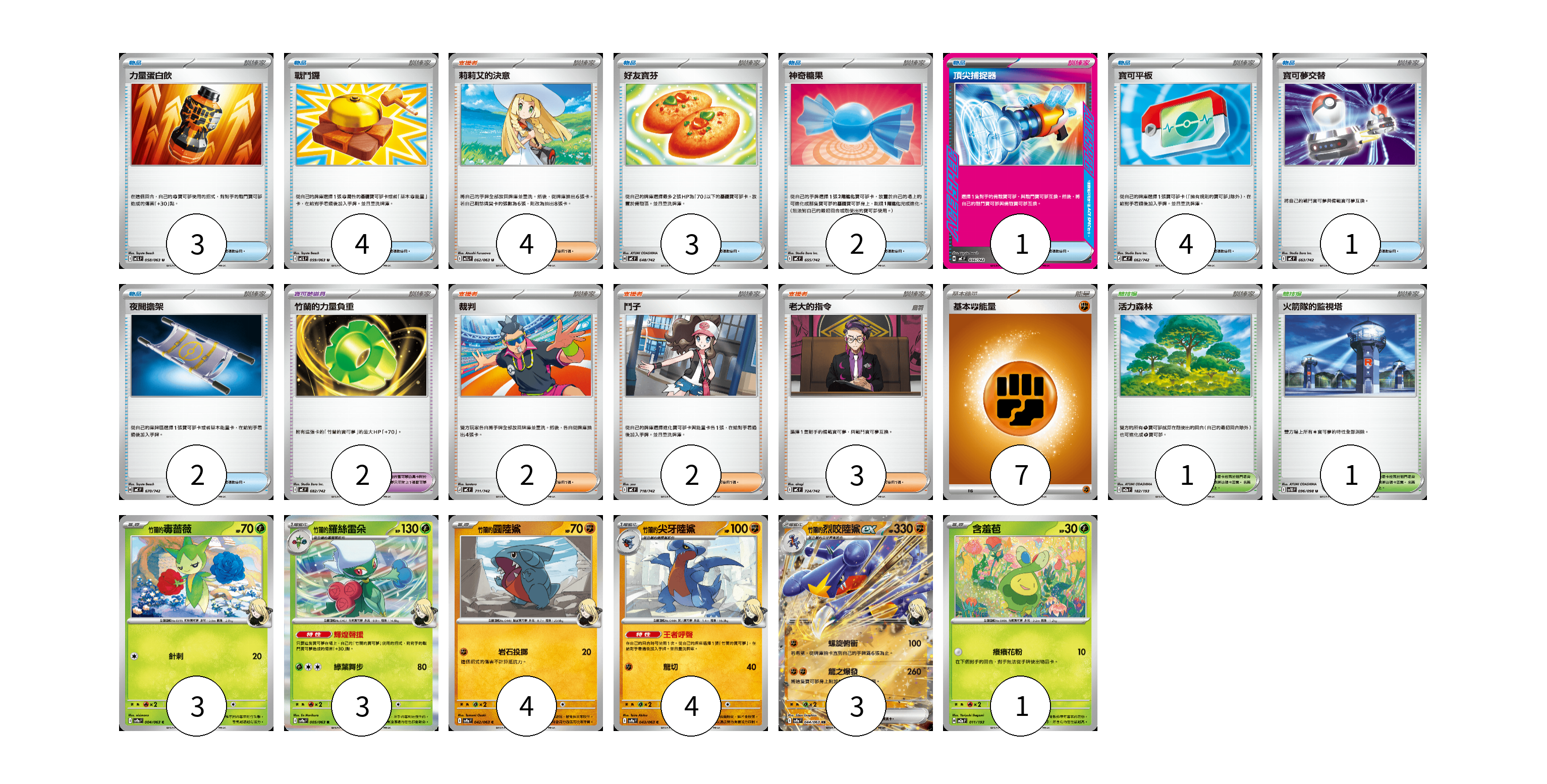 牌組構築方案 以此牌組為基礎新構築牌組 顯示卡面 顯示列表 寶可夢卡(18) 3 3 4 4 3 1 寶可夢道具(2) 2 物品卡(20) 3 4 3 2 1 4 1 2 支援者卡(11) 4 2 2 3 競技場卡(2) 1 1 能量卡(7) 7 寶可夢卡(18) 卡牌名稱 張數 卡牌名稱 張數 <竹蘭的>毒薔薇 SV9a 004/063 03 <竹蘭的>羅絲雷朵 SV9a 005/063 03 <竹蘭的>圓陸鯊 SV9a 042/063 04 <竹蘭的>尖牙陸鯊 SV9a 043/063 04 <竹蘭的>烈咬陸鯊ex SV9a 044/063 03 含羞苞 M2a 011/193 01 寶可夢道具(2) 卡牌名稱 張數 卡牌名稱 張數 竹蘭的力量負重 MC 682/742 02 物品卡(20) 卡牌名稱 張數 卡牌名稱 張數 力量蛋白飲 M1L 058/063 03 戰鬥鑼 M1L 059/063 04 好友寶芬 MC 648/742 03 神奇糖果 MC 655/742 02 頂尖捕捉器 MC 656/742 01 寶可平板 MC 662/742 04 寶可夢交替 MC 663/742 01 夜間擔架 MC 670/742 02 支援者卡(11) 卡牌名稱 張數 卡牌名稱 張數 莉莉艾的決意 M1L 062/063 04 裁判 MC 711/742 02 鬥子 MC 718/742 02 老大的指令 MC 724/742 03 競技場卡(2) 卡牌名稱 張數 卡牌名稱 張數 活力森林 M2a 182/193 01 火箭隊的監視塔 SV10 096/098 01 能量卡(7) 卡牌名稱 張數 卡牌名稱 張數 基本【鬥】能量 MC FIG 07 以此牌組為基礎新構築牌組 牌組編碼 ltAMuL-OSHTzd-aDwIVA copy 列印牌組單 牌組編碼已複製 分享至SNS
