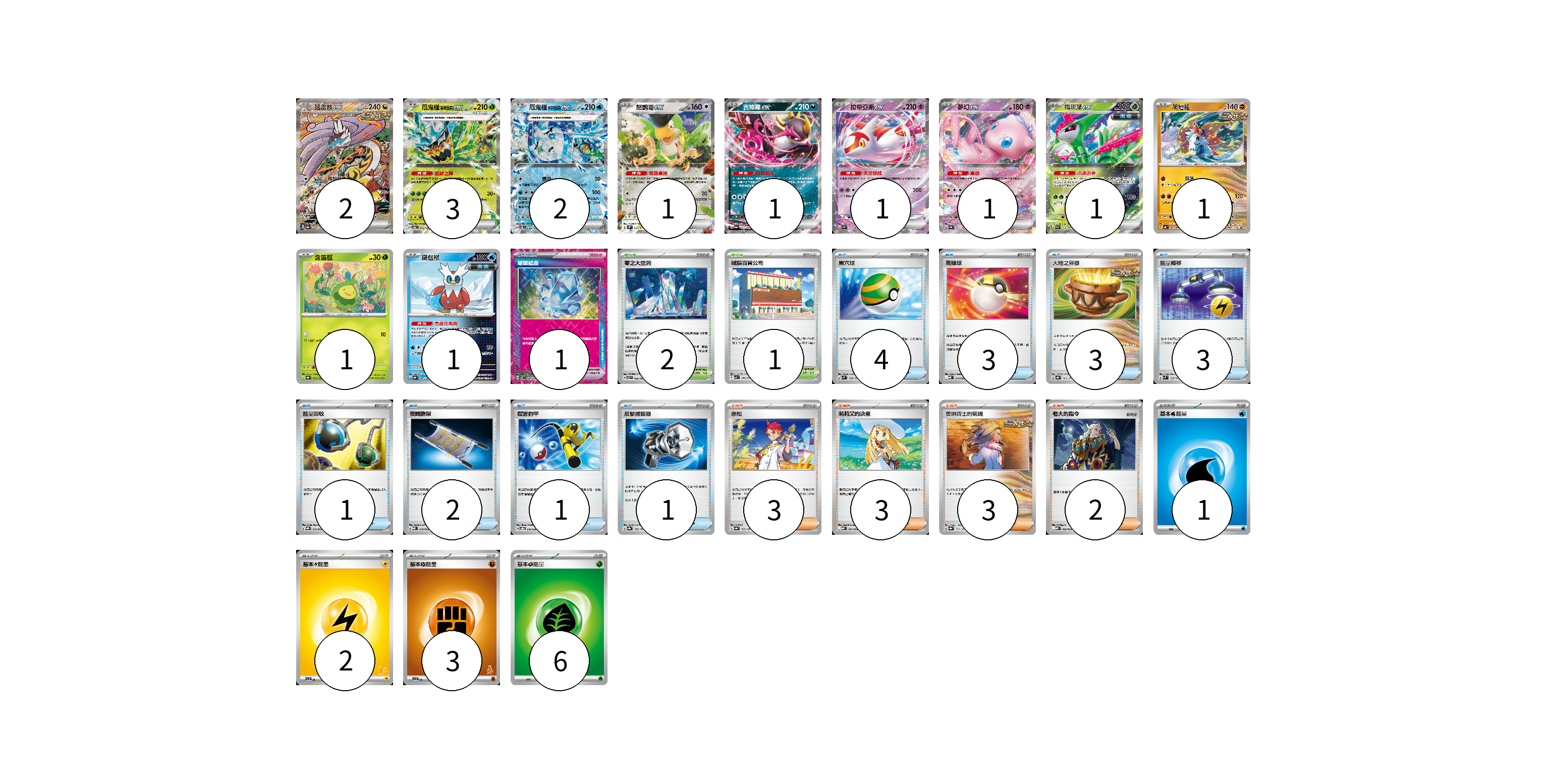牌組構築方案 以此牌組為基礎新構築牌組 顯示卡面 顯示列表 寶可夢卡(15) 2 3 2 1 1 1 1 1 1 1 1 寶可夢道具(1) 1 物品卡(18) 4 3 3 3 1 2 1 1 支援者卡(11) 3 3 3 2 競技場卡(3) 2 1 能量卡(12) 1 2 3 6 寶可夢卡(15) 卡牌名稱 張數 卡牌名稱 張數 猛雷鼓ex SV8a 222/187 02 厄鬼椪 碧草面具ex SV6 016/101 03 厄鬼椪 水井面具ex SV6 038/101 02 怒鸚哥ex SV2P 065/071 01 吉雉雞ex SV6a 038/064 01 拉帝亞斯ex SV7a 019/064 01 夢幻ex SV2a 151/165 01 鐵斑葉ex SV5M 016/071 01 爬地翅 SV4K 041/066 01 含羞苞 SV8a 001/187 01 鐵包袱 SV8a 047/187 01 寶可夢道具(1) 卡牌名稱 張數 卡牌名稱 張數 璀璨結晶 SV7 094/102 01 物品卡(18) 卡牌名稱 張數 卡牌名稱 張數 巢穴球 SVM 133/175 04 高級球 MBD 014/022 03 大地之容器 SV8a 143/187 03 能量轉移 SVM 127/175 03 能量回收 SVQL 012/022 01 夜間擔架 MBD 016/022 02 厲害釣竿 SVOD 010/020 01 反擊捕捉器 SV8a 139/187 01 支援者卡(11) 卡牌名稱 張數 卡牌名稱 張數 赤松 SV8a 163/187 03 莉莉艾的決意 MBD 021/022 03 奧琳博士的氣魄 SV8a 167/187 03 老大的指令 MBD 020/022 02 競技場卡(3) 卡牌名稱 張數 卡牌名稱 張數 零之大空洞 SV7 102/102 02 城鎮百貨公司 SV3 107/108 01 能量卡(12) 卡牌名稱 張數 卡牌名稱 張數 基本【水】能量 SVF WAT 01 基本【雷】能量 SVI LIG 02 基本【鬥】能量 SVI FIG 03 基本【草】能量 SVTM GRA 06 以此牌組為基礎新構築牌組 牌組編碼 lwLvxB-suREAt-JRiBhK copy 列印牌組單 牌組編碼已複製 分享至SNS