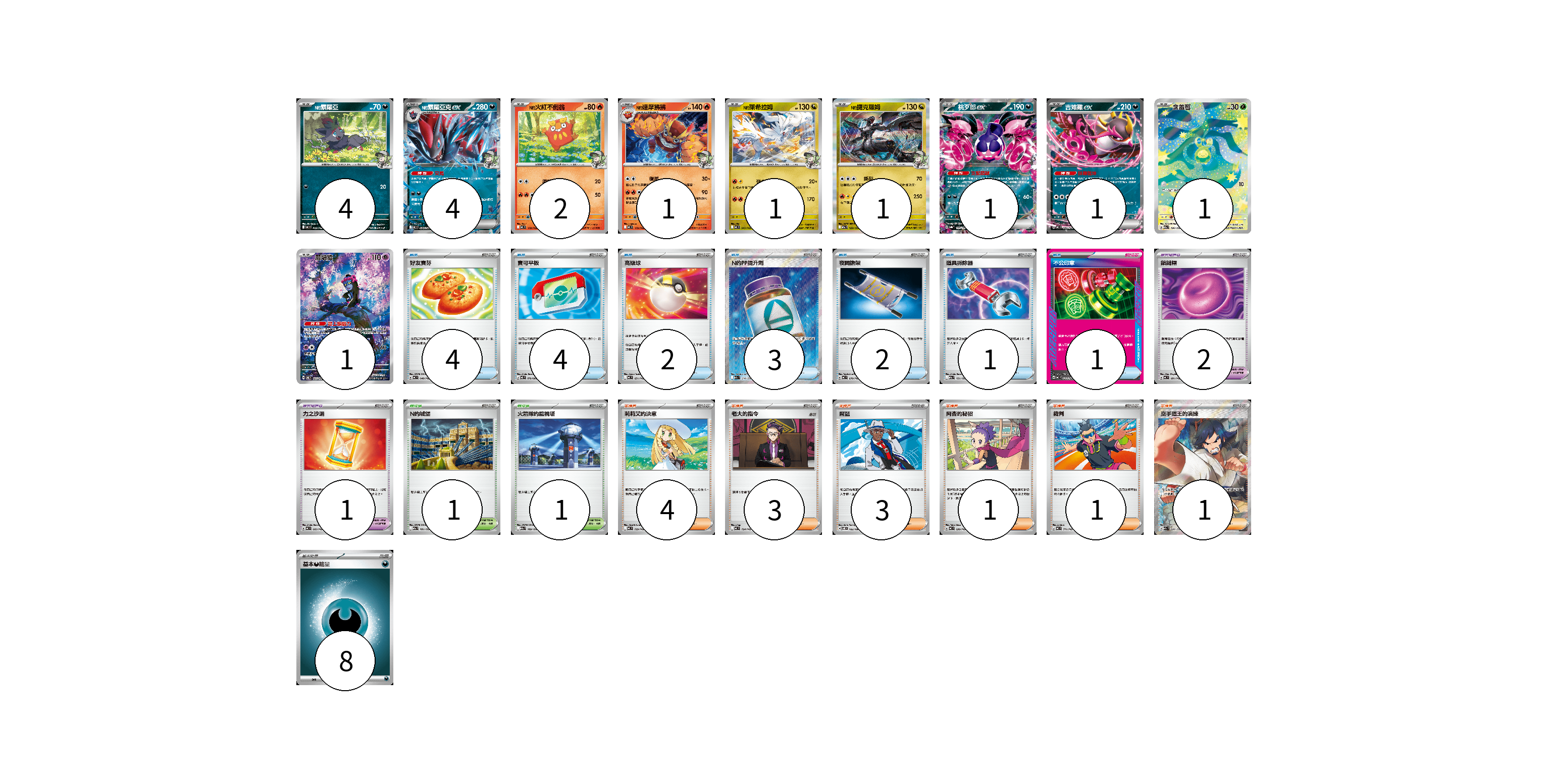 牌組構築方案 以此牌組為基礎新構築牌組 顯示卡面 顯示列表 寶可夢卡(17) 4 4 2 1 1 1 1 1 1 1 寶可夢道具(3) 2 1 物品卡(17) 4 4 2 3 2 1 1 支援者卡(13) 4 3 3 1 1 1 競技場卡(2) 1 1 能量卡(8) 8 寶可夢卡(17) 卡牌名稱 張數 卡牌名稱 張數 <N的>索羅亞 MC 469/742 04 <N的>索羅亞克ex MC 470/742 04 N的火紅不倒翁 MC 118/742 02 N的達摩狒狒 MC 119/742 01 <N的>萊希拉姆 MC 545/742 01 N的捷克羅姆 M2a 129/193 01 桃歹郎ex SV8a 105/187 01 吉雉雞ex MC 489/742 01 含羞苞 M2a 196/193 01 願增猿 SV6 107/101 01 寶可夢道具(3) 卡牌名稱 張數 卡牌名稱 張數 鎖鏈糬 MC 681/742 02 力之沙漏 MC 683/742 01 物品卡(17) 卡牌名稱 張數 卡牌名稱 張數 好友寶芬 MC 648/742 04 寶可平板 M3 070/080 04 高級球 MC 651/742 02 N的PP提升劑 M2a 214/193 03 夜間擔架 MC 670/742 02 道具拆除器 M2a 151/193 01 不公印章 MC 633/742 01 支援者卡(13) 卡牌名稱 張數 卡牌名稱 張數 莉莉艾的決意 MC 729/742 04 老大的指令 MC 724/742 03 席藍 SV8 102/106 03 阿杏的秘招 MC 699/742 01 裁判 MC 711/742 01 空手道王的演練 M2a 220/193 01 競技場卡(2) 卡牌名稱 張數 卡牌名稱 張數 N的城堡 M2a 181/193 01 火箭隊的監視塔 M2a 189/193 01 能量卡(8) 卡牌名稱 張數 卡牌名稱 張數 基本【惡】能量 MC DAR 08 以此牌組為基礎新構築牌組 牌組編碼 lwvKZl-lIBhgi-OoMzvR copy 列印牌組單 牌組編碼已複製 分享至SNS