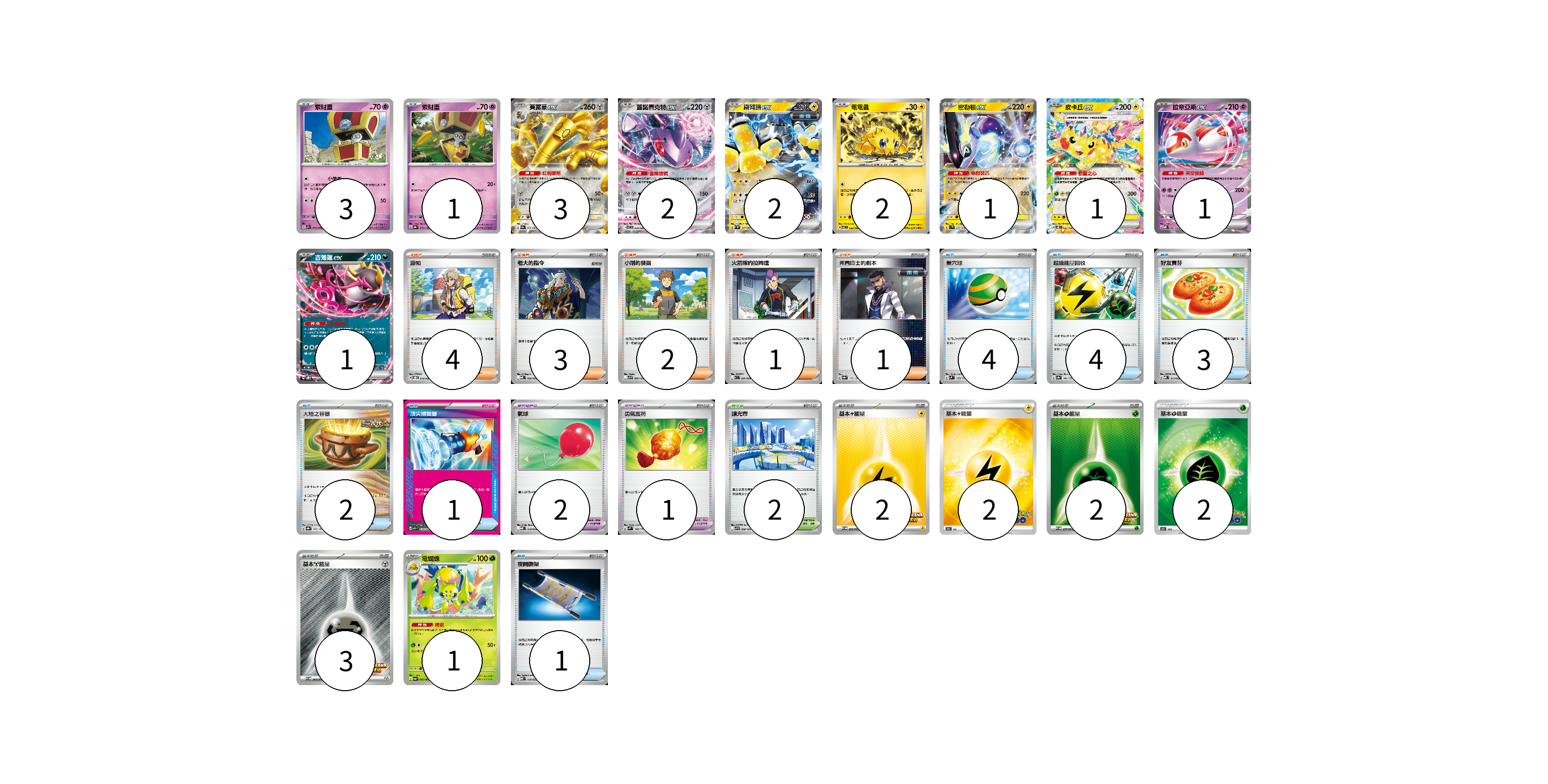 牌組構築方案 以此牌組為基礎新構築牌組 顯示卡面 顯示列表 寶可夢卡(18) 3 1 3 2 2 2 1 1 1 1 1 寶可夢道具(3) 2 1 物品卡(15) 4 4 3 2 1 1 支援者卡(11) 4 3 2 1 1 競技場卡(2) 2 能量卡(11) 2 2 2 2 3 寶可夢卡(18) 卡牌名稱 張數 卡牌名稱 張數 索財靈 SV7a 024/064 03 索財靈 SV8a 073/187 01 賽富豪ex SV3a 050/062 03 蓋諾賽克特ex SV11B 069/086 02 鐵臂膀ex SV4M 027/066 02 電電蟲 SV7 032/102 02 密勒頓ex SV1V 037/078 01 皮卡丘ex SV8 033/106 01 拉帝亞斯ex MBD 003/022 01 吉雉雞ex SVOD 004/020 01 電蜘蛛 SV6a 002/064 01 寶可夢道具(3) 卡牌名稱 張數 卡牌名稱 張數 氣球 MBD 018/022 02 勇氣護符 SVM 142/175 01 物品卡(15) 卡牌名稱 張數 卡牌名稱 張數 巢穴球 SVM 133/175 04 超級能量回收 SV8a 141/187 04 好友寶芬 MBD 013/022 03 大地之容器 SV8a 143/187 02 頂尖捕捉器 MBG 014/022 01 夜間擔架 MBD 016/022 01 支援者卡(11) 卡牌名稱 張數 卡牌名稱 張數 派帕 SVOD 018/020 04 老大的指令 MBD 020/022 03 小剛的發掘 SV9 096/100 02 火箭隊的拉姆達 SV10 094/098 01 弗圖博士的劇本 SV8a 175/187 01 競技場卡(2) 卡牌名稱 張數 卡牌名稱 張數 釀光市 SV9 098/100 02 能量卡(11) 卡牌名稱 張數 卡牌名稱 張數 基本【雷】能量 SV-P 260/SV-P 02 基本雷能量 S10b LIG 02 基本【草】能量 SV-P 257/SV-P 02 基本草能量 S10b GRA 02 基本【鋼】能量 SV-P 264/SV-P 03 以此牌組為基礎新構築牌組 牌組編碼 lxjRba-pwNkRE-wRgawQ copy 列印牌組單 牌組編碼已複製 分享至SNS