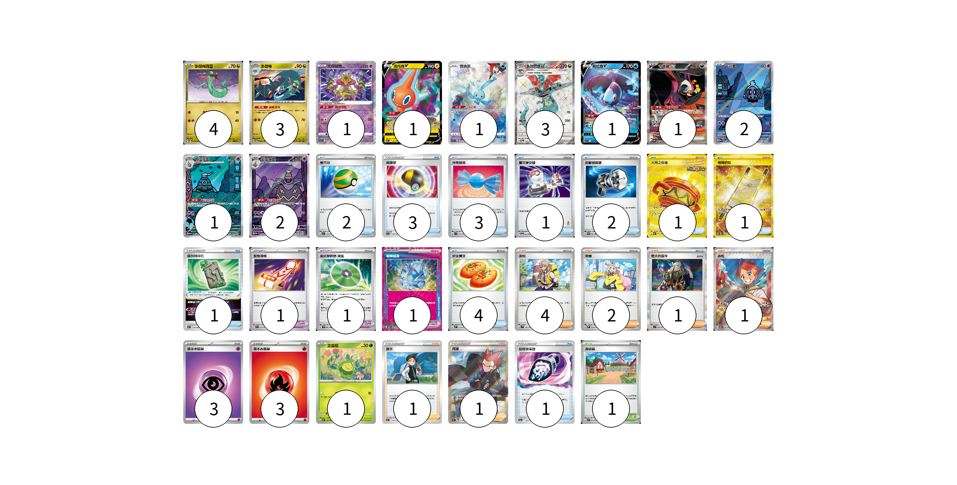 牌組構築方案 以此牌組為基礎新構築牌組 顯示卡面 顯示列表 寶可夢卡(21) 4 3 1 1 1 3 1 1 2 1 2 1 寶可夢道具(3) 1 1 1 物品卡(19) 2 3 3 1 2 1 1 1 4 1 支援者卡(10) 4 2 1 1 1 1 競技場卡(1) 1 能量卡(6) 3 3 寶可夢卡(21) 卡牌名稱 張數 卡牌名稱 張數 多龍梅西亞 SV6 079/101 04 多龍奇 SV6 080/101 03 光輝胡地 S11a 031/068 01 洛托姆V S11 037/100 01 瑪納霏 S12a 178/172 01 多龍巴魯托ex SV6 120/101 03 霓虹魚V S9 030/100 01 吉雉雞ex SV6a 089/064 01 夜巡靈 SV6a 068/064 02 彷徨夜靈 SV6a 069/064 01 黑夜魔靈 SV6a 070/064 02 含羞苞 SV8a 001/187 01 寶可夢道具(3) 卡牌名稱 張數 卡牌名稱 張數 緊急滑板 SVK 023/042 01 招式學習器 演進 SV4M 063/066 01 璀璨結晶 SV7 094/102 01 物品卡(19) 卡牌名稱 張數 卡牌名稱 張數 巢穴球 SV1S 070/078 02 高級球 S9 089/100 03 神奇糖果 SV1V 072/078 03 寶可夢交替 SVI 054/066 01 反擊捕捉器 SV4M 059/066 02 大地之容器 SV6a 093/064 01 夜間擔架 SV8 137/106 01 森林封印石 SVF 024/038 01 好友寶芬 SVK 015/042 04 放逐吸塵器 S12a 144/172 01 支援者卡(10) 卡牌名稱 張數 卡牌名稱 張數 派帕 SV1V 076/078 04 奇樹 SV2D 069/071 02 老大的指令 SV1a 069/073 01 赤松 SV7 123/102 01 捩木 S11 097/100 01 阿渡 S12 114/098 01 競技場卡(1) 卡牌名稱 張數 卡牌名稱 張數 深缽鎮 SVK 039/042 01 能量卡(6) 卡牌名稱 張數 卡牌名稱 張數 基本【超】能量 SVEM PSY 03 基本【火】能量 SVEL FIR 03 以此牌組為基礎新構築牌組 牌組編碼 lyxUrF-kbvoPO-IOrrwz copy 列印牌組單 牌組編碼已複製 分享至SNS