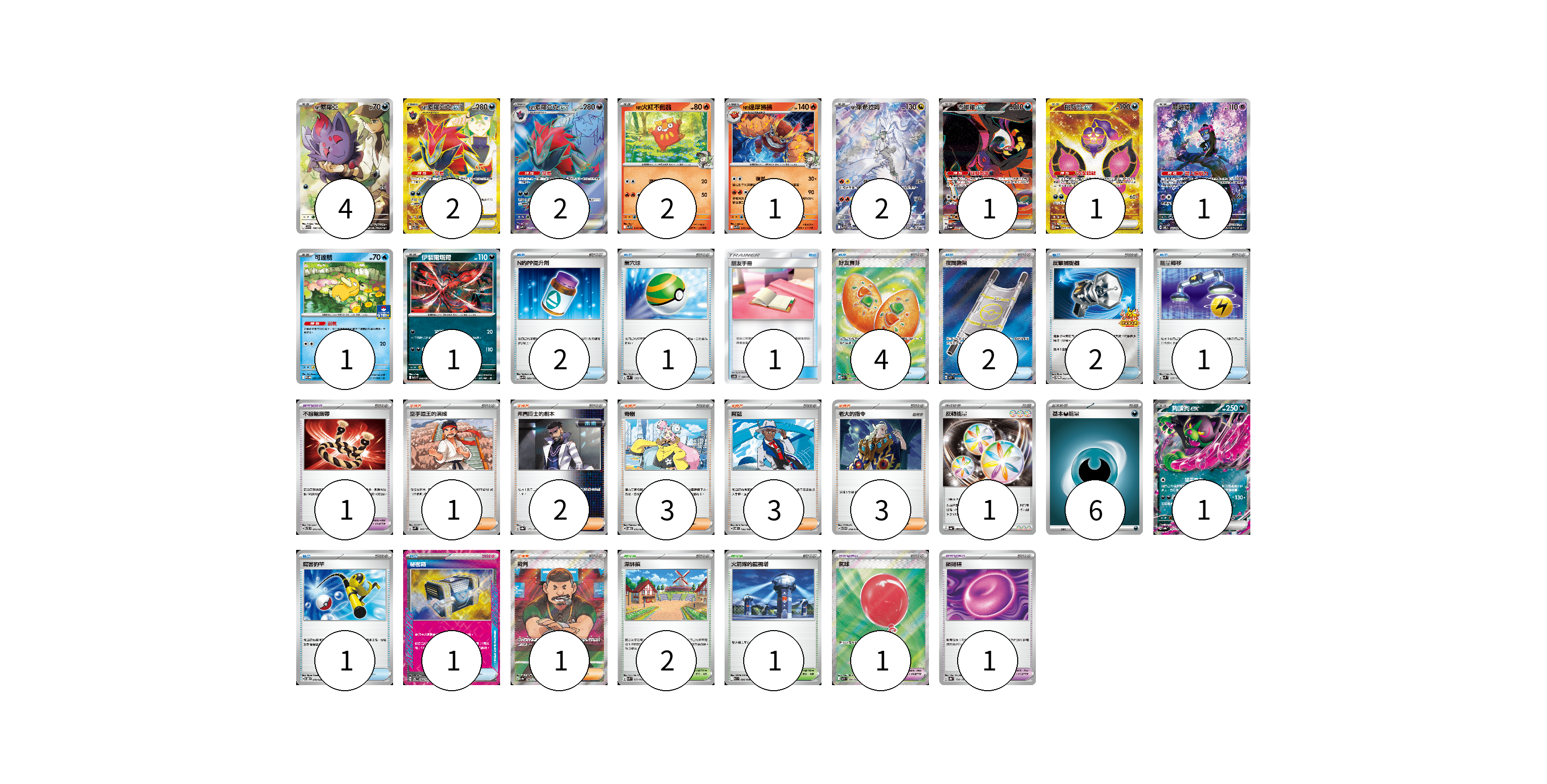 牌組構築方案 以此牌組為基礎新構築牌組 顯示卡面 顯示列表 寶可夢卡(19) 4 2 2 2 1 2 1 1 1 1 1 1 寶可夢道具(3) 1 1 1 物品卡(15) 2 1 1 4 2 2 1 1 1 支援者卡(13) 1 2 3 3 3 1 競技場卡(3) 2 1 能量卡(7) 1 6 寶可夢卡(19) 卡牌名稱 張數 卡牌名稱 張數 N的索羅亞 SV9 108/100 04 N的索羅亞克ex SV9 131/100 02 N的索羅亞克ex SV9 117/100 02 N的火紅不倒翁 SV9 015/100 02 N的達摩狒狒 SV9 016/100 01 N的萊希拉姆 SV9 109/100 02 吉雉雞ex SV6a 089/064 01 桃歹郎ex SV6a 092/064 01 願增猿 SV6 107/101 01 可達鴨 SV-P 220/SV-P 01 伊裴爾塔爾 M1L 040/063 01 夠讚狗ex SV8a 102/187 01 寶可夢道具(3) 卡牌名稱 張數 卡牌名稱 張數 不服輸頭帶 SVTL 016/021 01 氣球 M1L 084/063 01 鎖鏈糬 SV8a 154/187 01 物品卡(15) 卡牌名稱 張數 卡牌名稱 張數 N的PP提升劑 SV9 089/100 02 巢穴球 SVM 133/175 01 朋友手冊 AS6b 188/194 01 好友寶芬 M1S 081/063 04 夜間擔架 M1L 083/063 02 反擊捕捉器 SV-P 083/SV-P 02 能量轉移 SVM 127/175 01 厲害釣竿 SVOD 010/020 01 秘密箱 SV6 092/101 01 支援者卡(13) 卡牌名稱 張數 卡牌名稱 張數 空手道王的演練 SVM 146/175 01 弗圖博士的劇本 SV8a 175/187 02 奇樹 SVOD 016/020 03 席藍 SV8 102/106 03 老大的指令 SVTG 019/019 03 裁判 SV4a 342/190 01 競技場卡(3) 卡牌名稱 張數 卡牌名稱 張數 深缽鎮 SVK 039/042 02 火箭隊的監視塔 SV10 096/098 01 能量卡(7) 卡牌名稱 張數 卡牌名稱 張數 反轉能量 SV4a 189/190 01 基本【惡】能量 SVF DAR 06 以此牌組為基礎新構築牌組 牌組編碼 lzZHos-tgBBzU-rOmVcc copy 列印牌組單 牌組編碼已複製 分享至SNS