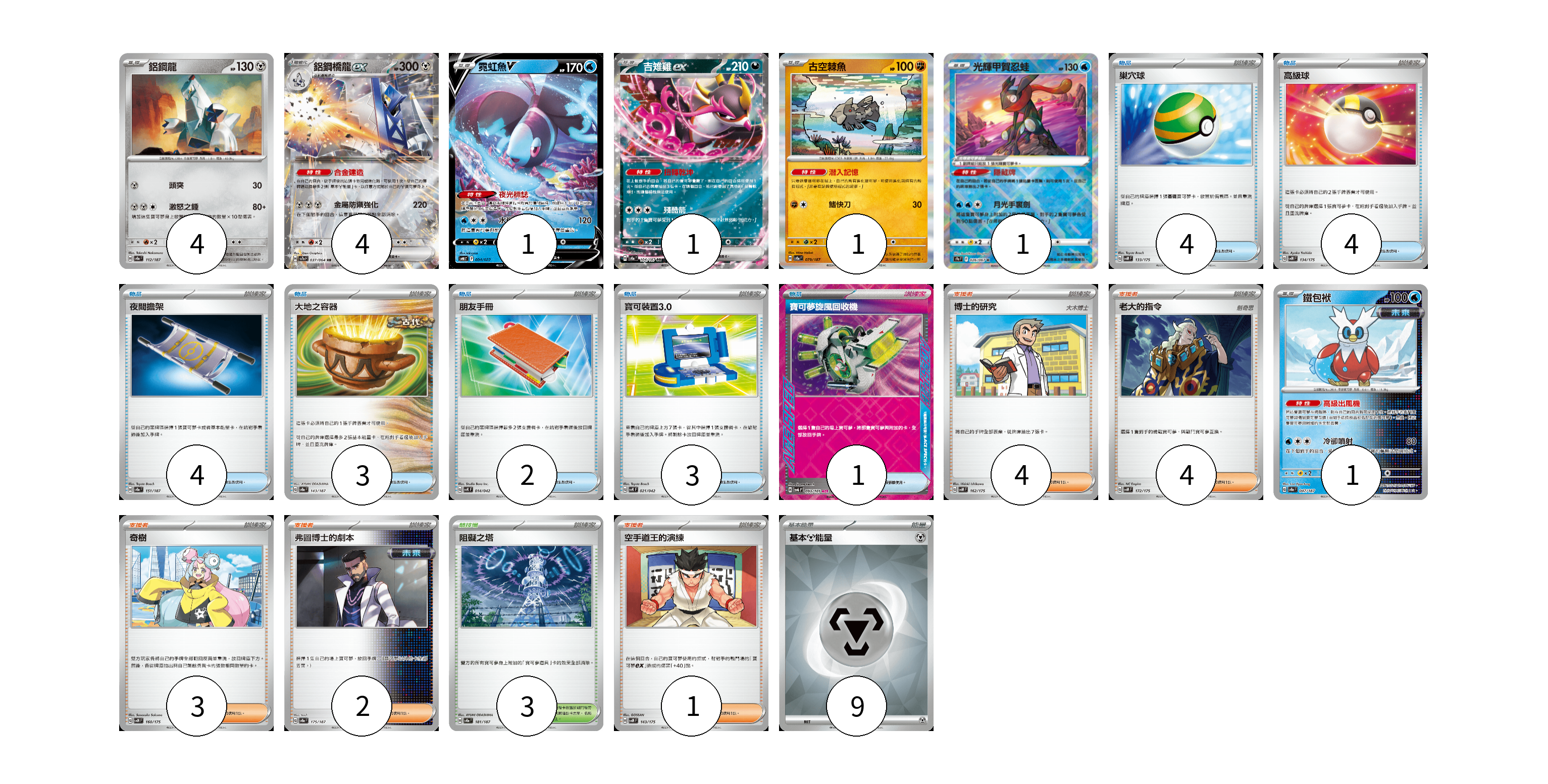牌組構築方案 以此牌組為基礎新構築牌組 顯示卡面 顯示列表 寶可夢卡(13) 4 4 1 1 1 1 1 物品卡(21) 4 4 4 3 2 3 1 支援者卡(14) 4 4 3 2 1 競技場卡(3) 3 能量卡(9) 9 寶可夢卡(13) 卡牌名稱 張數 卡牌名稱 張數 鋁鋼龍 SV8a 112/187 04 鋁鋼橋龍ex SV7a 037/064 04 霓虹魚V SVHK 004/022 01 吉雉雞ex SV8a 104/187 01 古空棘魚 SV8a 079/187 01 光輝甲賀忍蛙 S9a 026/067 01 鐵包袱 SV8a 047/187 01 物品卡(21) 卡牌名稱 張數 卡牌名稱 張數 巢穴球 SVM 133/175 04 高級球 SVM 134/175 04 夜間擔架 SV8a 151/187 04 大地之容器 SV8a 143/187 03 朋友手冊 SVK 014/042 02 寶可裝置3.0 SVK 021/042 03 寶可夢旋風回收機 SV6 093/101 01 支援者卡(14) 卡牌名稱 張數 卡牌名稱 張數 博士的研究 SVM 162/175 04 老大的指令 SVM 172/175 04 奇樹 SVM 160/175 03 弗圖博士的劇本 SV8a 175/187 02 空手道王的演練 SVM 143/175 01 競技場卡(3) 卡牌名稱 張數 卡牌名稱 張數 阻礙之塔 SV8a 181/187 03 能量卡(9) 卡牌名稱 張數 卡牌名稱 張數 基本【鋼】能量 SVK MET 09 以此牌組為基礎新構築牌組 牌組編碼 mDWwkC-KNFhNZ-OvBWGL copy 列印牌組單 牌組編碼已複製 分享至SNS