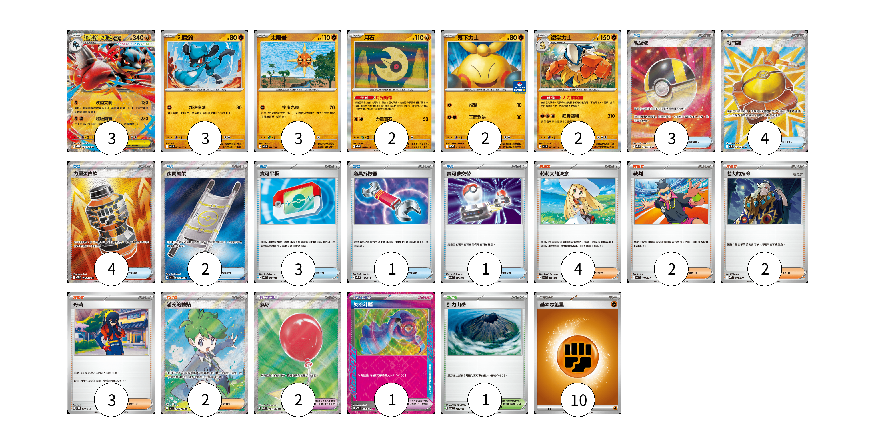 牌組構築方案 以此牌組為基礎新構築牌組 顯示卡面 顯示列表 寶可夢卡(15) 3 3 3 2 2 2 寶可夢道具(3) 2 1 物品卡(18) 3 4 4 2 3 1 1 支援者卡(13) 4 2 2 3 2 競技場卡(1) 1 能量卡(10) 10 寶可夢卡(15) 卡牌名稱 張數 卡牌名稱 張數 超級路卡利歐ex M1L 029/063 03 利歐路 M1L 028/063 03 太陽岩 MC 372/742 03 月石 M2a 086/193 02 幕下力士 M-P 015/M-P 02 鐵掌力士 M1L 025/063 02 寶可夢道具(3) 卡牌名稱 張數 卡牌名稱 張數 氣球 M1L 084/063 02 英雄斗篷 SV5M 064/071 01 物品卡(18) 卡牌名稱 張數 卡牌名稱 張數 高級球 M2a 216/193 03 戰鬥鑼 M1L 082/063 04 力量蛋白飲 M1L 081/063 04 夜間擔架 M1L 083/063 02 寶可平板 MC 662/742 03 道具拆除器 M2a 151/193 01 寶可夢交替 MBG 015/022 01 支援者卡(13) 卡牌名稱 張數 卡牌名稱 張數 莉莉艾的決意 MBG 022/022 04 裁判 MC 711/742 02 老大的指令 MBG 021/022 02 丹瑜 SVK 030/042 03 滿充的體貼 M1S 085/063 02 競技場卡(1) 卡牌名稱 張數 卡牌名稱 張數 引力山岳 M2a 183/193 01 能量卡(10) 卡牌名稱 張數 卡牌名稱 張數 基本【鬥】能量 MC FIG 10 以此牌組為基礎新構築牌組 牌組編碼 mDfWpD-UzUUgS-HyRMAN copy 列印牌組單 牌組編碼已複製 分享至SNS