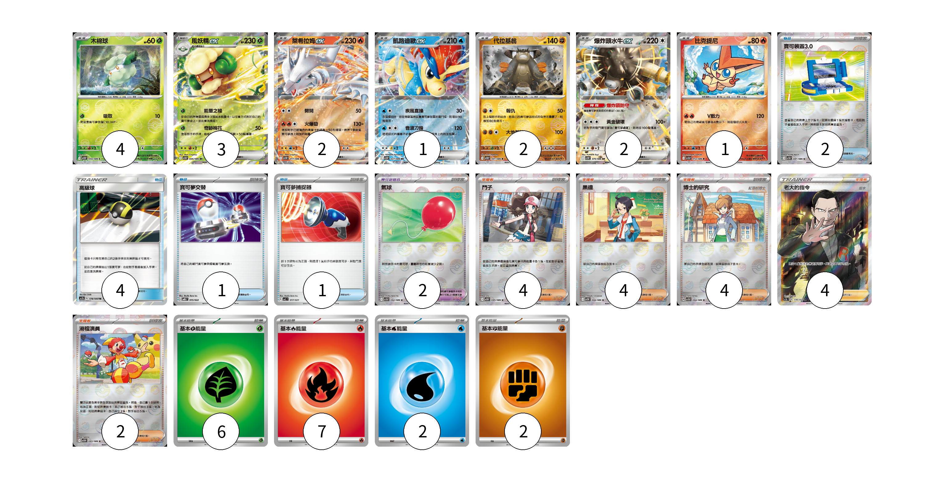 牌組構築方案 以此牌組為基礎新構築牌組 顯示卡面 顯示列表 寶可夢卡(15) 4 3 2 1 2 2 1 寶可夢道具(2) 2 物品卡(8) 2 4 1 1 支援者卡(18) 4 4 4 4 2 能量卡(17) 6 7 2 2 寶可夢卡(15) 卡牌名稱 張數 卡牌名稱 張數 木棉球 SV11W 004/086 04 風妖精ex SV11W 005/086 03 萊希拉姆ex SV11W 017/086 02 凱路迪歐ex SV11W 027/086 01 代拉基翁 SV11W 051/086 02 爆炸頭水牛ex SV11W 075/086 02 比克提尼 SV11B 012/086 01 寶可夢道具(2) 卡牌名稱 張數 卡牌名稱 張數 氣球 SV11B 082/086 02 物品卡(8) 卡牌名稱 張數 卡牌名稱 張數 寶可裝置3.0 SV11B 081/086 02 高級球 AS5b 178/186 04 寶可夢交替 MBG 015/022 01 寶可夢捕捉器 SVC 017/021 01 支援者卡(18) 卡牌名稱 張數 卡牌名稱 張數 鬥子 SV11W 085/086 04 黑連 SV11W 084/086 04 博士的研究 SV11B 084/086 04 老大的指令(坂木) SC1b 170/153 04 滑稽演員 SV11W 083/086 02 能量卡(17) 卡牌名稱 張數 卡牌名稱 張數 基本草能量 sv-p GRA 06 基本火能量 sv-p FIR 07 基本水能量 sv-p WAT 02 基本【鬥】能量 SVAM FIG 02 以此牌組為基礎新構築牌組 牌組編碼 mHdLhI-icXnTh-owMDWC copy 列印牌組單 牌組編碼已複製 分享至SNS
