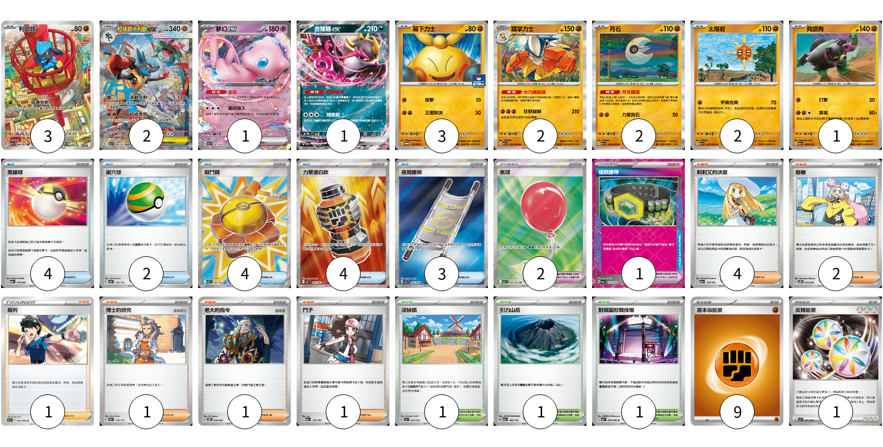牌組構築方案 以此牌組為基礎新構築牌組 顯示卡面 顯示列表 寶可夢卡(17) 3 2 1 1 3 2 2 2 1 寶可夢道具(3) 2 1 物品卡(17) 4 2 4 4 3 支援者卡(10) 4 2 1 1 1 1 競技場卡(3) 1 1 1 能量卡(10) 9 1 寶可夢卡(17) 卡牌名稱 張數 卡牌名稱 張數 利歐路 M1L 068/063 03 超級路卡利歐ex M1L 088/063 02 夢幻ex SVK 001/042 01 吉雉雞ex M2a 114/193 01 幕下力士 M-P 015/M-P 03 鐵掌力士 M1L 025/063 02 月石 M1L 026/063 02 太陽岩 M1L 027/063 02 夠讚狗 M2a 098/193 01 寶可夢道具(3) 卡牌名稱 張數 卡牌名稱 張數 氣球 M1L 084/063 02 極限腰帶 SV8a 159/187 01 物品卡(17) 卡牌名稱 張數 卡牌名稱 張數 高級球 MBD 014/022 04 巢穴球 SVM 133/175 02 戰鬥鑼 M1L 082/063 04 力量蛋白飲 M1L 081/063 04 夜間擔架 M1L 083/063 03 支援者卡(10) 卡牌名稱 張數 卡牌名稱 張數 莉莉艾的決意 M2a 175/193 04 奇樹 SVOD 016/020 02 裁判 S11a 063/068 01 博士的研究 SVM 170/175 01 老大的指令 SVOD 019/020 01 鬥子 M2a 172/193 01 競技場卡(3) 卡牌名稱 張數 卡牌名稱 張數 深缽鎮 SVK 039/042 01 引力山岳 M2a 183/193 01 對戰圓形競技場 M2 079/080 01 能量卡(10) 卡牌名稱 張數 卡牌名稱 張數 基本鬥能量 sv-p FIG 09 反轉能量 SVK 041/042 01 以此牌組為基礎新構築牌組 牌組編碼 mIBUGY-vfQvwL-fqLjTm copy 列印牌組單 牌組編碼已複製 分享至SNS