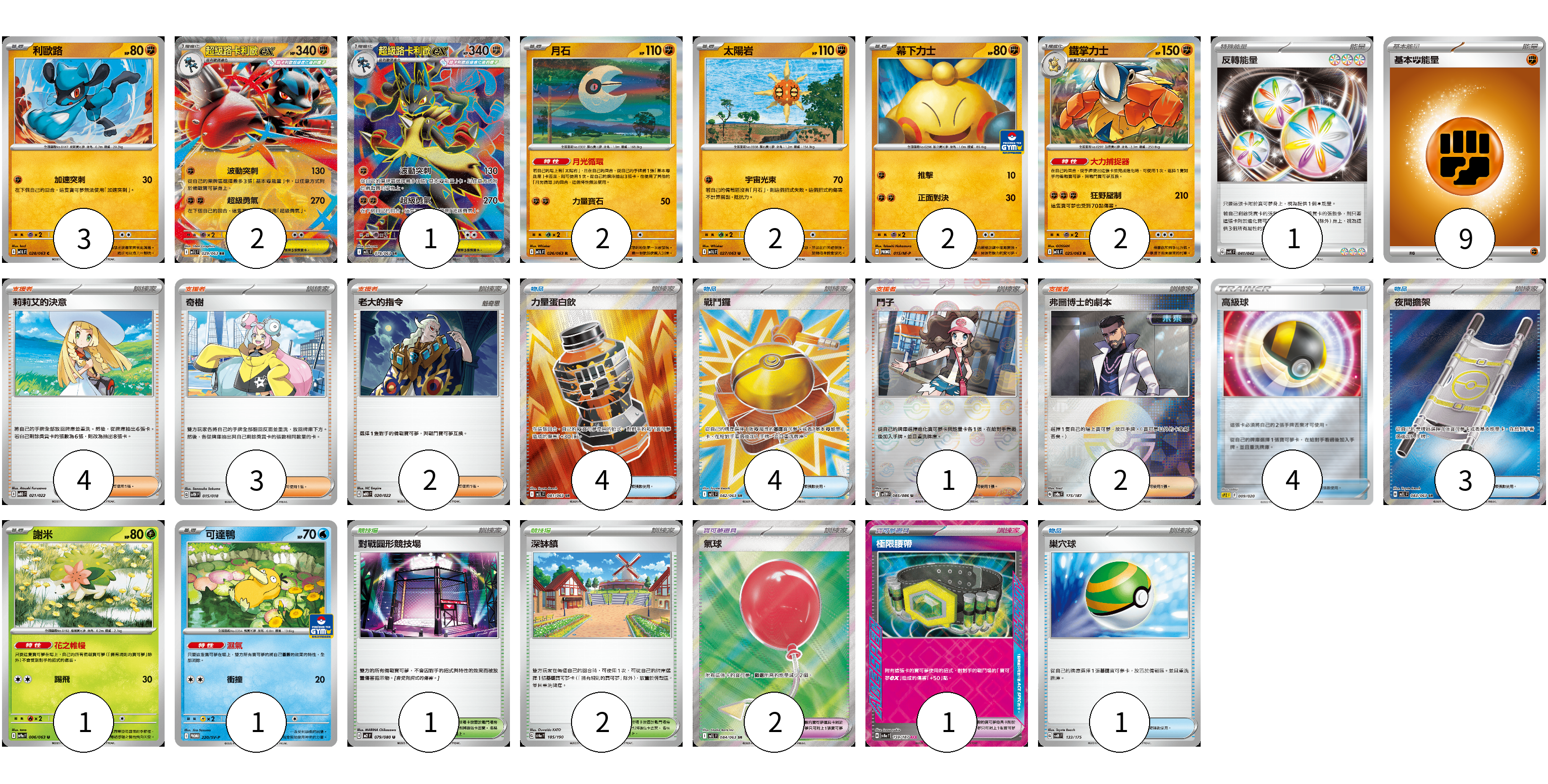 牌組構築方案 以此牌組為基礎新構築牌組 顯示卡面 顯示列表 寶可夢卡(16) 3 2 1 2 2 2 2 1 1 寶可夢道具(3) 2 1 物品卡(16) 4 4 4 3 1 支援者卡(12) 4 3 2 1 2 競技場卡(3) 1 2 能量卡(10) 1 9 寶可夢卡(16) 卡牌名稱 張數 卡牌名稱 張數 利歐路 M1L 028/063 03 超級路卡利歐ex M1L 029/063 02 超級路卡利歐ex M1L 078/063 01 月石 M1L 026/063 02 太陽岩 M1L 027/063 02 幕下力士 M-P 015/M-P 02 鐵掌力士 M1L 025/063 02 謝米 SV9a 006/063 01 可達鴨 SV-P 220/SV-P 01 寶可夢道具(3) 卡牌名稱 張數 卡牌名稱 張數 氣球 M1L 084/063 02 極限腰帶 SV8a 159/187 01 物品卡(16) 卡牌名稱 張數 卡牌名稱 張數 力量蛋白飲 M1L 081/063 04 戰鬥鑼 M1L 082/063 04 高級球 SPZ 009/020 04 夜間擔架 M1L 083/063 03 巢穴球 SVM 133/175 01 支援者卡(12) 卡牌名稱 張數 卡牌名稱 張數 莉莉艾的決意 MBD 021/022 04 奇樹 SVTH 015/018 03 老大的指令 MBD 020/022 02 鬥子 SV11W 085/086 01 弗圖博士的劇本 SV8a 175/187 02 競技場卡(3) 卡牌名稱 張數 卡牌名稱 張數 對戰圓形競技場 M2 079/080 01 深缽鎮 SV4a 185/190 02 能量卡(10) 卡牌名稱 張數 卡牌名稱 張數 反轉能量 SVK 041/042 01 基本【鬥】能量 M-P FIG 09 以此牌組為基礎新構築牌組 牌組編碼 mIDaUF-bDaIYT-SLydtA copy 列印牌組單 牌組編碼已複製 分享至SNS