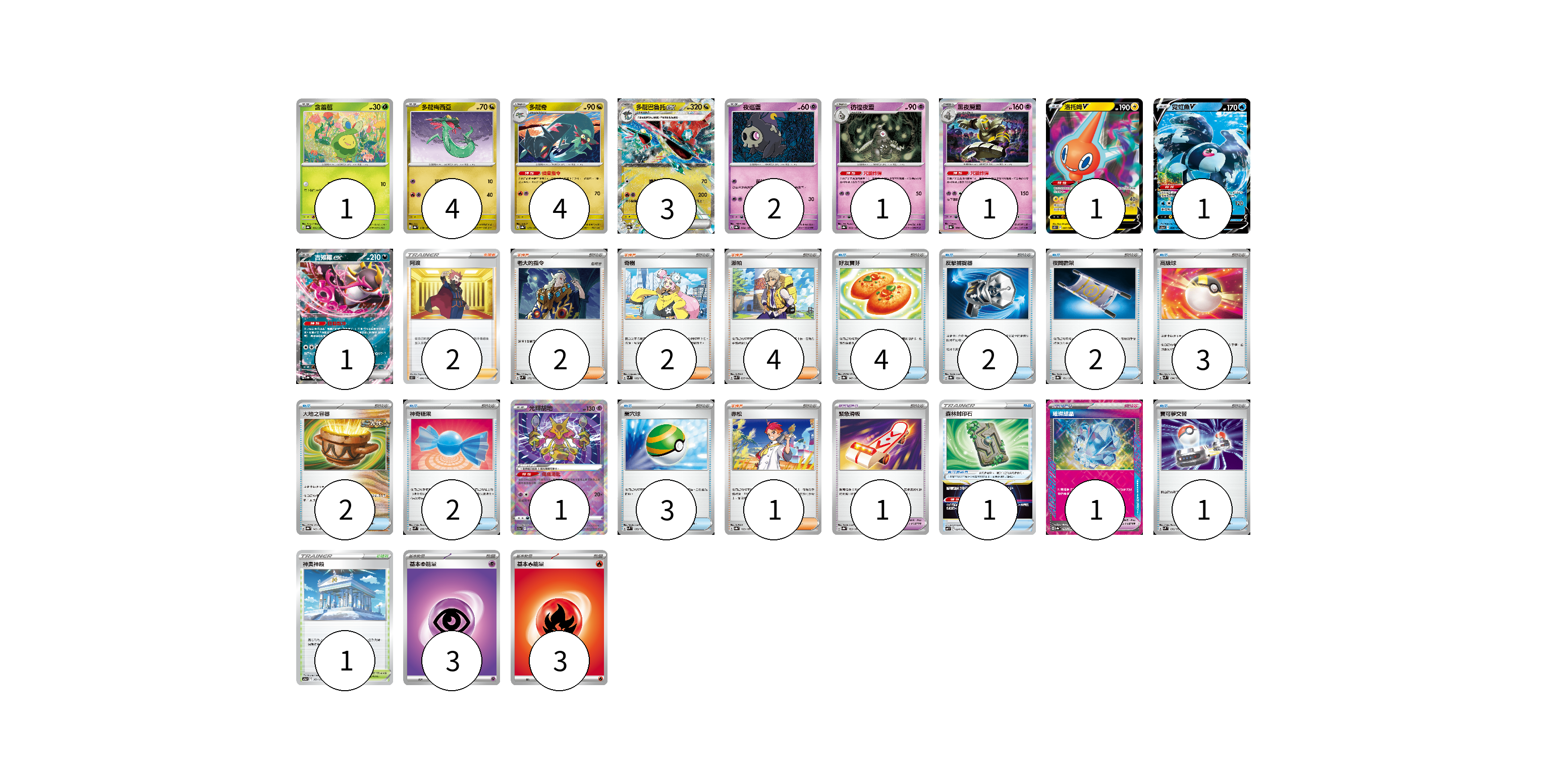 牌組構築方案 以此牌組為基礎新構築牌組 顯示卡面 顯示列表 寶可夢卡(20) 1 4 4 3 2 1 1 1 1 1 1 寶可夢道具(2) 1 1 物品卡(20) 4 2 2 3 2 2 3 1 1 支援者卡(11) 2 2 2 4 1 競技場卡(1) 1 能量卡(6) 3 3 寶可夢卡(20) 卡牌名稱 張數 卡牌名稱 張數 含羞苞 SV8a 001/187 01 多龍梅西亞 SV8a 118/187 04 多龍奇 SV8a 119/187 04 多龍巴魯托ex SV8a 120/187 03 夜巡靈 SV8a 064/187 02 彷徨夜靈 SV8a 065/187 01 黑夜魔靈 SV8a 066/187 01 洛托姆V S11 037/100 01 霓虹魚V S12a 026/172 01 吉雉雞ex SV8a 104/187 01 光輝胡地 S11a 031/068 01 寶可夢道具(2) 卡牌名稱 張數 卡牌名稱 張數 緊急滑板 SV8a 153/187 01 璀璨結晶 SV8a 152/187 01 物品卡(20) 卡牌名稱 張數 卡牌名稱 張數 好友寶芬 SV8a 147/187 04 反擊捕捉器 SV8a 139/187 02 夜間擔架 SV8a 151/187 02 高級球 SVM 134/175 03 大地之容器 SV8a 143/187 02 神奇糖果 SVM 135/175 02 巢穴球 SVM 133/175 03 森林封印石 SVF 024/038 01 寶可夢交替 SVM 136/175 01 支援者卡(11) 卡牌名稱 張數 卡牌名稱 張數 阿渡 S12 096/098 02 老大的指令 SVM 172/175 02 奇樹 SVM 160/175 02 派帕 SVK 035/042 04 赤松 SV8a 163/187 01 競技場卡(1) 卡牌名稱 張數 卡牌名稱 張數 神奧神殿 S12a 169/172 01 能量卡(6) 卡牌名稱 張數 卡牌名稱 張數 基本【超】能量 SVF PSY 03 基本【火】能量 SVF FIR 03 以此牌組為基礎新構築牌組 牌組編碼 mJMtKU-BZjGjf-fhqYeO copy 列印牌組單 牌組編碼已複製 分享至SNS