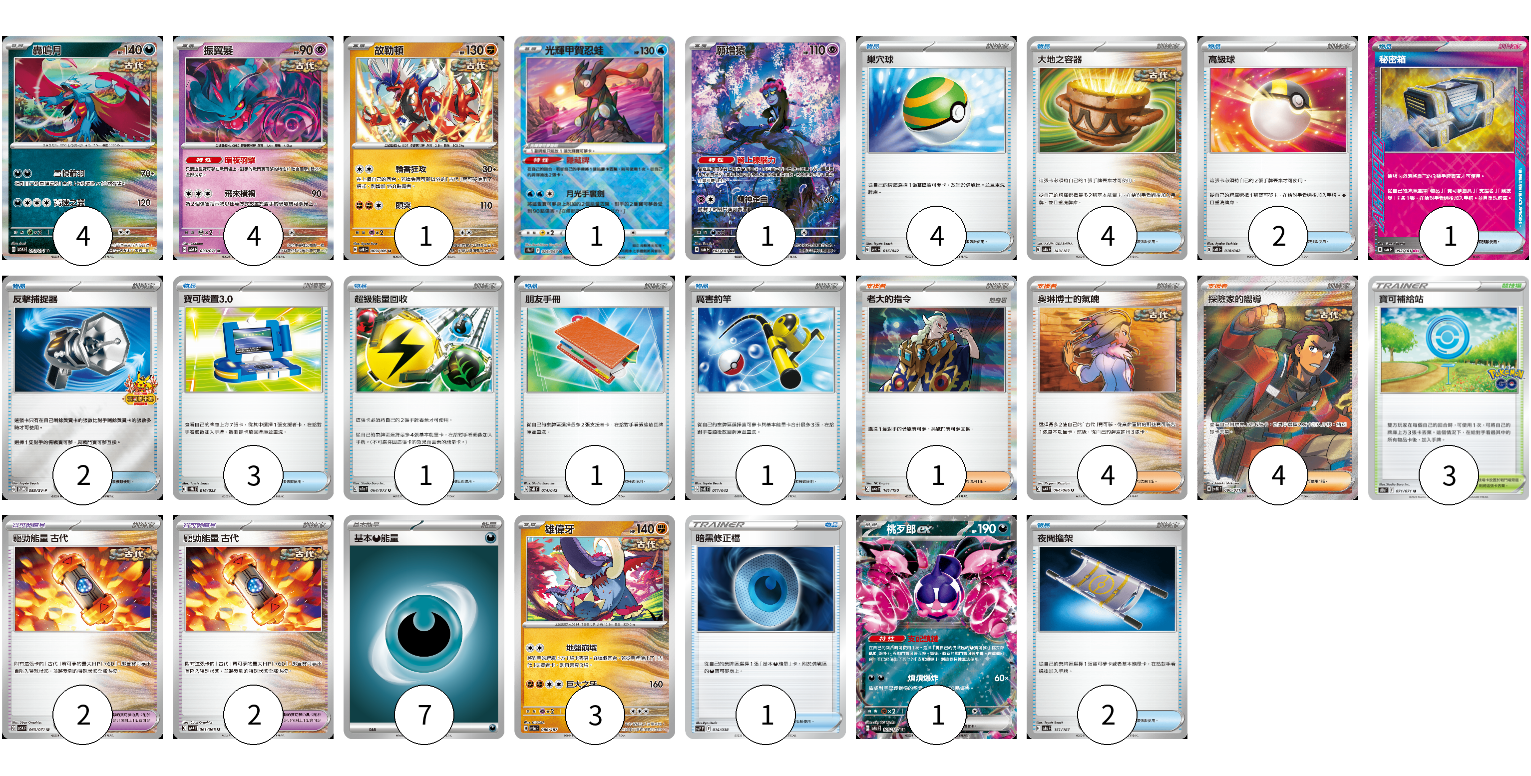 牌組構築方案 以此牌組為基礎新構築牌組 顯示卡面 顯示列表 寶可夢卡(15) 4 4 1 1 1 3 1 寶可夢道具(4) 2 2 物品卡(22) 4 4 2 1 2 3 1 1 1 1 2 支援者卡(9) 1 4 4 競技場卡(3) 3 能量卡(7) 7 寶可夢卡(15) 卡牌名稱 張數 卡牌名稱 張數 轟鳴月 SV5K 051/071 04 振翼髮 SV5K 033/071 04 故勒頓 SV8 069/106 01 光輝甲賀忍蛙 S9a 026/067 01 願增猿 SV6 107/101 01 雄偉牙 SV8a 086/187 03 桃歹郎ex SV8a 105/187 01 寶可夢道具(4) 卡牌名稱 張數 卡牌名稱 張數 驅勁能量 古代 SV5K 065/071 02 驅勁能量 古代 SV4K 061/066 02 物品卡(22) 卡牌名稱 張數 卡牌名稱 張數 巢穴球 SVK 016/042 04 大地之容器 SV8a 143/187 04 高級球 SVK 018/042 02 秘密箱 SV6 092/101 01 反擊捕捉器 SV-P 083/SV-P 02 寶可裝置3.0 SVAW 016/023 03 超級能量回收 SV1a 064/073 01 朋友手冊 SVK 014/042 01 厲害釣竿 SVK 011/042 01 暗黑修正檔 SVF 014/038 01 夜間擔架 SV8a 151/187 02 支援者卡(9) 卡牌名稱 張數 卡牌名稱 張數 老大的指令 SV4a 181/190 01 奧琳博士的氣魄 SV4K 064/066 04 探險家的嚮導 SV5K 090/071 04 競技場卡(3) 卡牌名稱 張數 卡牌名稱 張數 寶可補給站 S10b 071/071 03 能量卡(7) 卡牌名稱 張數 卡牌名稱 張數 基本【惡】能量 SVF DAR 07 以此牌組為基礎新構築牌組 牌組編碼 mOkiIE-evlksU-QvdxlD copy 列印牌組單 牌組編碼已複製 分享至SNS