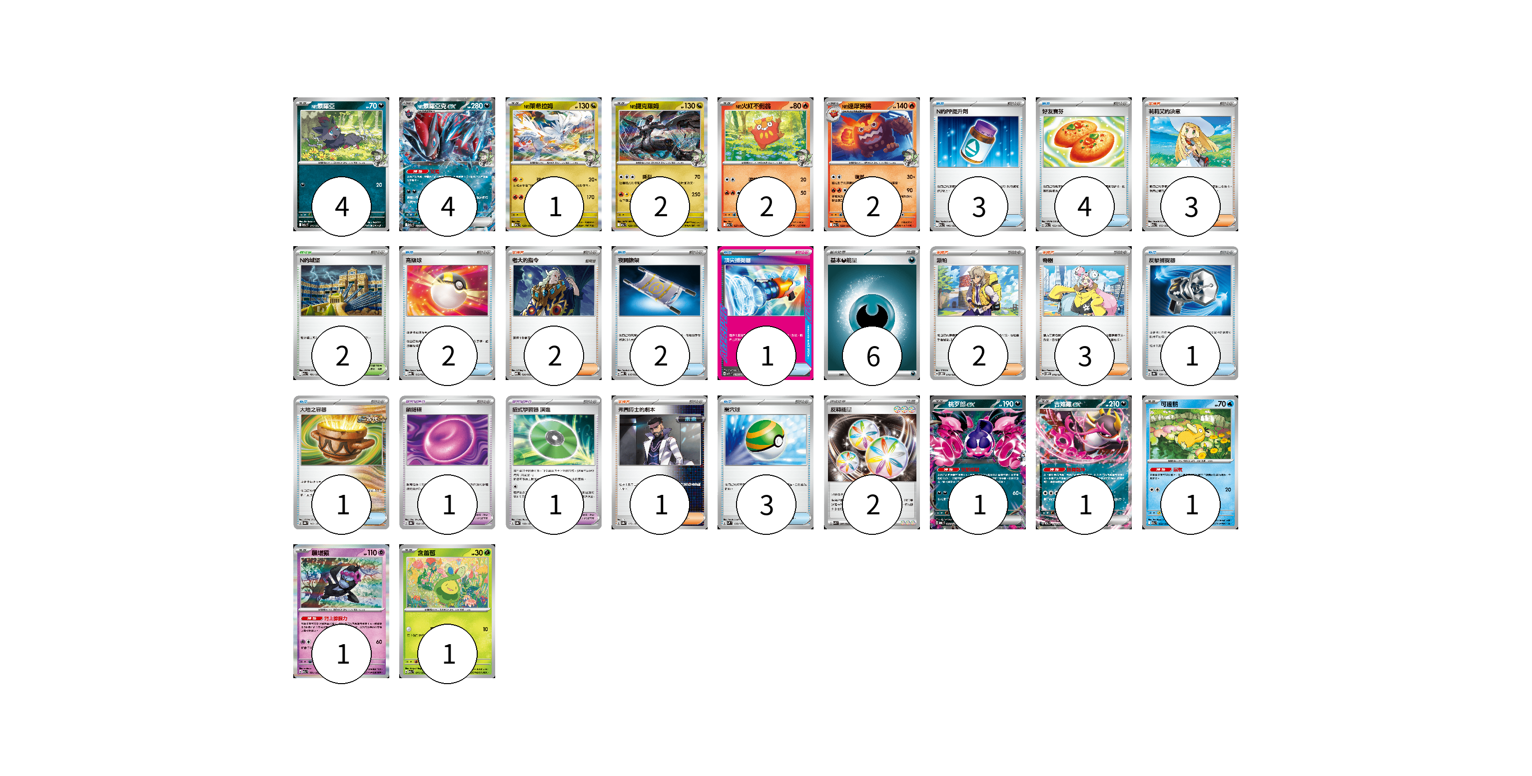 牌組構築方案 以此牌組為基礎新構築牌組 顯示卡面 顯示列表 寶可夢卡(20) 4 4 1 2 2 2 1 1 1 1 1 寶可夢道具(2) 1 1 物品卡(17) 3 4 2 2 1 1 1 3 支援者卡(11) 3 2 2 3 1 競技場卡(2) 2 能量卡(8) 6 2 寶可夢卡(20) 卡牌名稱 張數 卡牌名稱 張數 N的索羅亞 M2a 111/193 04 N的索羅亞克ex M2a 112/193 04 N的萊希拉姆 M2a 128/193 01 N的捷克羅姆 M2a 129/193 02 N的火紅不倒翁 M2a 027/193 02 N的達摩狒狒 M2a 028/193 02 桃歹郎ex MBG 009/022 01 吉雉雞ex M2a 114/193 01 可達鴨 M2a 032/193 01 願增猿 M2a 081/193 01 含羞苞 M2a 011/193 01 寶可夢道具(2) 卡牌名稱 張數 卡牌名稱 張數 鎖鏈糬 SV8a 154/187 01 招式學習器 演進 SV8a 160/187 01 物品卡(17) 卡牌名稱 張數 卡牌名稱 張數 N的PP提升劑 M2a 146/193 03 好友寶芬 M2a 153/193 04 高級球 MBG 012/022 02 夜間擔架 MBD 016/022 02 頂尖捕捉器 MBG 014/022 01 反擊捕捉器 SV8a 139/187 01 大地之容器 SV8a 143/187 01 巢穴球 SVM 133/175 03 支援者卡(11) 卡牌名稱 張數 卡牌名稱 張數 莉莉艾的決意 M2a 175/193 03 老大的指令 MBD 020/022 02 派帕 SVOD 018/020 02 奇樹 SVOM 018/021 03 弗圖博士的劇本 SV8a 175/187 01 競技場卡(2) 卡牌名稱 張數 卡牌名稱 張數 N的城堡 M2a 181/193 02 能量卡(8) 卡牌名稱 張數 卡牌名稱 張數 基本【惡】能量 M-P DAR 06 反轉能量 SVK 041/042 02 以此牌組為基礎新構築牌組 牌組編碼 mOzbOv-SCqLBD-bSuLWU copy 列印牌組單 牌組編碼已複製 分享至SNS