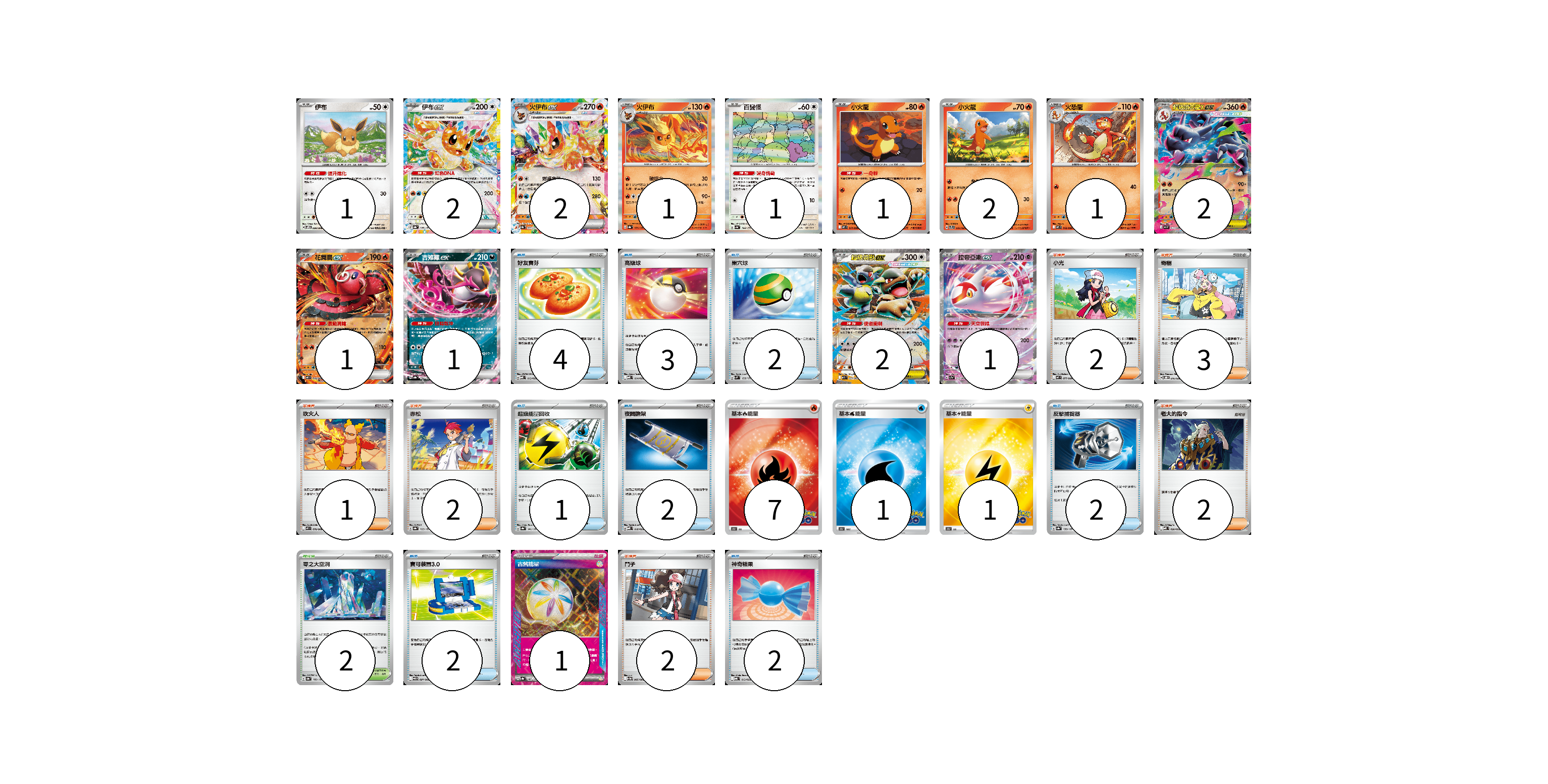 牌組構築方案 以此牌組為基礎新構築牌組 顯示卡面 顯示列表 寶可夢卡(18) 1 2 2 1 1 1 2 1 2 1 1 2 1 物品卡(18) 4 3 2 1 2 2 2 2 支援者卡(12) 2 3 1 2 2 2 競技場卡(2) 2 能量卡(10) 7 1 1 1 寶可夢卡(18) 卡牌名稱 張數 卡牌名稱 張數 伊布 SVPN 008/008 01 伊布ex SV8a 126/187 02 火伊布ex SV8a 022/187 02 火伊布 SV8a 021/187 01 百變怪 SV4a 144/190 01 小火龍 M2 011/080 01 小火龍 SVTL 001/021 02 火恐龍 M2 012/080 01 超級噴火龍Xex M2 013/080 02 花舞鳥ex M2 018/080 01 吉雉雞ex SV8a 104/187 01 超級袋獸ex M1S 051/063 02 拉帝亞斯ex SV7a 019/064 01 物品卡(18) 卡牌名稱 張數 卡牌名稱 張數 好友寶芬 MBD 013/022 04 高級球 MBD 014/022 03 巢穴球 SVM 133/175 02 超級能量回收 SV8a 141/187 01 夜間擔架 MBD 016/022 02 反擊捕捉器 SV8a 139/187 02 寶可裝置3.0 SV11B 081/086 02 神奇糖果 MBG 013/022 02 支援者卡(12) 卡牌名稱 張數 卡牌名稱 張數 小光 M2 077/080 02 奇樹 SVOD 016/020 03 吹火人 M2 078/080 01 赤松 SV8a 163/187 02 老大的指令 MBD 020/022 02 鬥子 SV11W 085/086 02 競技場卡(2) 卡牌名稱 張數 卡牌名稱 張數 零之大空洞 SV8a 182/187 02 能量卡(10) 卡牌名稱 張數 卡牌名稱 張數 基本火能量 S10b FIR 07 基本水能量 S10b WAT 01 基本雷能量 S10b LIG 01 古舊能量 SV8a 187/187 01 以此牌組為基礎新構築牌組 牌組編碼 mQAFoj-kzklhn-EeGDHO copy 列印牌組單 牌組編碼已複製 分享至SNS