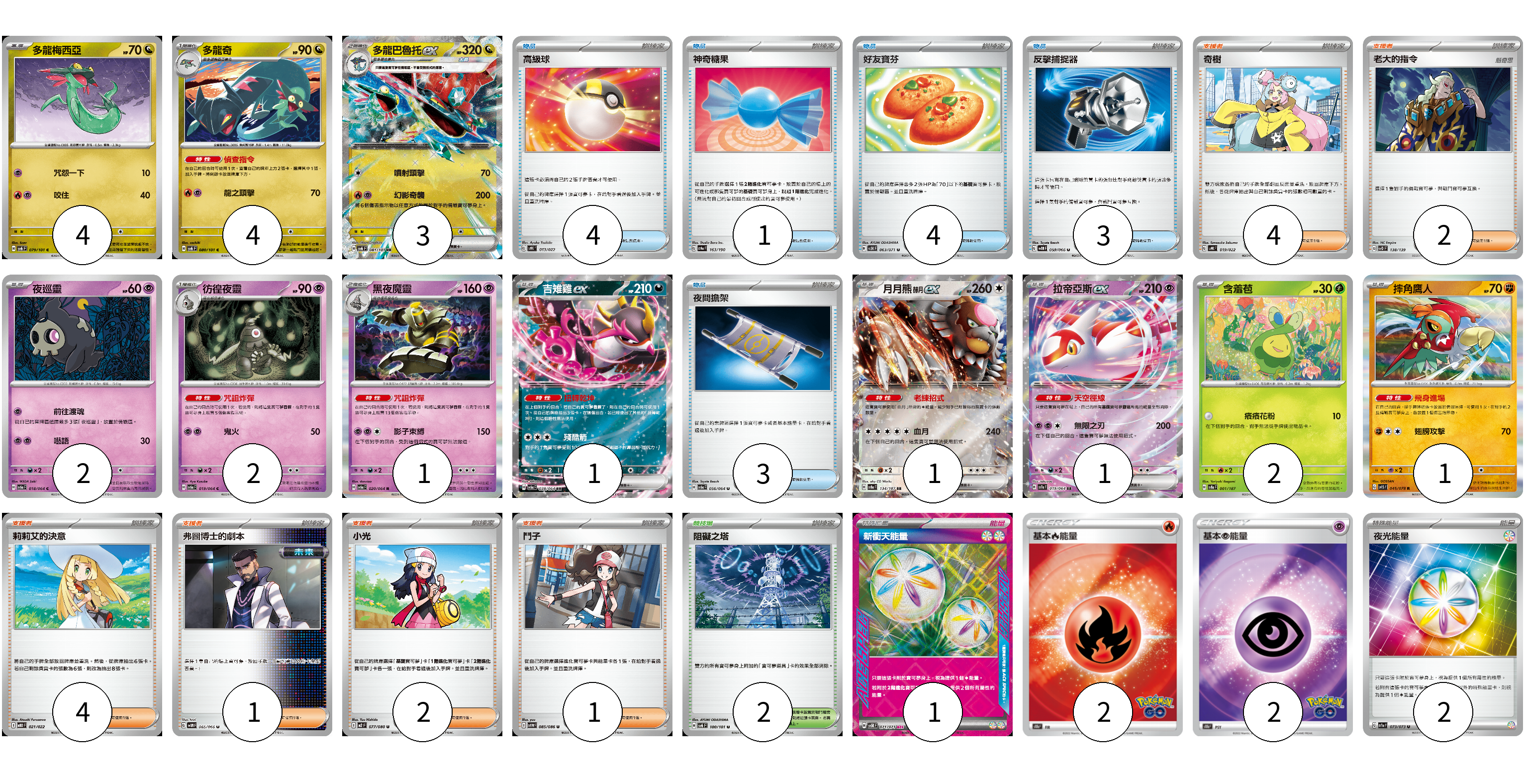 牌組構築方案 以此牌組為基礎新構築牌組 顯示卡面 顯示列表 寶可夢卡(22) 4 4 3 2 2 1 1 1 1 2 1 物品卡(15) 4 1 4 3 3 支援者卡(14) 4 2 4 1 2 1 競技場卡(2) 2 能量卡(7) 1 2 2 2 寶可夢卡(22) 卡牌名稱 張數 卡牌名稱 張數 多龍梅西亞 SV6 079/101 04 多龍奇 SV6 080/101 04 多龍巴魯托ex SV6 081/101 03 夜巡靈 SV6a 018/064 02 彷徨夜靈 SV6a 019/064 02 黑夜魔靈 SV6a 020/064 01 吉雉雞ex SV6a 038/064 01 月月熊 赫月ex SV8a 134/187 01 拉帝亞斯ex SV7a 019/064 01 含羞苞 SV8a 001/187 02 摔角鷹人 SV1S 045/078 01 物品卡(15) 卡牌名稱 張數 卡牌名稱 張數 高級球 SVHK 013/022 04 神奇糖果 SV4a 163/190 01 好友寶芬 SV5K 063/071 04 反擊捕捉器 SV4M 059/066 03 夜間擔架 SV6a 056/064 03 支援者卡(14) 卡牌名稱 張數 卡牌名稱 張數 奇樹 SVHK 019/022 04 老大的指令(魁奇思) SVD 138/139 02 莉莉艾的決意 MBD 021/022 04 弗圖博士的劇本 SV4M 065/066 01 小光 M2 077/080 02 鬥子 SV11W 085/086 01 競技場卡(2) 卡牌名稱 張數 卡牌名稱 張數 阻礙之塔 SV6 100/101 02 能量卡(7) 卡牌名稱 張數 卡牌名稱 張數 新衝天能量 SV5K 071/071 01 基本火能量 S10b FIR 02 基本超能量 S10b PSY 02 夜光能量 SV1a 073/073 02 以此牌組為基礎新構築牌組 牌組編碼 mQbtMU-bprWHr-xSrcUE copy 列印牌組單 牌組編碼已複製 分享至SNS