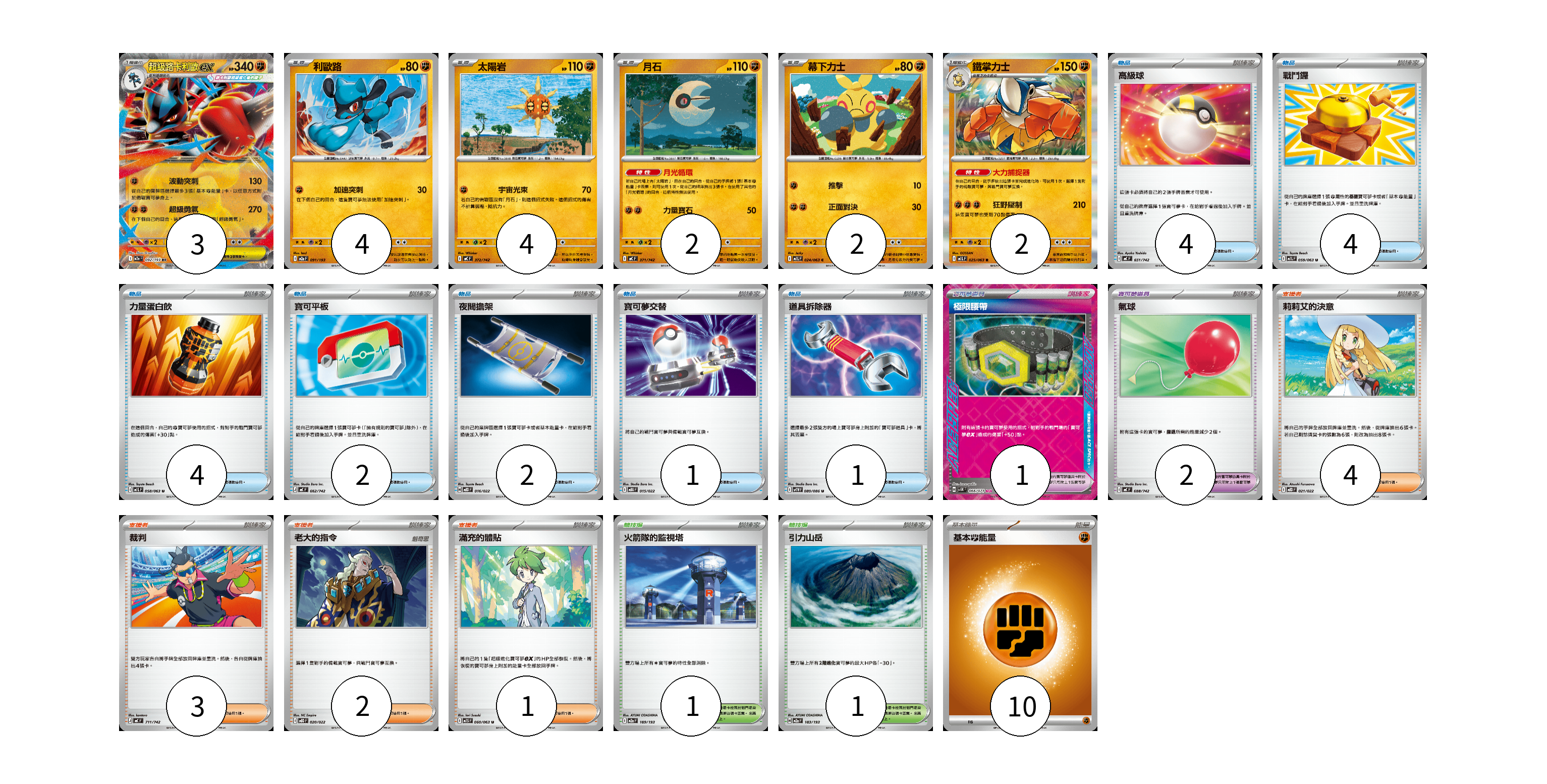牌組構築方案 以此牌組為基礎新構築牌組 顯示卡面 顯示列表 寶可夢卡(17) 3 4 4 2 2 2 寶可夢道具(3) 1 2 物品卡(18) 4 4 4 2 2 1 1 支援者卡(10) 4 3 2 1 競技場卡(2) 1 1 能量卡(10) 10 寶可夢卡(17) 卡牌名稱 張數 卡牌名稱 張數 超級路卡利歐ex M2a 092/193 03 利歐路 M2a 091/193 04 太陽岩 MC 372/742 04 月石 MC 371/742 02 幕下力士 M1L 024/063 02 鐵掌力士 M1L 025/063 02 寶可夢道具(3) 卡牌名稱 張數 卡牌名稱 張數 極限腰帶 SV5K 066/071 01 氣球 MC 688/742 02 物品卡(18) 卡牌名稱 張數 卡牌名稱 張數 高級球 MC 651/742 04 戰鬥鑼 M1L 059/063 04 力量蛋白飲 M1L 058/063 04 寶可平板 MC 662/742 02 夜間擔架 MBD 016/022 02 寶可夢交替 MBG 015/022 01 道具拆除器 SV11W 080/086 01 支援者卡(10) 卡牌名稱 張數 卡牌名稱 張數 莉莉艾的決意 MBD 021/022 04 裁判 MC 711/742 03 老大的指令 MBD 020/022 02 滿充的體貼 M1S 060/063 01 競技場卡(2) 卡牌名稱 張數 卡牌名稱 張數 火箭隊的監視塔 M2a 189/193 01 引力山岳 M2a 183/193 01 能量卡(10) 卡牌名稱 張數 卡牌名稱 張數 基本【鬥】能量 MC FIG 10 以此牌組為基礎新構築牌組 牌組編碼 mTrXAz-GOCLPe-sLJooG copy 列印牌組單 牌組編碼已複製 分享至SNS