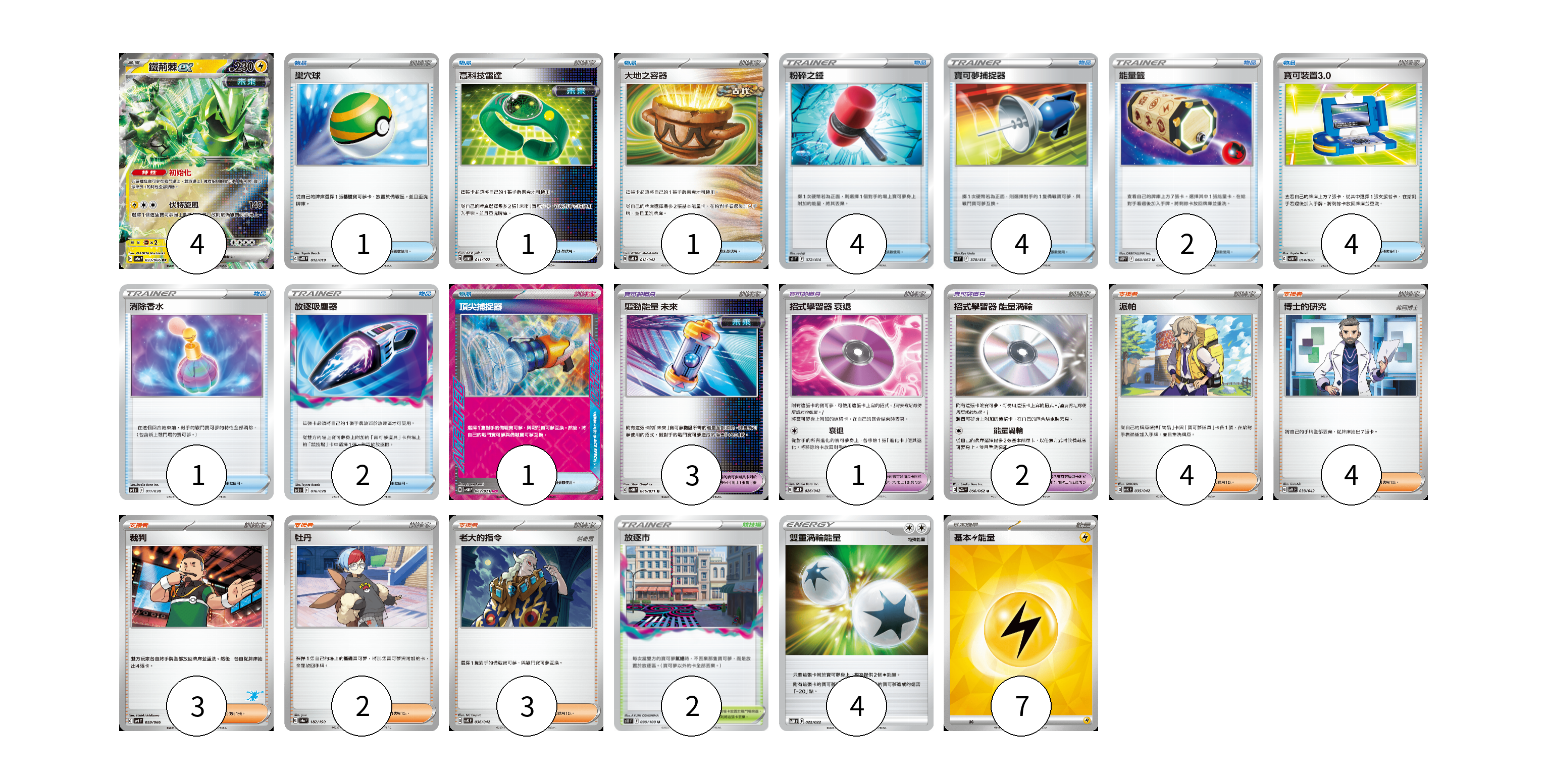 牌組構築方案 以此牌組為基礎新構築牌組 顯示卡面 顯示列表 寶可夢卡(4) 4 寶可夢道具(6) 3 1 2 物品卡(21) 1 1 1 4 4 2 4 1 2 1 支援者卡(16) 4 4 3 2 3 競技場卡(2) 2 能量卡(11) 4 7 寶可夢卡(4) 卡牌名稱 張數 卡牌名稱 張數 鐵荊棘ex SV5a 033/066 04 寶可夢道具(6) 卡牌名稱 張數 卡牌名稱 張數 驅勁能量 未來 SV5M 065/071 03 招式學習器 衰退 SVK 026/042 01 招式學習器 能量渦輪 SV3a 056/062 02 物品卡(21) 卡牌名稱 張數 卡牌名稱 張數 巢穴球 SVTG 012/019 01 高科技雷達 SVHM 011/022 01 大地之容器 SVK 012/042 01 粉碎之錘 SI 372/414 04 寶可夢捕捉器 SI 378/414 04 能量籤 S10P 060/067 02 寶可裝置3.0 SVEM 014/020 04 消除香水 SVF 011/038 01 放逐吸塵器 SVB 016/028 02 頂尖捕捉器 SV5M 062/071 01 支援者卡(16) 卡牌名稱 張數 卡牌名稱 張數 派帕 SVK 035/042 04 博士的研究 SVK 033/042 04 裁判 SVI 059/066 03 牡丹 SV4a 182/190 02 老大的指令 SVK 036/042 03 競技場卡(2) 卡牌名稱 張數 卡牌名稱 張數 放逐市 S11 099/100 02 能量卡(11) 卡牌名稱 張數 卡牌名稱 張數 雙重渦輪能量 SVTM 022/022 04 基本【雷】能量 SVK LIG 07 以此牌組為基礎新構築牌組 牌組編碼 mVSYwl-wpzdcM-oHrjrs copy 列印牌組單 牌組編碼已複製 分享至SNS