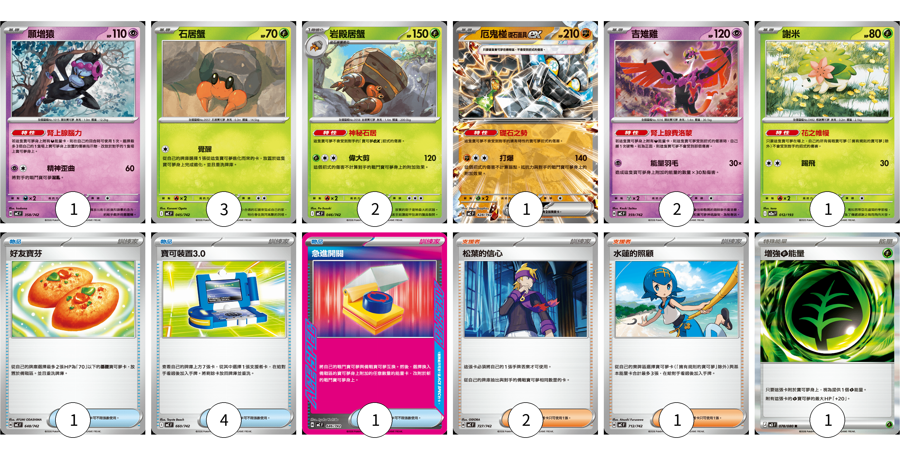 牌組構築方案 以此牌組為基礎新構築牌組 顯示卡面 顯示列表 寶可夢卡(10) 1 3 2 1 2 1 物品卡(6) 1 4 1 支援者卡(3) 2 1 能量卡(1) 1 寶可夢卡(10) 卡牌名稱 張數 卡牌名稱 張數 願增猿 MC 358/742 01 石居蟹 MC 045/742 03 岩殿居蟹 MC 046/742 02 厄鬼椪 礎石面具ex MC 428/742 01 吉雉雞 MC 359/742 02 謝米 M2a 012/193 01 物品卡(6) 卡牌名稱 張數 卡牌名稱 張數 好友寶芬 MC 648/742 01 寶可裝置3.0 MC 660/742 04 急進開關 MC 646/742 01 支援者卡(3) 卡牌名稱 張數 卡牌名稱 張數 松葉的信心 MC 727/742 02 水蓮的照顧 MC 712/742 01 能量卡(1) 卡牌名稱 張數 卡牌名稱 張數 增強【草】能量 M3 078/080 01 以此牌組為基礎新構築牌組 牌組編碼 mVgomR-AxrUnm-mcrnoE copy 列印牌組單 牌組編碼已複製 分享至SNS
