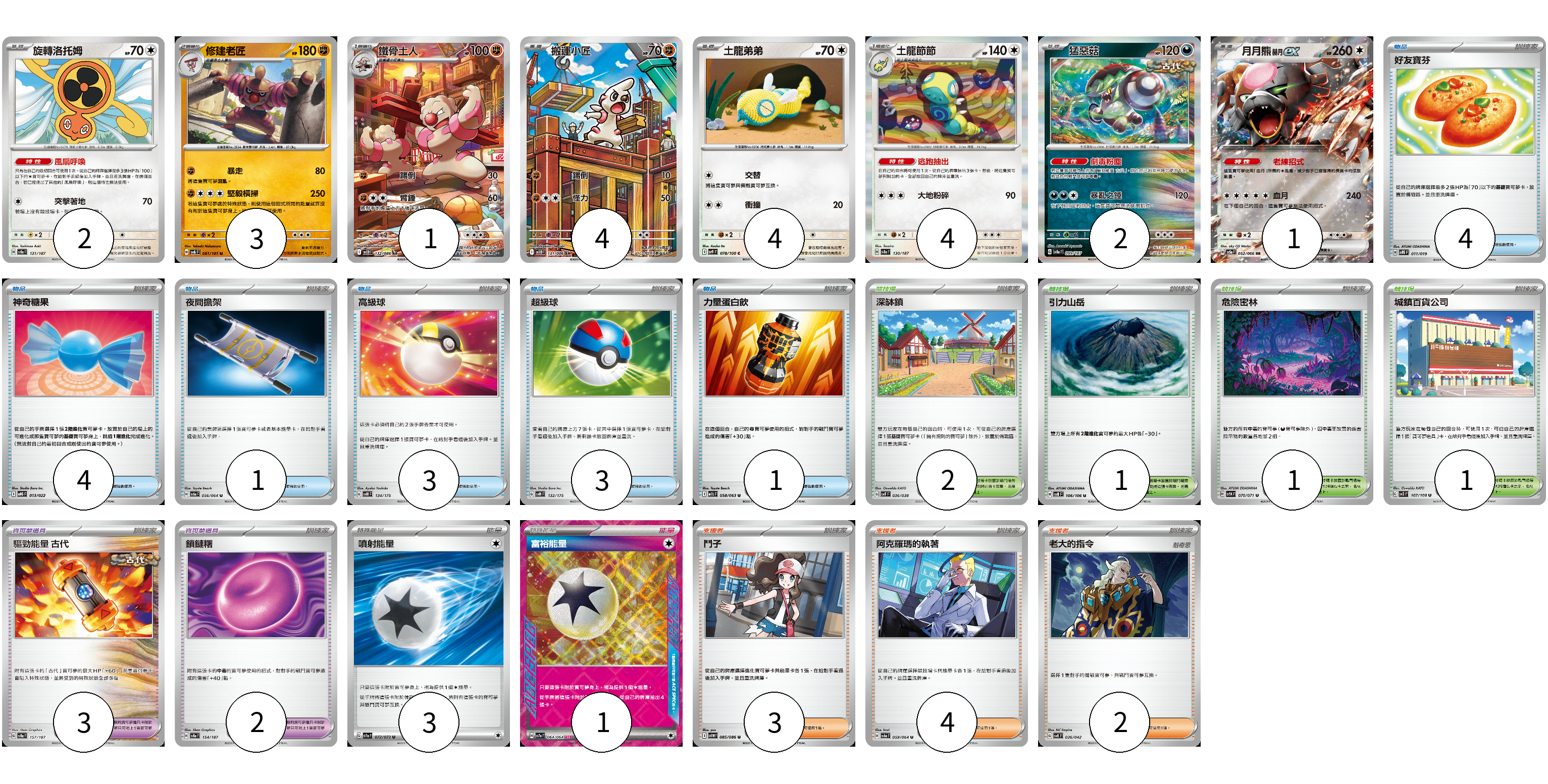 牌組構築方案 以此牌組為基礎新構築牌組 顯示卡面 顯示列表 寶可夢卡(21) 2 3 1 4 4 4 2 1 寶可夢道具(5) 3 2 物品卡(16) 4 4 1 3 3 1 支援者卡(9) 3 4 2 競技場卡(5) 2 1 1 1 能量卡(4) 3 1 寶可夢卡(21) 卡牌名稱 張數 卡牌名稱 張數 旋轉洛托姆 SV8a 131/187 02 修建老匠 SV6 061/101 03 鐵骨土人 SV11B 132/086 01 搬運小匠 SV11B 131/086 04 土龍弟弟 SV9 078/100 04 土龍節節 SV8a 130/187 04 猛惡菇 SV8a 099/187 02 月月熊 赫月 ex SV5a 052/066 01 寶可夢道具(5) 卡牌名稱 張數 卡牌名稱 張數 驅勁能量 古代 SV8a 157/187 03 鎖鏈糬 SV8a 154/187 02 物品卡(16) 卡牌名稱 張數 卡牌名稱 張數 好友寶芬 SVTG 011/019 04 神奇糖果 MBG 013/022 04 夜間擔架 SV6a 056/064 01 高級球 SVM 134/175 03 超級球 SVM 132/175 03 力量蛋白飲 M1L 058/063 01 支援者卡(9) 卡牌名稱 張數 卡牌名稱 張數 鬥子 SV11W 085/086 03 阿克羅瑪的執著 SV6a 059/064 04 老大的指令 SVK 036/042 02 競技場卡(5) 卡牌名稱 張數 卡牌名稱 張數 深缽鎮 SVF 036/038 02 引力山岳 SV8 106/106 01 危險密林 SV5K 070/071 01 城鎮百貨公司 SV3 107/108 01 能量卡(4) 卡牌名稱 張數 卡牌名稱 張數 噴射能量 SV1a 072/073 03 富裕能量 SV7a 064/064 01 以此牌組為基礎新構築牌組 牌組編碼 mXPBVm-JNAyWO-EvdflX copy 列印牌組單 牌組編碼已複製 分享至SNS