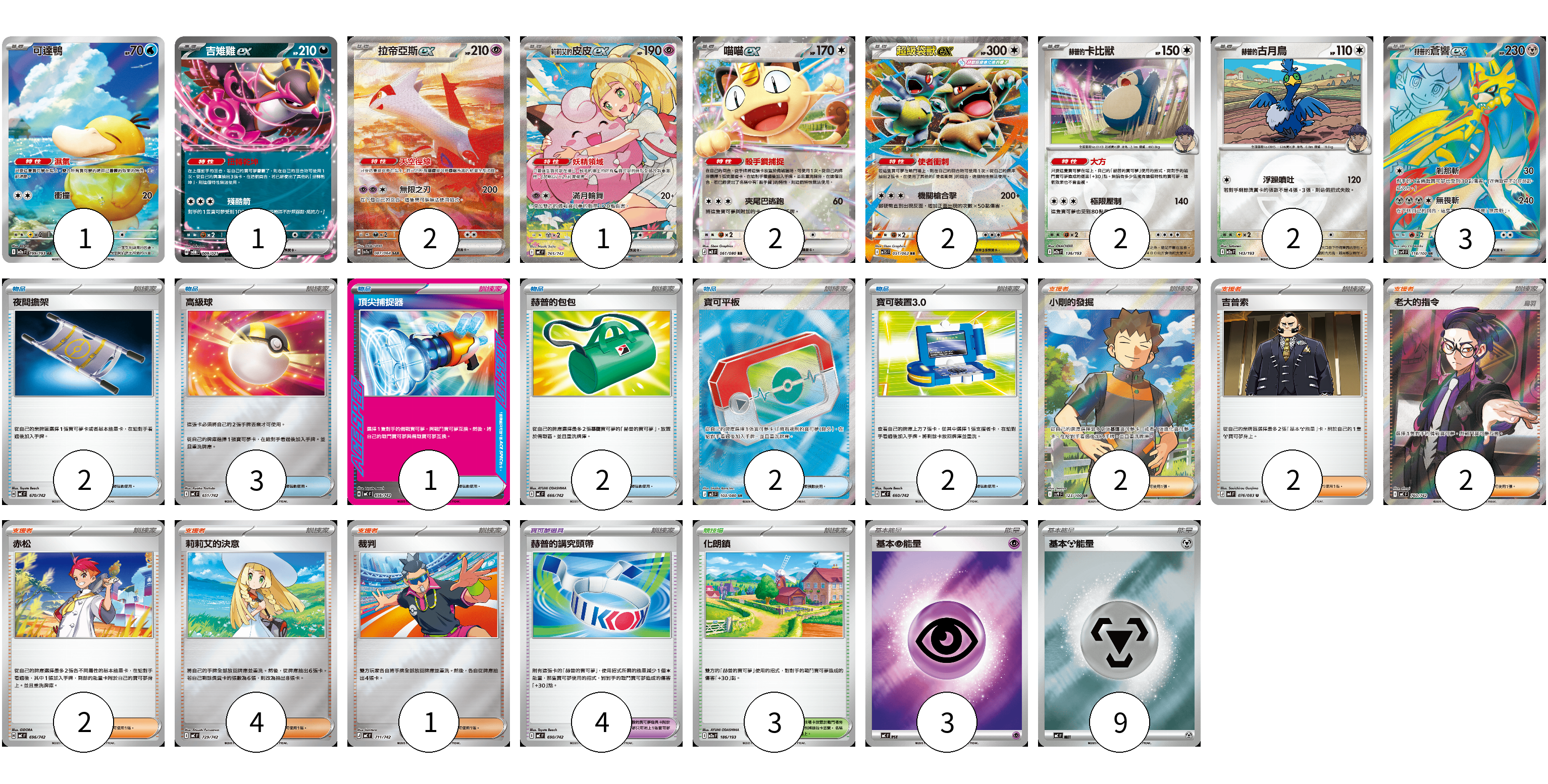 牌組構築方案 以此牌組為基礎新構築牌組 顯示卡面 顯示列表 寶可夢卡(16) 1 1 2 1 2 2 2 2 3 寶可夢道具(4) 4 物品卡(12) 2 3 1 2 2 2 支援者卡(13) 2 2 2 2 4 1 競技場卡(3) 3 能量卡(12) 3 9 寶可夢卡(16) 卡牌名稱 張數 卡牌名稱 張數 可達鴨 M2a 199/193 01 吉雉雞ex SVOM 009/021 01 拉帝亞斯ex SV7a 087/064 02 莉莉艾的皮皮ex MC 765/742 01 喵喵ex M3 061/080 02 超級袋獸ex M1S 051/063 02 赫普的卡比獸 M2a 136/193 02 赫普的古月鳥 M2a 143/193 02 赫普的蒼響ex SV9 118/100 03 寶可夢道具(4) 卡牌名稱 張數 卡牌名稱 張數 赫普的講究頭帶 MC 690/742 04 物品卡(12) 卡牌名稱 張數 卡牌名稱 張數 夜間擔架 MC 670/742 02 高級球 MC 651/742 03 頂尖捕捉器 MC 656/742 01 赫普的包包 MC 666/742 02 寶可平板 M3 103/080 02 寶可裝置3.0 MC 660/742 02 支援者卡(13) 卡牌名稱 張數 卡牌名稱 張數 小剛的發掘 SV9 123/100 02 吉普索 M4 076/083 02 老大的指令(烏羽) MC 760/742 02 赤松 MC 696/742 02 莉莉艾的決意 MC 729/742 04 裁判 MC 711/742 01 競技場卡(3) 卡牌名稱 張數 卡牌名稱 張數 化朗鎮 M2a 186/193 03 能量卡(12) 卡牌名稱 張數 卡牌名稱 張數 基本【超】能量 MC PSY 03 基本【鋼】能量 MC MET 09 以此牌組為基礎新構築牌組 牌組編碼 madhDs-kUMPei-FXqIvU copy 列印牌組單 牌組編碼已複製 分享至SNS