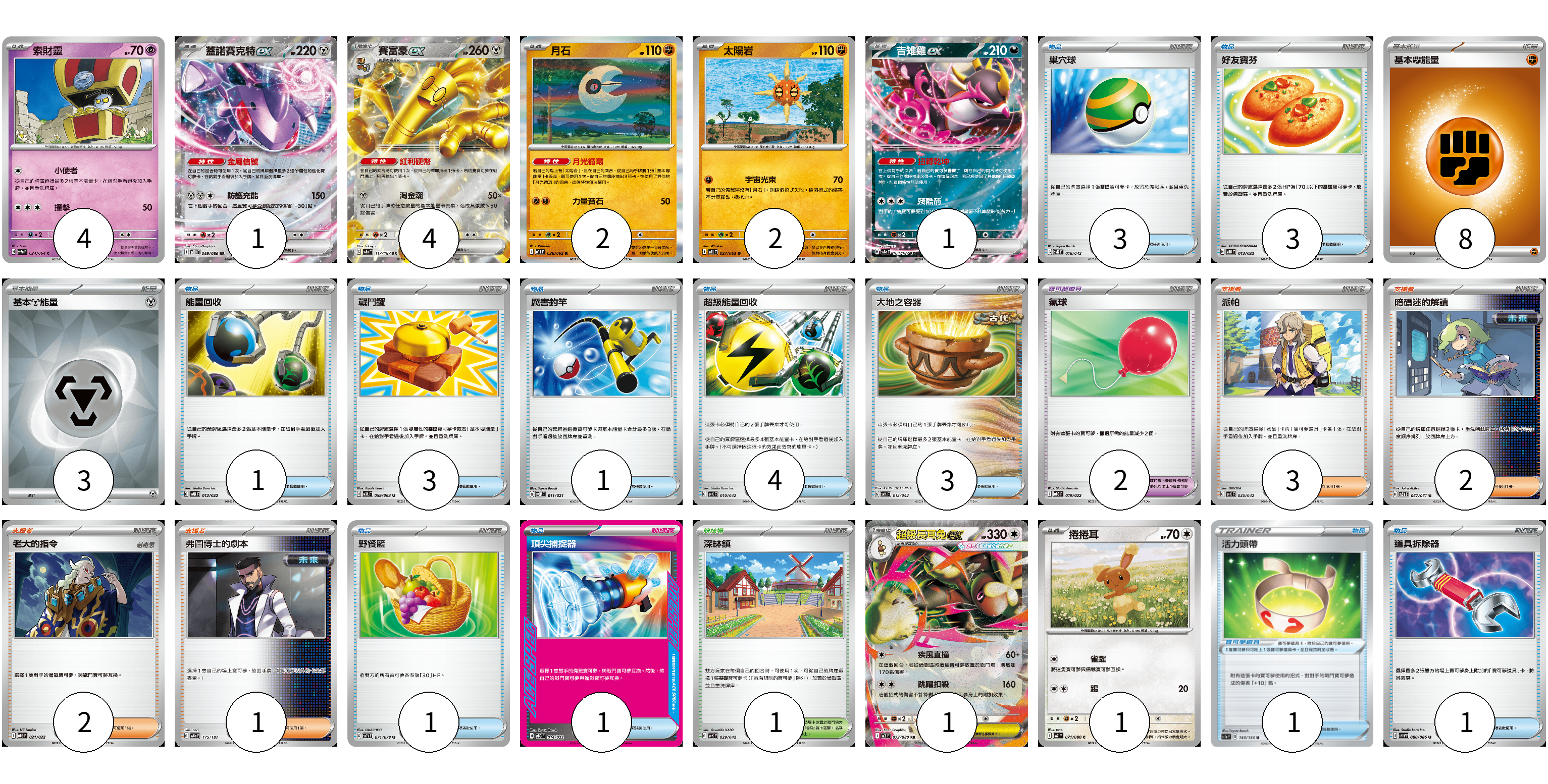 牌組構築方案 以此牌組為基礎新構築牌組 顯示卡面 顯示列表 寶可夢卡(16) 4 1 4 2 2 1 1 1 寶可夢道具(3) 2 1 物品卡(21) 3 3 1 3 1 4 3 1 1 1 支援者卡(8) 3 2 2 1 競技場卡(1) 1 能量卡(11) 8 3 寶可夢卡(16) 卡牌名稱 張數 卡牌名稱 張數 索財靈 SV7a 024/064 04 蓋諾賽克特ex SV11B 069/086 01 賽富豪ex SV8a 117/187 04 月石 M1L 026/063 02 太陽岩 M1L 027/063 02 吉雉雞ex SV8a 104/187 01 超級長耳兔ex M2 072/080 01 捲捲耳 M2 071/080 01 寶可夢道具(3) 卡牌名稱 張數 卡牌名稱 張數 氣球 MBG 019/022 02 活力頭帶 SC1a 143/154 01 物品卡(21) 卡牌名稱 張數 卡牌名稱 張數 巢穴球 SVK 016/042 03 好友寶芬 MBD 013/022 03 能量回收 SVQL 012/022 01 戰鬥鑼 M1L 059/063 03 厲害釣竿 SVOM 011/021 01 超級能量回收 SVK 010/042 04 大地之容器 SVK 012/042 03 野餐籃 SV1V 071/078 01 頂尖捕捉器 MBG 014/022 01 道具拆除器 SV11W 080/086 01 支援者卡(8) 卡牌名稱 張數 卡牌名稱 張數 派帕 SVK 035/042 03 暗碼迷的解讀 SV5M 067/071 02 老大的指令 MBG 021/022 02 弗圖博士的劇本 SV8a 175/187 01 競技場卡(1) 卡牌名稱 張數 卡牌名稱 張數 深缽鎮 SVK 039/042 01 能量卡(11) 卡牌名稱 張數 卡牌名稱 張數 基本【鬥】能量 M-P FIG 08 基本【鋼】能量 SVOD MET 03 以此牌組為基礎新構築牌組 牌組編碼 mbrDKw-YsNAHK-brcwrf copy 列印牌組單 牌組編碼已複製 分享至SNS