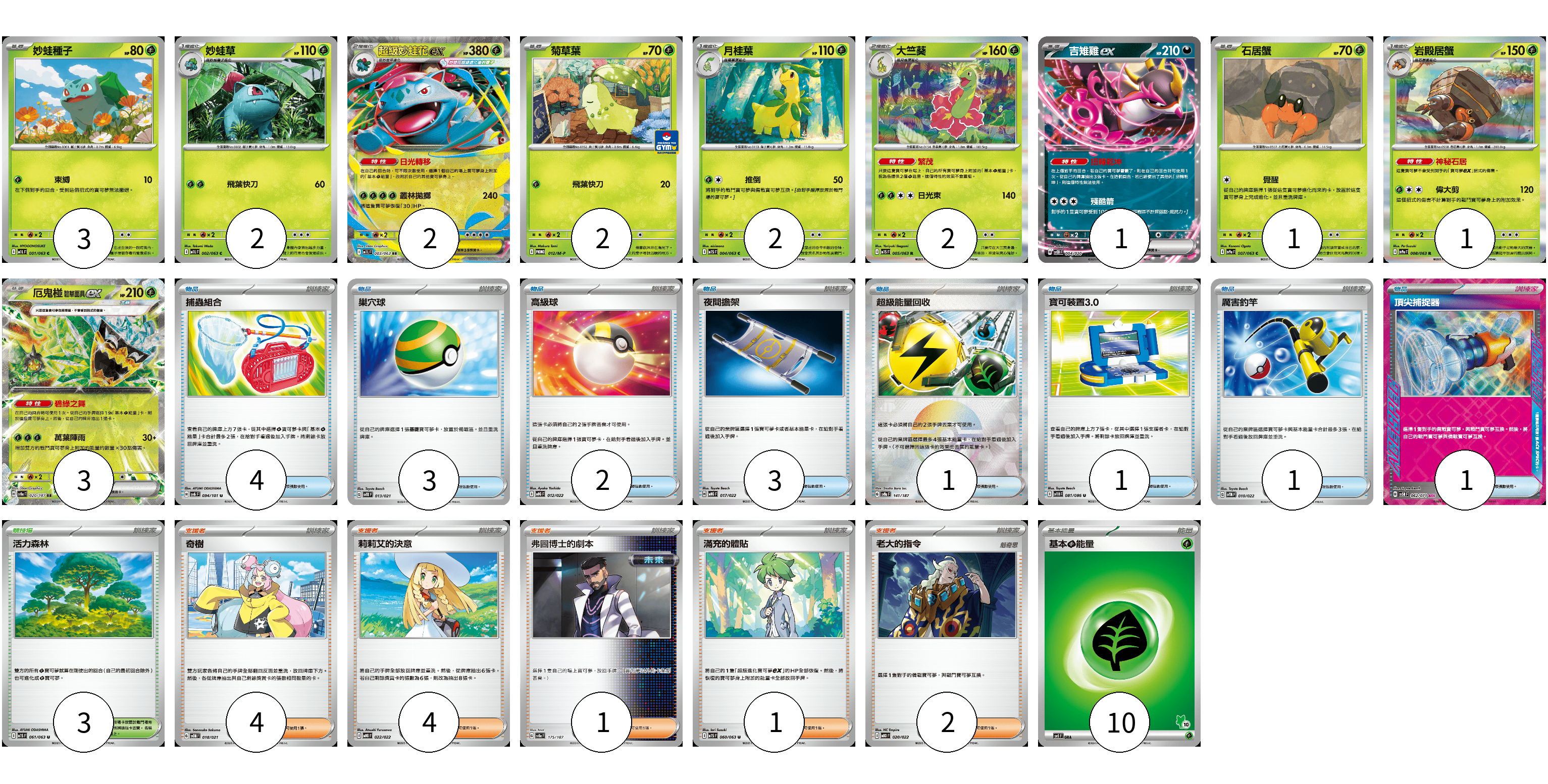 牌組構築方案 以此牌組為基礎新構築牌組 顯示卡面 顯示列表 寶可夢卡(19) 3 2 2 2 2 2 1 1 1 3 物品卡(16) 4 3 2 3 1 1 1 1 支援者卡(12) 4 4 1 1 2 競技場卡(3) 3 能量卡(10) 10 寶可夢卡(19) 卡牌名稱 張數 卡牌名稱 張數 妙蛙種子 M1L 001/063 03 妙蛙草 M1L 002/063 02 超級妙蛙花ex M1L 003/063 02 菊草葉 M-P 012/M-P 02 月桂葉 M1S 004/063 02 大竺葵 M1S 005/063 02 吉雉雞ex SVOD 004/020 01 石居蟹 SV9a 007/063 01 岩殿居蟹 SV9a 008/063 01 厄鬼椪 碧草面具ex SV8a 020/187 03 物品卡(16) 卡牌名稱 張數 卡牌名稱 張數 捕蟲組合 SV6 094/101 04 巢穴球 SVTR 013/021 03 高級球 MBG 012/022 02 夜間擔架 MBG 017/022 03 超級能量回收 SV8a 141/187 01 寶可裝置3.0 SV11B 081/086 01 厲害釣竿 SVTM 010/022 01 頂尖捕捉器 SV5M 062/071 01 支援者卡(12) 卡牌名稱 張數 卡牌名稱 張數 奇樹 SVOM 018/021 04 莉莉艾的決意 MBG 022/022 04 弗圖博士的劇本 SV8a 175/187 01 滿充的體貼 M1S 060/063 01 老大的指令 MBD 020/022 02 競技場卡(3) 卡牌名稱 張數 卡牌名稱 張數 活力森林 M1S 061/063 03 能量卡(10) 卡牌名稱 張數 卡牌名稱 張數 基本【草】能量 SVI GRA 10 以此牌組為基礎新構築牌組 牌組編碼 mdYCMB-MDZWdZ-OhpLYg copy 列印牌組單 牌組編碼已複製 分享至SNS