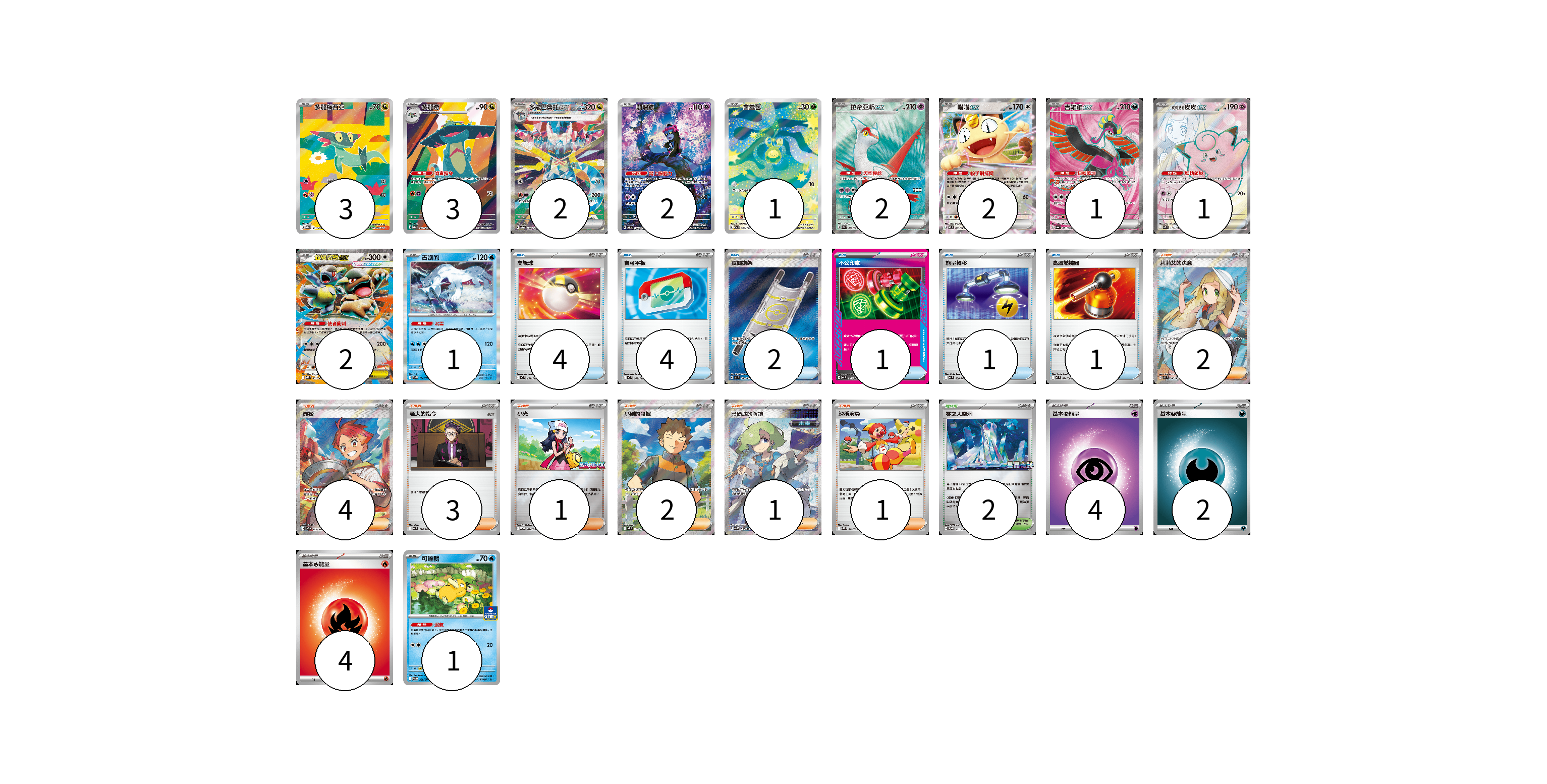 牌組構築方案 以此牌組為基礎新構築牌組 顯示卡面 顯示列表 寶可夢卡(21) 3 3 2 2 1 2 2 1 1 2 1 1 物品卡(13) 4 4 2 1 1 1 支援者卡(14) 2 4 3 1 2 1 1 競技場卡(2) 2 能量卡(10) 4 2 4 寶可夢卡(21) 卡牌名稱 張數 卡牌名稱 張數 多龍梅西亞 M2a 211/193 03 多龍奇 M2a 212/193 03 多龍巴魯托ex SV8a 221/187 02 願增猿 SV6 107/101 02 含羞苞 M2a 196/193 01 拉帝亞斯ex SV7a 078/064 02 喵喵ex M3 061/080 02 吉雉雞ex SV6a 081/064 01 莉莉艾的皮皮ex SV9 115/100 01 超級袋獸ex M1S 051/063 02 古劍豹 SV-P 190/SV-P 01 可達鴨 SV-P 220/SV-P 01 物品卡(13) 卡牌名稱 張數 卡牌名稱 張數 高級球 MC 651/742 04 寶可平板 MC 662/742 04 夜間擔架 M1L 083/063 02 不公印章 MC 633/742 01 能量轉移 MC 638/742 01 高溫燃燒器 M2 074/080 01 支援者卡(14) 卡牌名稱 張數 卡牌名稱 張數 莉莉艾的決意 M1L 086/063 02 赤松 SV7 123/102 04 老大的指令 MC 724/742 03 小光 M-P 028/M-P 01 小剛的發掘 SV9 123/100 02 暗碼迷的解讀 SV5M 090/071 01 滑稽演員 SVQL 019/022 01 競技場卡(2) 卡牌名稱 張數 卡牌名稱 張數 零之大空洞 SV-P 151/SV-P 02 能量卡(10) 卡牌名稱 張數 卡牌名稱 張數 基本【超】能量 MC PSY 04 基本【惡】能量 MC DAR 02 基本【火】能量 MC FIR 04 以此牌組為基礎新構築牌組 牌組編碼 meZoej-rDGCsA-AUfEuT copy 列印牌組單 牌組編碼已複製 分享至SNS