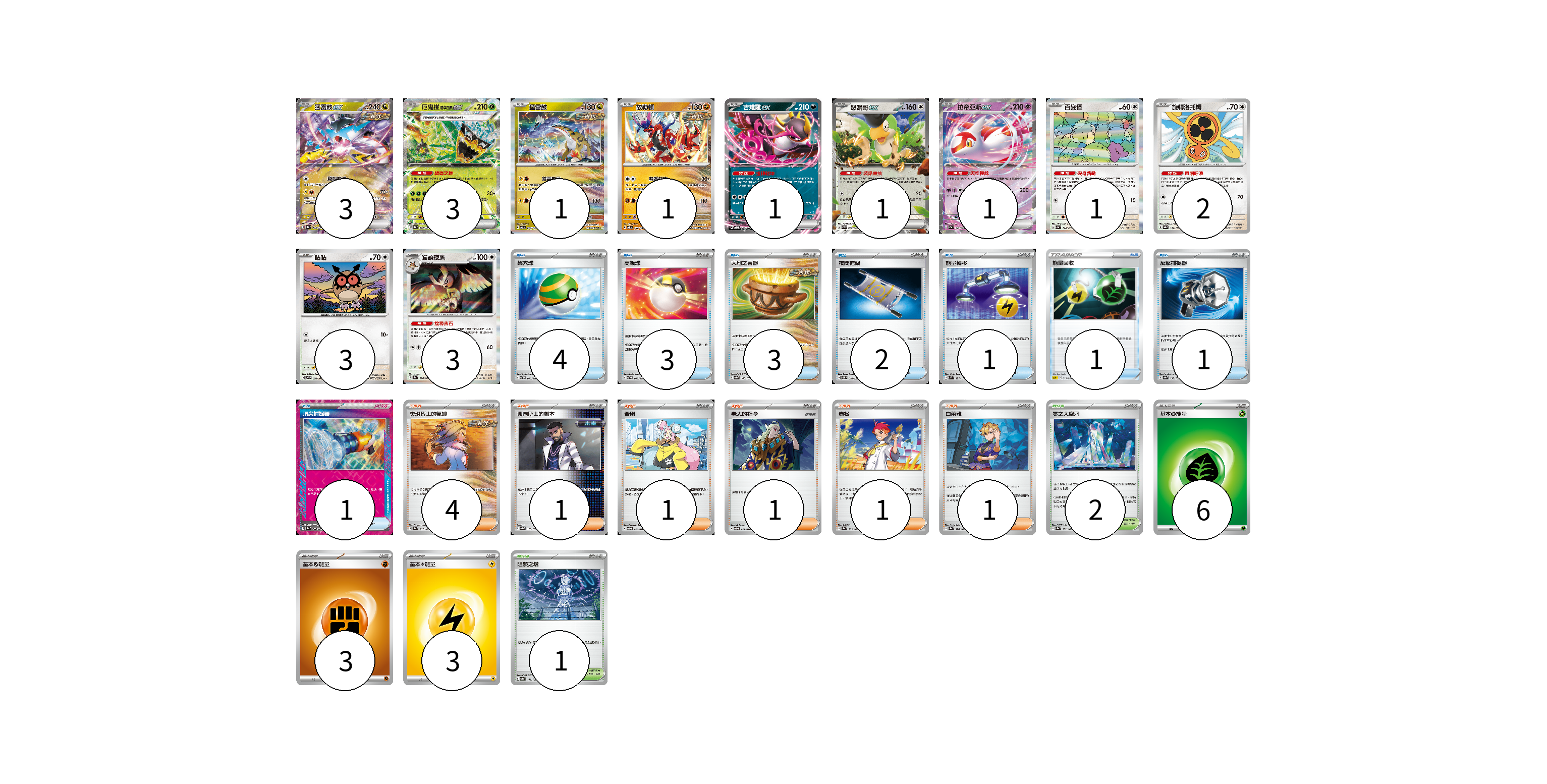 牌組構築方案 以此牌組為基礎新構築牌組 顯示卡面 顯示列表 寶可夢卡(20) 3 3 1 1 1 1 1 1 2 3 3 物品卡(16) 4 3 3 2 1 1 1 1 支援者卡(9) 4 1 1 1 1 1 競技場卡(3) 2 1 能量卡(12) 6 3 3 寶可夢卡(20) 卡牌名稱 張數 卡牌名稱 張數 猛雷鼓ex SV8a 124/187 03 厄鬼椪 碧草面具ex SV8a 020/187 03 猛雷鼓 SV7 075/102 01 故勒頓 SV8 069/106 01 吉雉雞ex SVOD 004/020 01 怒鸚哥ex SVK 006/042 01 拉帝亞斯ex SV7a 019/064 01 百變怪 SV4a 144/190 01 旋轉洛托姆 SV8a 131/187 02 咕咕 SV7 076/102 03 貓頭夜鷹 SV8a 128/187 03 物品卡(16) 卡牌名稱 張數 卡牌名稱 張數 巢穴球 SVTH 010/018 04 高級球 SVTG 013/019 03 大地之容器 SV8a 143/187 03 夜間擔架 SVOM 016/021 02 能量轉移 SVM 127/175 01 能量回收 SDP 013/022 01 反擊捕捉器 SV8a 139/187 01 頂尖捕捉器 SV8a 148/187 01 支援者卡(9) 卡牌名稱 張數 卡牌名稱 張數 奧琳博士的氣魄 SV8a 167/187 04 弗圖博士的劇本 SV8a 175/187 01 奇樹 SVOD 016/020 01 老大的指令 SVOD 019/020 01 赤松 SV8a 163/187 01 白蕾雅 SV8a 176/187 01 競技場卡(3) 卡牌名稱 張數 卡牌名稱 張數 零之大空洞 SV8a 182/187 02 阻礙之塔 SV8a 181/187 01 能量卡(12) 卡牌名稱 張數 卡牌名稱 張數 基本【草】能量 SVTM GRA 06 基本鬥能量 sv-p FIG 03 基本雷能量 sv-p LIG 03 以此牌組為基礎新構築牌組 牌組編碼 mecgWA-DFBfMx-ORSzPx copy 列印牌組單 牌組編碼已複製 分享至SNS