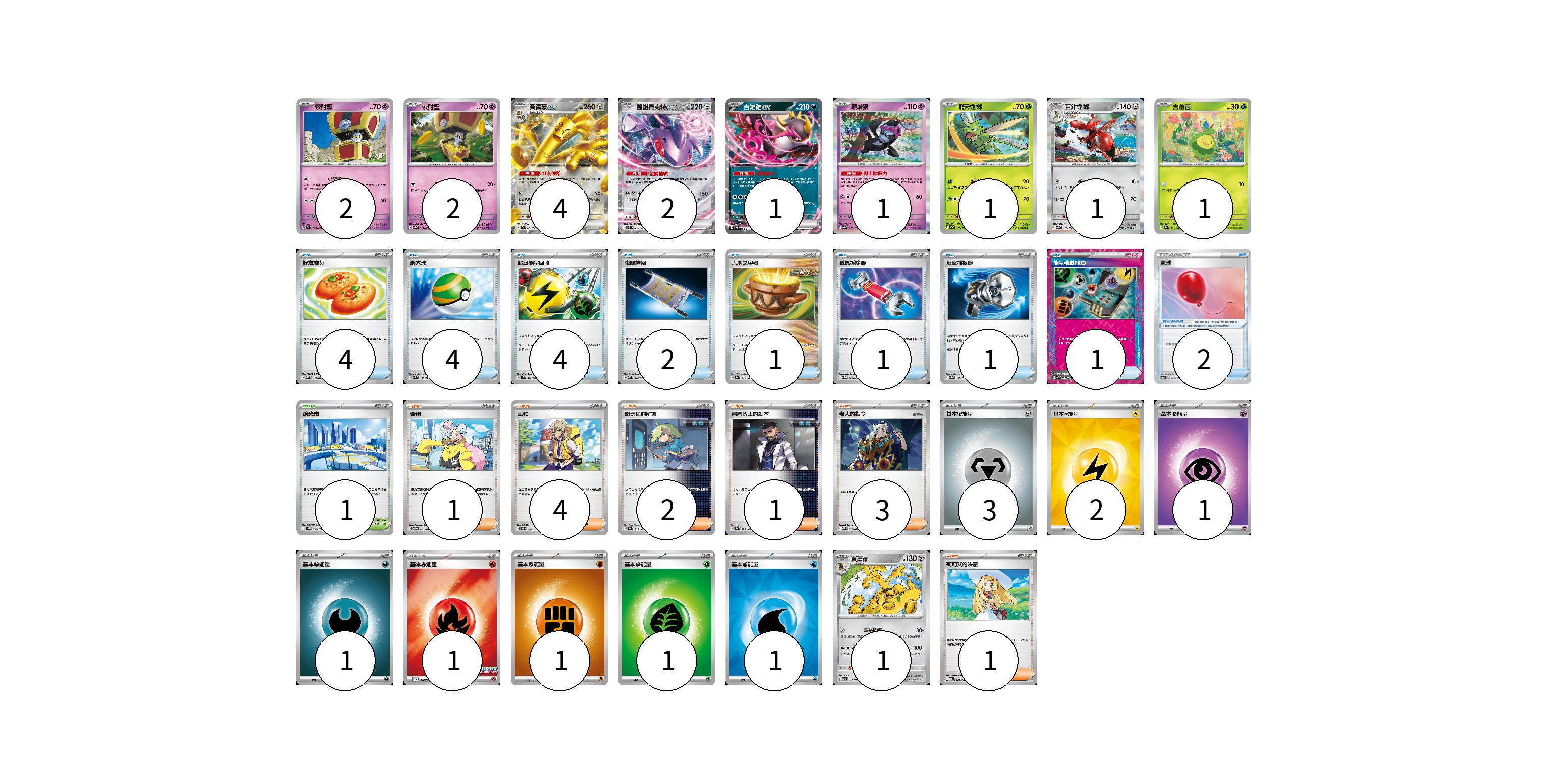 牌組構築方案 以此牌組為基礎新構築牌組 顯示卡面 顯示列表 寶可夢卡(16) 2 2 4 2 1 1 1 1 1 1 寶可夢道具(2) 2 物品卡(18) 4 4 4 2 1 1 1 1 支援者卡(12) 1 4 2 1 3 1 競技場卡(1) 1 能量卡(11) 3 2 1 1 1 1 1 1 寶可夢卡(16) 卡牌名稱 張數 卡牌名稱 張數 索財靈 SV7a 024/064 02 索財靈 SV3a 021/062 02 賽富豪ex SV3a 050/062 04 蓋諾賽克特ex SV11B 069/086 02 吉雉雞ex SVOD 004/020 01 願增猿 SV8a 075/187 01 飛天螳螂 SV2a 123/165 01 巨鉗螳螂 SV4a 129/190 01 含羞苞 SV8a 001/187 01 賽富豪 SV7a 038/064 01 寶可夢道具(2) 卡牌名稱 張數 卡牌名稱 張數 氣球 S8b 145/184 02 物品卡(18) 卡牌名稱 張數 卡牌名稱 張數 好友寶芬 MBD 013/022 04 巢穴球 SVM 133/175 04 超級能量回收 SVK 010/042 04 夜間擔架 MBD 016/022 02 大地之容器 SV8a 143/187 01 道具拆除器 SV11W 080/086 01 反擊捕捉器 SV8a 139/187 01 能量輸送PRO SV7a 052/064 01 支援者卡(12) 卡牌名稱 張數 卡牌名稱 張數 奇樹 SVOD 016/020 01 派帕 SVOD 018/020 04 暗碼迷的解讀 SV8a 165/187 02 弗圖博士的劇本 SV8a 175/187 01 老大的指令 MBD 020/022 03 莉莉艾的決意 MBD 021/022 01 競技場卡(1) 卡牌名稱 張數 卡牌名稱 張數 釀光市 SV9 098/100 01 能量卡(11) 卡牌名稱 張數 卡牌名稱 張數 基本【鋼】能量 M-P MET 03 基本【雷】能量 SVQP LIG 02 基本【超】能量 MBD PSY 01 基本【惡】能量 MBG DAR 01 基本【火】能量 M-P 032/M-P 01 基本【鬥】能量 M-P FIG 01 基本【草】能量 M-P GRA 01 基本【水】能量 SVK WAT 01 以此牌組為基礎新構築牌組 牌組編碼 mhYSEO-VSicbc-SnAvJG copy 列印牌組單 牌組編碼已複製 分享至SNS