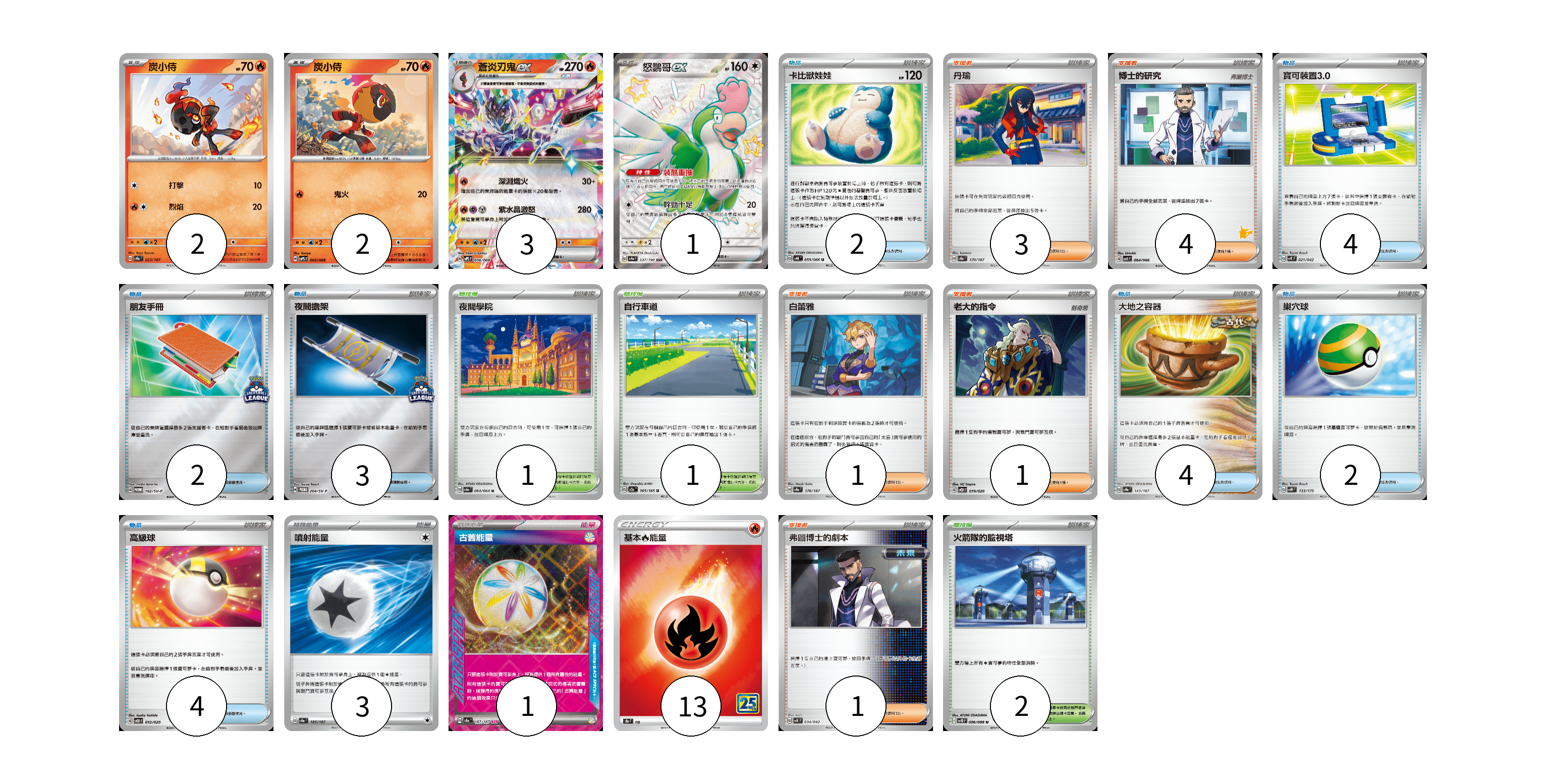 牌組構築方案 以此牌組為基礎新構築牌組 顯示卡面 顯示列表 寶可夢卡(8) 2 2 3 1 物品卡(21) 2 4 2 3 4 2 4 支援者卡(10) 3 4 1 1 1 競技場卡(4) 1 1 2 能量卡(17) 3 1 13 寶可夢卡(8) 卡牌名稱 張數 卡牌名稱 張數 炭小侍 SV8a 023/187 02 炭小侍 SVPS 005/008 02 蒼炎刃鬼ex SVPS 006/008 03 怒鸚哥ex SV4a 337/190 01 物品卡(21) 卡牌名稱 張數 卡牌名稱 張數 卡比獸娃娃 SV4K 059/066 02 寶可裝置3.0 SVK 021/042 04 朋友手冊 SV-P 182/SV-P 02 夜間擔架 SV-P 204/SV-P 03 大地之容器 SV8a 143/187 04 巢穴球 SVM 133/175 02 高級球 SVOD 012/020 04 支援者卡(10) 卡牌名稱 張數 卡牌名稱 張數 丹瑜 SV8a 170/187 03 博士的研究 SVI 064/066 04 白蕾雅 SV8a 176/187 01 老大的指令 SVOD 019/020 01 弗圖博士的劇本 SVK 034/042 01 競技場卡(4) 卡牌名稱 張數 卡牌名稱 張數 夜間學院 SV6a 064/064 01 自行車道 SV2a 165/165 01 火箭隊的監視塔 SV10 096/098 02 能量卡(17) 卡牌名稱 張數 卡牌名稱 張數 噴射能量 SV8a 185/187 03 古舊能量 SV8a 187/187 01 基本火能量 S8a FIR 13 以此牌組為基礎新構築牌組 牌組編碼 mhkkxp-qidmCh-PzJGTN copy 列印牌組單 牌組編碼已複製 分享至SNS