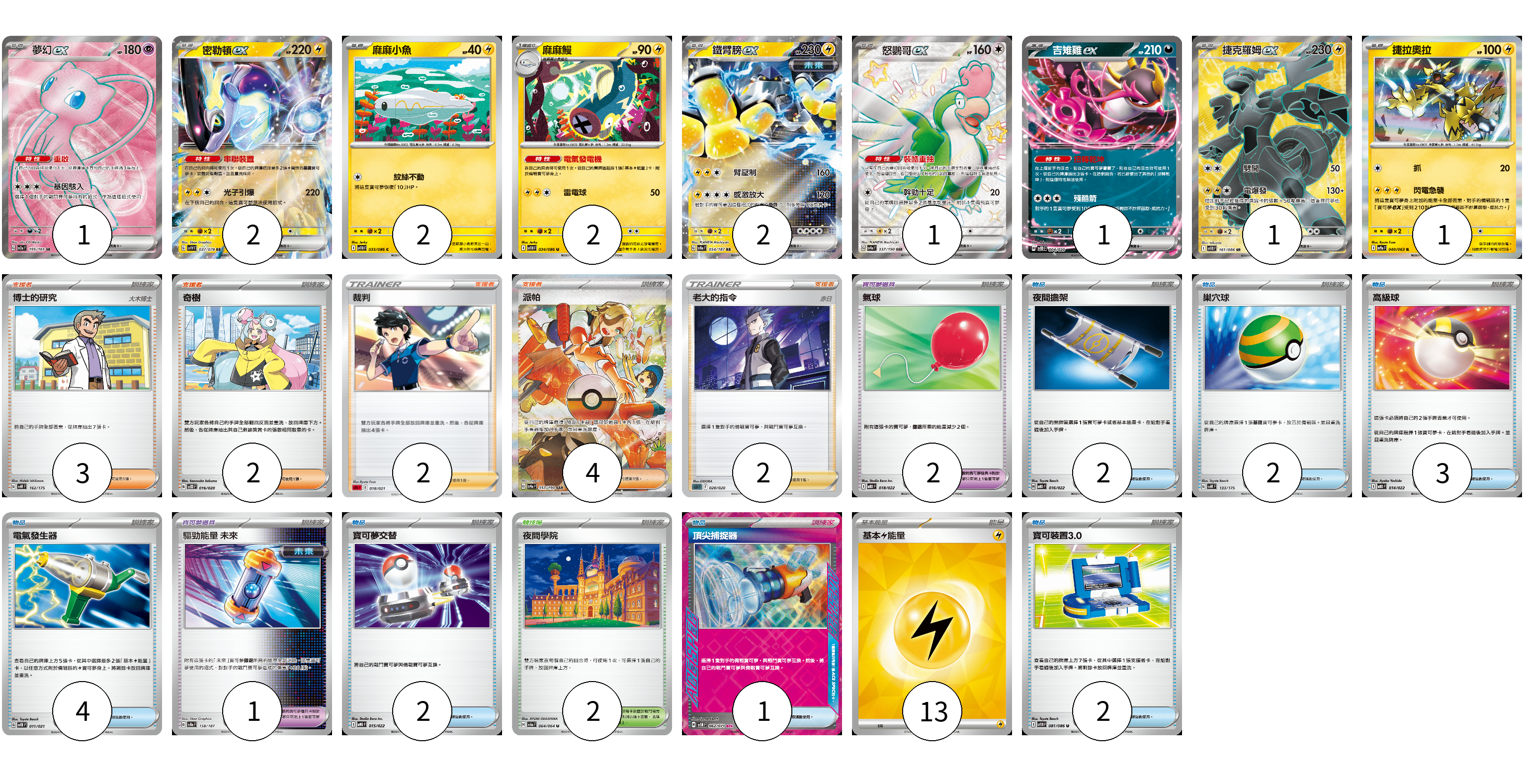 牌組構築方案 以此牌組為基礎新構築牌組 顯示卡面 顯示列表 寶可夢卡(13) 1 2 2 2 2 1 1 1 1 寶可夢道具(3) 2 1 物品卡(16) 2 2 3 4 2 1 2 支援者卡(13) 3 2 2 4 2 競技場卡(2) 2 能量卡(13) 13 寶可夢卡(13) 卡牌名稱 張數 卡牌名稱 張數 夢幻ex SV2a 195/165 01 密勒頓ex SV1V 037/078 02 麻麻小魚 SV11B 033/086 02 麻麻鰻 SV11B 034/086 02 鐵臂膀ex SV8a 054/187 02 怒鸚哥ex SV4a 337/190 01 吉雉雞ex SVOD 004/020 01 捷克羅姆ex SV11B 161/086 01 捷拉奧拉 SV9a 040/063 01 寶可夢道具(3) 卡牌名稱 張數 卡牌名稱 張數 氣球 MBD 018/022 02 驅勁能量 未來 SV8a 158/187 01 物品卡(16) 卡牌名稱 張數 卡牌名稱 張數 夜間擔架 MBD 016/022 02 巢穴球 SVM 133/175 02 高級球 MBD 014/022 03 電氣發生器 SVTR 011/021 04 寶可夢交替 MBG 015/022 02 頂尖捕捉器 SV5M 062/071 01 寶可裝置3.0 SV11B 081/086 02 支援者卡(13) 卡牌名稱 張數 卡牌名稱 張數 博士的研究 SVM 162/175 03 奇樹 SVOD 016/020 02 裁判 SDL 018/021 02 派帕 SV4a 353/190 04 老大的指令(赤日) SLD 020/020 02 競技場卡(2) 卡牌名稱 張數 卡牌名稱 張數 夜間學院 SV6a 064/064 02 能量卡(13) 卡牌名稱 張數 卡牌名稱 張數 基本【雷】能量 SVQP LIG 13 以此牌組為基礎新構築牌組 牌組編碼 mlUWWw-qEPVGv-nnALSk copy 列印牌組單 牌組編碼已複製 分享至SNS
