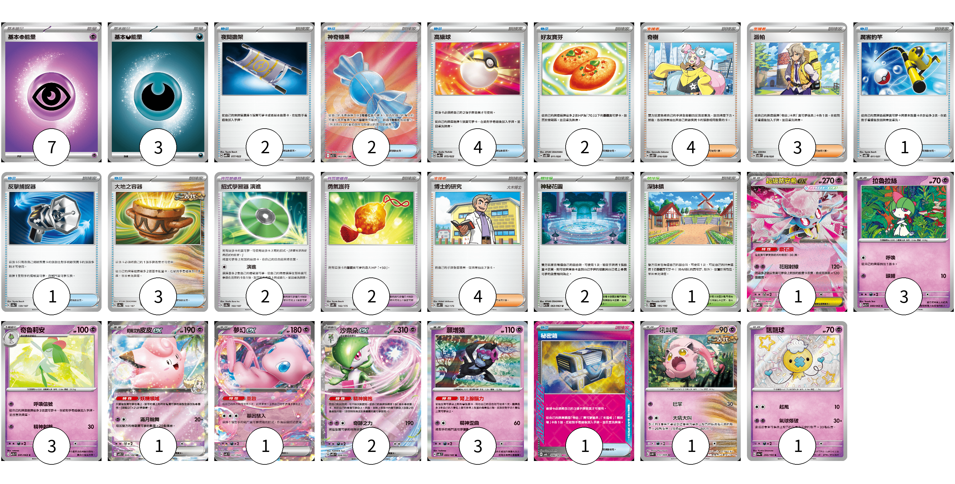 牌組構築方案 以此牌組為基礎新構築牌組 顯示卡面 顯示列表 寶可夢卡(16) 1 3 3 1 1 2 3 1 1 寶可夢道具(4) 2 2 物品卡(16) 2 2 4 2 1 1 3 1 支援者卡(11) 4 3 4 競技場卡(3) 2 1 能量卡(10) 7 3 寶可夢卡(16) 卡牌名稱 張數 卡牌名稱 張數 超級蒂安希ex MBD 006/022 01 拉魯拉絲 M1S 040/063 03 奇魯莉安 M1S 041/063 03 莉莉艾的皮皮ex SV9 033/100 01 夢幻ex SVK 001/042 01 沙奈朵ex SVTS 004/022 02 願增猿 SV6 055/101 03 吼叫尾 SV4K 032/066 01 飄飄球 SV4a 260/190 01 寶可夢道具(4) 卡牌名稱 張數 卡牌名稱 張數 招式學習器 演進 SV8a 160/187 02 勇氣護符 SVM 142/175 02 物品卡(16) 卡牌名稱 張數 卡牌名稱 張數 夜間擔架 MBG 017/022 02 神奇糖果 M1S 082/063 02 高級球 SVQL 015/022 04 好友寶芬 SVOD 011/020 02 厲害釣竿 SVOM 011/021 01 反擊捕捉器 SV8a 139/187 01 大地之容器 SV8a 143/187 03 秘密箱 SV6 092/101 01 支援者卡(11) 卡牌名稱 張數 卡牌名稱 張數 奇樹 SVOD 016/020 04 派帕 SVOD 018/020 03 博士的研究 SVM 162/175 04 競技場卡(3) 卡牌名稱 張數 卡牌名稱 張數 神秘花園 M1S 063/063 02 深缽鎮 SV4a 185/190 01 能量卡(10) 卡牌名稱 張數 卡牌名稱 張數 基本【超】能量 MBD PSY 07 基本【惡】能量 MBG DAR 03 以此牌組為基礎新構築牌組 牌組編碼 mnFSqh-JjcKdv-KRviLU copy 列印牌組單 牌組編碼已複製 分享至SNS