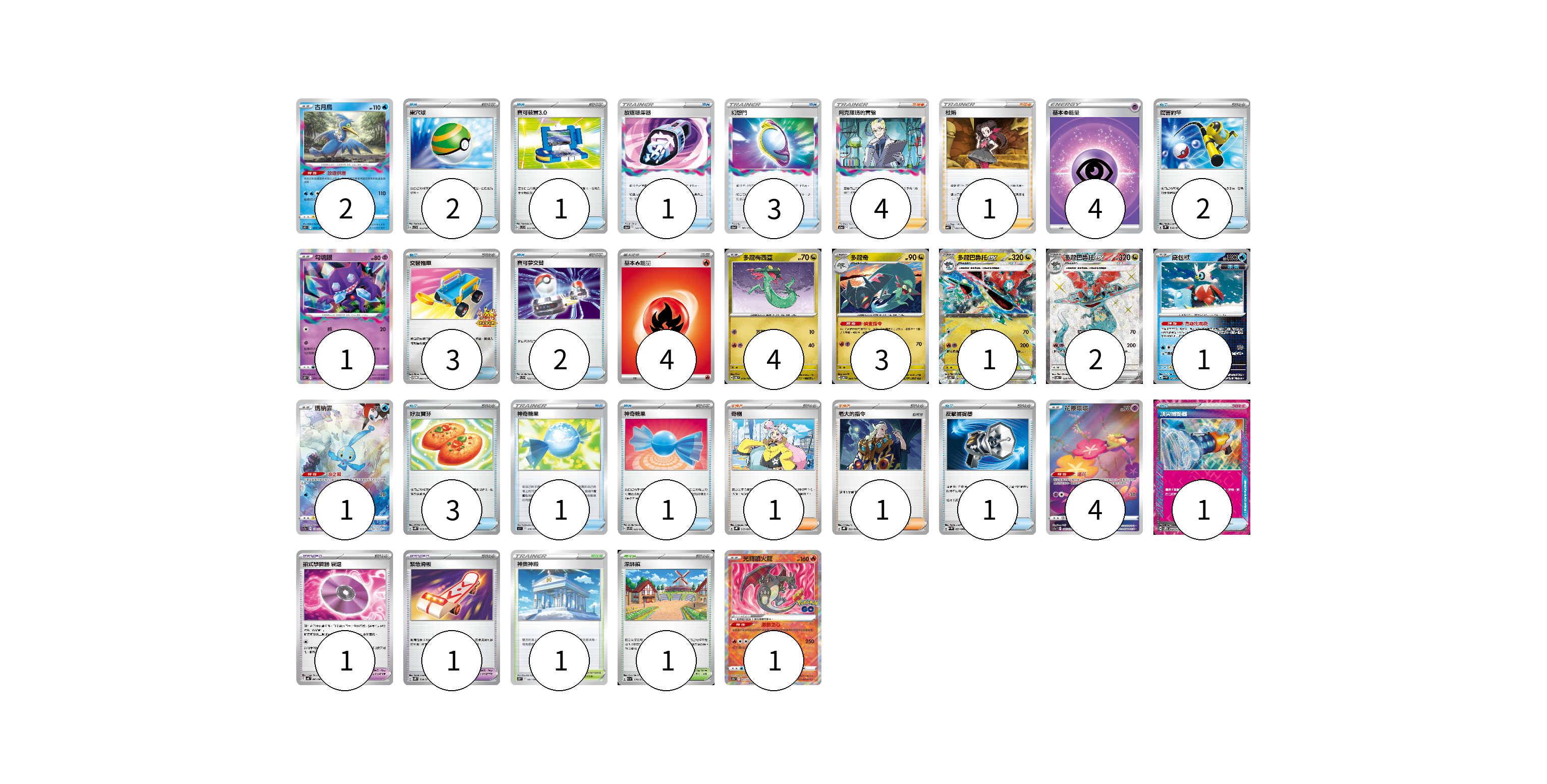 牌組構築方案 以此牌組為基礎新構築牌組 顯示卡面 顯示列表 寶可夢卡(20) 2 1 4 3 1 2 1 1 4 1 寶可夢道具(2) 1 1 物品卡(21) 2 1 1 3 2 3 2 3 1 1 1 1 支援者卡(7) 4 1 1 1 競技場卡(2) 1 1 能量卡(8) 4 4 寶可夢卡(20) 卡牌名稱 張數 卡牌名稱 張數 古月鳥 S11 033/100 02 勾魂眼 S11 044/100 01 多龍梅西亞 SV6 079/101 04 多龍奇 SV6 080/101 03 多龍巴魯托ex SV6 081/101 01 多龍巴魯托ex SV6 120/101 02 鐵包袱 SV4M 020/066 01 瑪納霏 S12a 178/172 01 花療環環 S12a 187/172 04 光輝噴火龍 S10b 011/071 01 寶可夢道具(2) 卡牌名稱 張數 卡牌名稱 張數 招式學習器 衰退 SV4K 063/066 01 緊急滑板 SV5K 064/071 01 物品卡(21) 卡牌名稱 張數 卡牌名稱 張數 巢穴球 SVC 013/021 02 寶可裝置3.0 SVC 015/021 01 放逐吸塵器 S12a 144/172 01 幻想門 S12a 141/172 03 厲害釣竿 SV2P 066/071 02 交替推車 SV-P 082/SV-P 03 寶可夢交替 SVD 122/139 02 好友寶芬 SV5K 063/071 03 神奇糖果 SI 376/414 01 神奇糖果 SVF 020/038 01 反擊捕捉器 SV4M 059/066 01 頂尖捕捉器 SV5M 062/071 01 支援者卡(7) 卡牌名稱 張數 卡牌名稱 張數 阿克羅瑪的實驗 S12a 148/172 04 杜娟 SVB 021/028 01 奇樹 SVHK 019/022 01 老大的指令 SVHK 022/022 01 競技場卡(2) 卡牌名稱 張數 卡牌名稱 張數 神奧神殿 S10P 067/067 01 深缽鎮 SV1a 070/073 01 能量卡(8) 卡牌名稱 張數 卡牌名稱 張數 基本【超】能量 SI PSY 04 基本【火】能量 SVHK FIR 04 以此牌組為基礎新構築牌組 牌組編碼 moLzJr-ZmhHmx-awbQxB copy 列印牌組單 牌組編碼已複製 分享至SNS