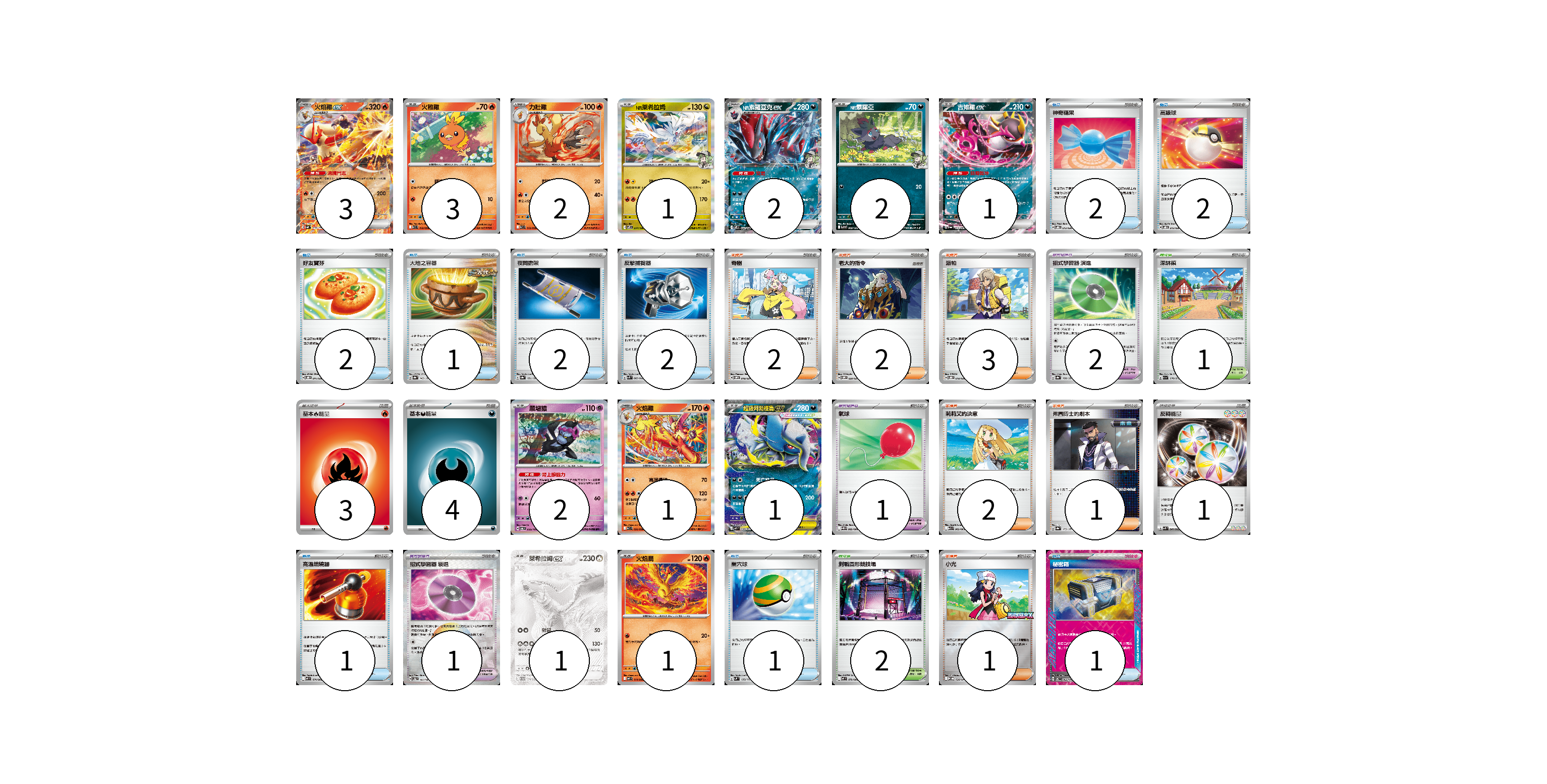 牌組構築方案 以此牌組為基礎新構築牌組 顯示卡面 顯示列表 寶可夢卡(20) 3 3 2 1 2 2 1 2 1 1 1 1 寶可夢道具(4) 2 1 1 物品卡(14) 2 2 2 1 2 2 1 1 1 支援者卡(11) 2 2 3 2 1 1 競技場卡(3) 1 2 能量卡(8) 3 4 1 寶可夢卡(20) 卡牌名稱 張數 卡牌名稱 張數 火焰雞ex SVM 016/175 03 火稚雞 SV10 018/098 03 力壯雞 SV10 019/098 02 N的萊希拉姆 SV9 074/100 01 N的索羅亞克ex SV9 061/100 02 N的索羅亞 SV9 060/100 02 吉雉雞ex SV6a 038/064 01 願增猿 SV6 055/101 02 火焰雞 SV10 020/098 01 超級阿勃梭魯ex M1L 038/063 01 萊希拉姆ex SV11W 174/086 01 火焰鳥 M2 014/080 01 寶可夢道具(4) 卡牌名稱 張數 卡牌名稱 張數 招式學習器 演進 SV8a 160/187 02 氣球 SV11B 082/086 01 招式學習器 衰退 SV8a 161/187 01 物品卡(14) 卡牌名稱 張數 卡牌名稱 張數 神奇糖果 SVOD 013/020 02 高級球 SVOD 012/020 02 好友寶芬 SVOD 011/020 02 大地之容器 SV8a 143/187 01 夜間擔架 SV8a 151/187 02 反擊捕捉器 SVK 009/042 02 高溫燃燒器 M2 074/080 01 巢穴球 SVM 133/175 01 秘密箱 SV6 092/101 01 支援者卡(11) 卡牌名稱 張數 卡牌名稱 張數 奇樹 SVOM 018/021 02 老大的指令 SVOM 020/021 02 派帕 SVOD 018/020 03 莉莉艾的決意 M1L 062/063 02 弗圖博士的劇本 SV8a 175/187 01 小光 M-P 028/M-P 01 競技場卡(3) 卡牌名稱 張數 卡牌名稱 張數 深缽鎮 SV1a 070/073 01 對戰圓形競技場 M2 079/080 02 能量卡(8) 卡牌名稱 張數 卡牌名稱 張數 基本【火】能量 SVTL FIR 03 基本【惡】能量 SVF DAR 04 反轉能量 SVK 041/042 01 以此牌組為基礎新構築牌組 牌組編碼 mrFXEl-ZFhcyC-Voucmh copy 列印牌組單 牌組編碼已複製 分享至SNS